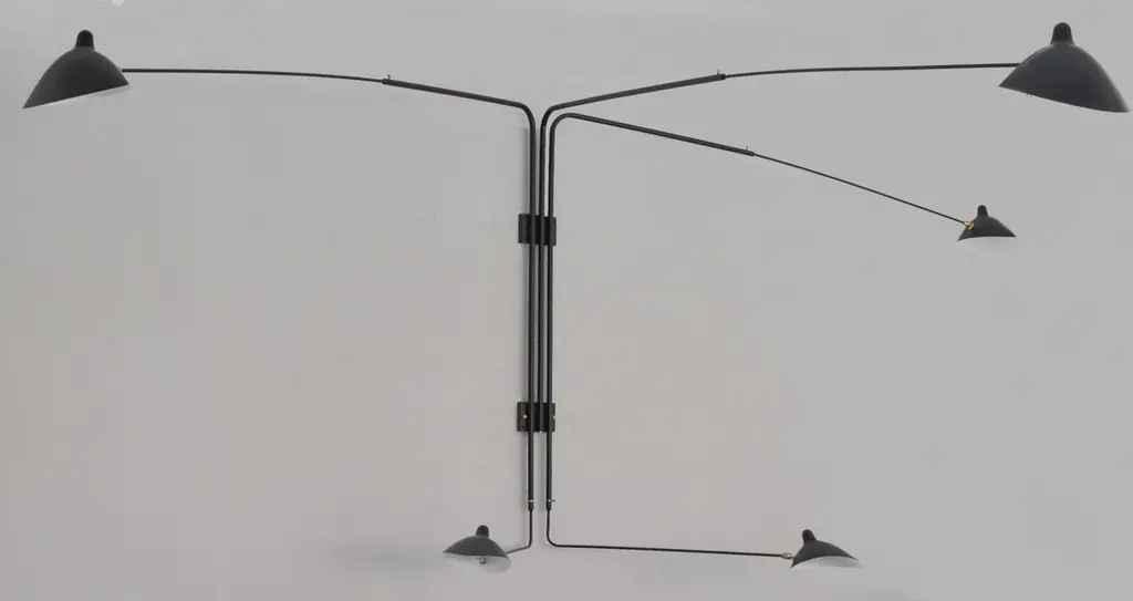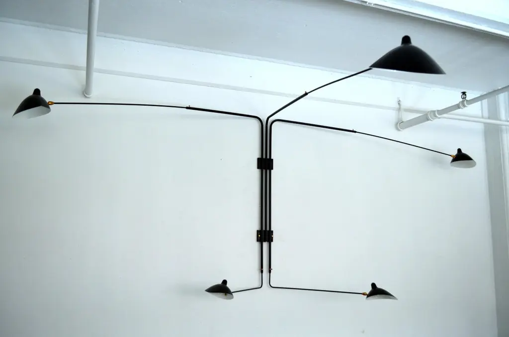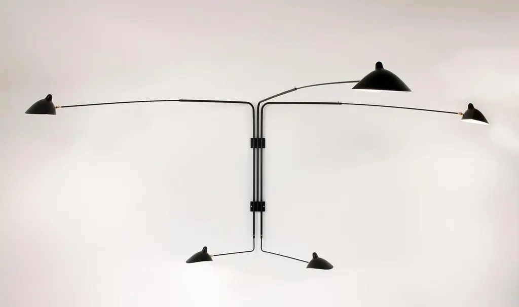 A larger sconce with two identical long arms and three shorter arms of varying lengths, this lamp can illuminate a large area of a wall or room. Each lamp head rotates and tilts.Available in white or black with brass fittings.COLOR OPTIONAvailable in Black or WhiteFEATURES3 Upper arms and 2 lower arms independently rotate from wall to wall without ever touching it, however the 3 upper arms rotate on the same plan. Same goes with the 2 lower arms. Arms are not telescopic, the upper thinner arms do not slide in the upper thicker arms. This lamp will be the center of attention.3 "Chapeau" (Hat) shades on top and 2 "Casquette" (Cap) shade rotate and swivel.CUSTOMIZATIONCustomization possible for the dimension between the upper and lower arms as well as for arm's lengths. Arm length = from wall to the tip of the shade.SWITCH OPTIONSThe Rotating Wall Fixture with 5 Arms is hardwired. The light bulbs can be controled together from the wall switch or independently with 2 switches (1 for the 3 upper arms, 1 for the 2 lower arms) installed on the mounting plate.Best fit dimmable LED bulbs providedWHAT SETS US APART? - Technical expertise - Full line of products - Availability - Customization - 5 year guarantee - Secured shipment - Small Repairs - After sale service - Experience (we introduced these lamps to the US, 22 years ago).WHAT TO LOOK OUT FOR:International shipping is expensive, lengthy and somewhat risky, potentially a stressful experience - Expensive: Most Mouille lamps are shipped in very large boxes. Shipping costs are calculated based on the volume of the box, Add this to Customs duties, insurance and US entry fee, and the final price will be approximately 25% more than your final net price. - Lengthy: Your lamp should be shipped by plane which takes about 8 to 9 hours flying from Europe to New York. Transportation is still deeply affected by the pandemic’s disruptions. - Damages: Individual boxes traveling next to heavier bundled goods typical of int’l shipping are more prone to damages. HOW WE DO IT:No need to go through all this, we’ve done this part. The lamps are sold from NY, ready to ship to you for your peace of mind. We thoroughly inspect them with our 44 check points before shipping, which gives us the confidence to offer a 5-year guarantee to our clients.