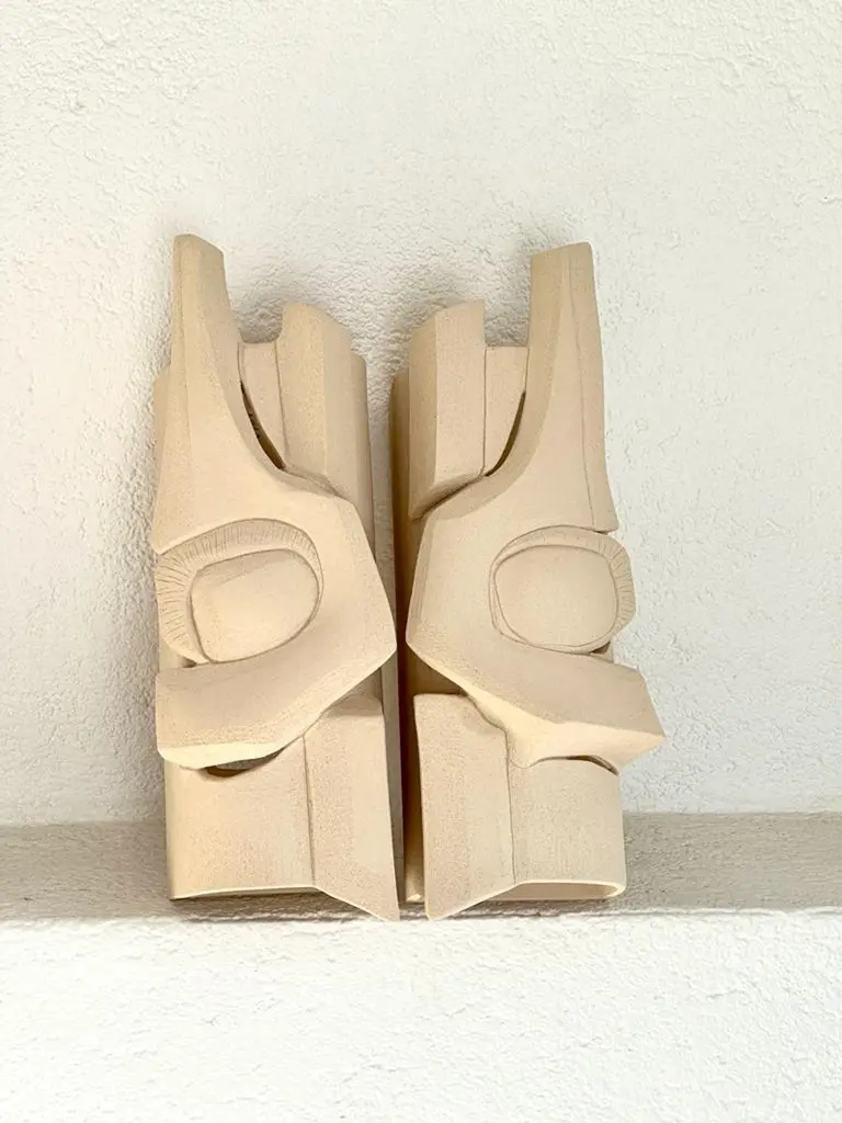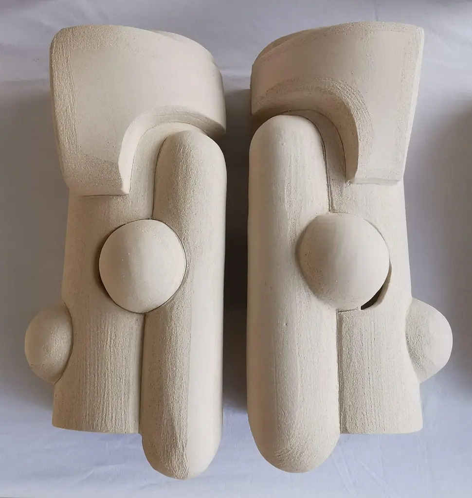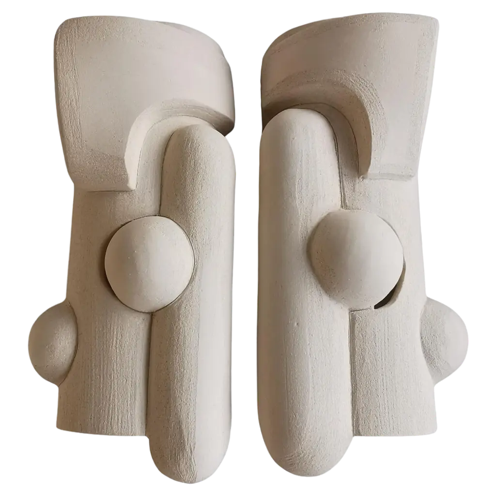 Set of 2 Bas Relief Sconces by Olivia CognetDimensions: W 28 x D 25 x H 55 cmMaterials: Ceramic.Each of Olivia’s handmade creations is a unique work of art, the snapshot of a precious moment captured in a world of fast ‘everything’.Since moving to Los Angeles in 2016, French artist and designer Olivia Cognet has focused on ceramics as the fertile medium through which she expresses her boundless creativity.With the freedom this material affords to explore every type of shape and size, she creates monumental bas-reliefs and giant totems as well as chairs, tables, lamps and vases.These unique pieces, handmade by the artist in her studio, all share the same high aesthetic, abstract and graphic standards. She draws inspiration from the lights and shadows of the landscapes of California, its modernist architecture and intense nature.Infusing a modern take on the great tradition of decorative arts, her works are both functional and powerfully evocative.Olivia Cognet grew up in Nice on the Côte d’Azur, studied at the Villa Arson and was nourished by the brilliant masters from the school of Vallauris, from Picasso to Roger Capron; for her, ceramics are a key element of architecture.She starts by exploring ideas on paper, before moving to stoneware, using a local clay that comes in three natural shades. Her designs showcase the power of contrasts; her minimal, geometric lines are interwoven with a sensual and organic vocabulary.The austere aesthetic of rough clay is heightened by the elegance of the crackle glazes, which generate singular effects.Elsewhere, ethereal excrescences defy the laws of gravity.Day after day, guided by her intuition, Olivia Cognet reinvents the poetic experience of creation, fashioning work through the purity of the material. This is the magic of the artisan, combined with the promise of vibrant beauty, to enhance everyday life.Marion Vignal.