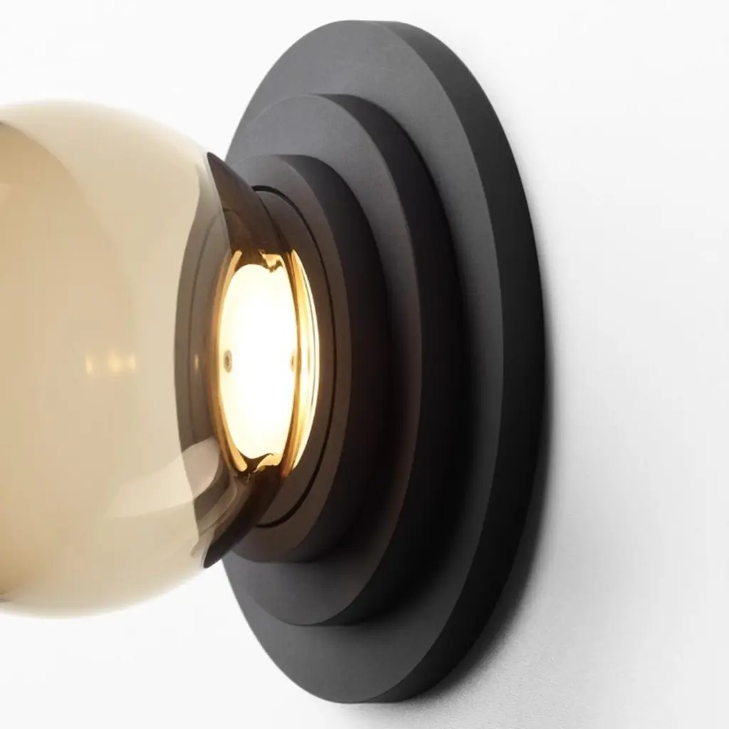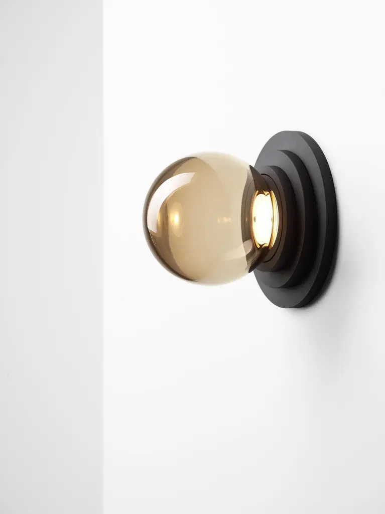 Set Of 2 Black Stratos Mini Ball Wall Light by Dechem StudioDimensions: D 12 x H 14 cmMaterials: Aluminum, Glass.Also Available: Different colours available,Different shapes of capsules and spheres contrast with anodized alloy fixtures, creating a surprising architectural element. The luminaires are available in various colours including crystal clear, smoke grey, alabaster white, pink, green and orange.Glass, just like people or trees, is perfectly capable of being shaped and formed. One can imprint just about anything into it, give it a form, capture a passing moment, breath a new life into it. Later it stiffens and freezes like a petrified fossil, like magma, like a witness. No one can move it. It is solid as a rock and if you urge it, it rather shatters into pieces than to surrender.We are DECHEM.We are Michaela and Jakub, designers and storytellers in Bohemian glass. Our work is based on contemporary design combined with a mastery of production and a healthy respect for old Central European Craft and traditions.We design, produce and sell our collections of lights and decorative glass products. We produce unique light fixtures made from a combination of mouth-blown glass and handcrafted brass. Our glamorous chandeliers light up any space with a playful yet elegant appearance.A significant component of our work is blowing glass into a colour gradient. The wide range of fresh gradient colours is a distinctive feature of the Bandaska vase from our collection. It draws inspiration from traditional milk containers, well-known in Czech village households, and their elegant lines are now coming into modern homes in the form of our glass vases and lights.In addition to our normal production, we love to devise bespoke luminous objects for interiors. They arise from experimenting with unconventional materials and unusual combinations.Along with our own work, we like to be part of special collaborations and exhibitions. We have collaborated with renowned galleries and institutions, and curated and exhibited projects in Milano, London, Frankfurt, Istanbul and several other cities around the world.All of our creations are manufactured with care in Czech workshops using unique methods, including hand-blowing, snapping, cutting, grinding, firing, engraving and glass painting.We founded DECHEM studio in Prague in 2012 as partners in both work and life after years of studying glass Craft and design, and we have grown it into a renowned and award-winning design studio.