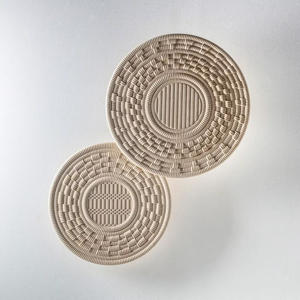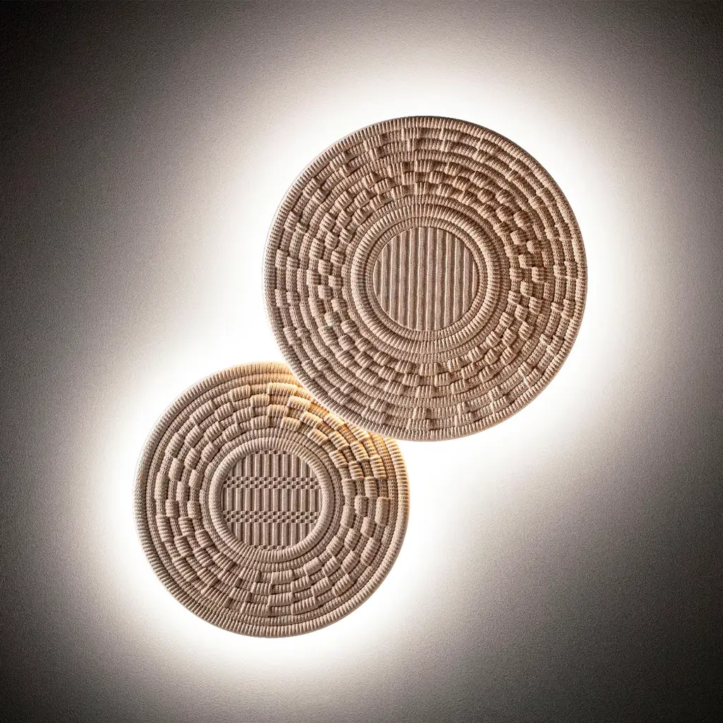 The set of two different Còrbulas wall lamps (diameter: 60 and 70 cm) are made by intertwining lengths of hay and cane fibers, embellished with brightly colored brocade and wool inserts that create simple geometric or local flora and fauna inspired decorations. In the olden days, in Sardinia, they decorated farmers’ houses by hanging groups of baskets together on the walls. This project uses this secondary use as its subject.