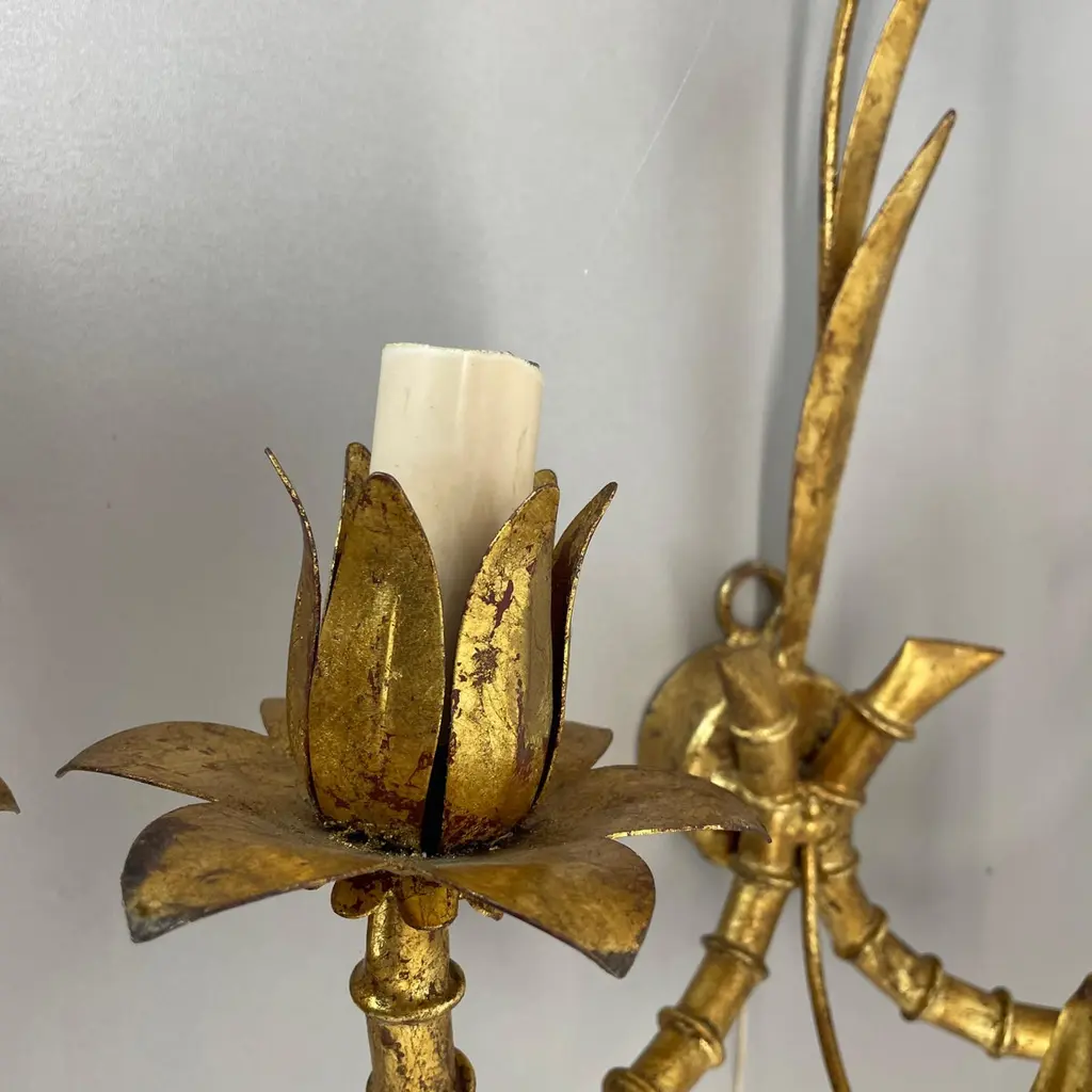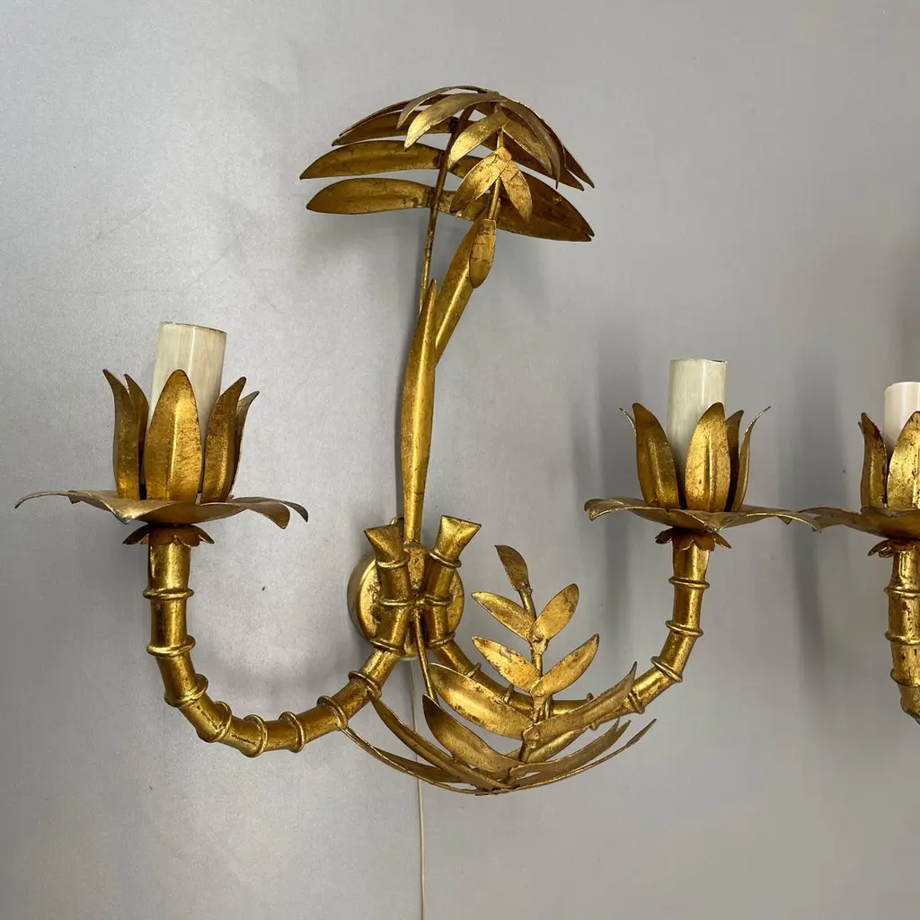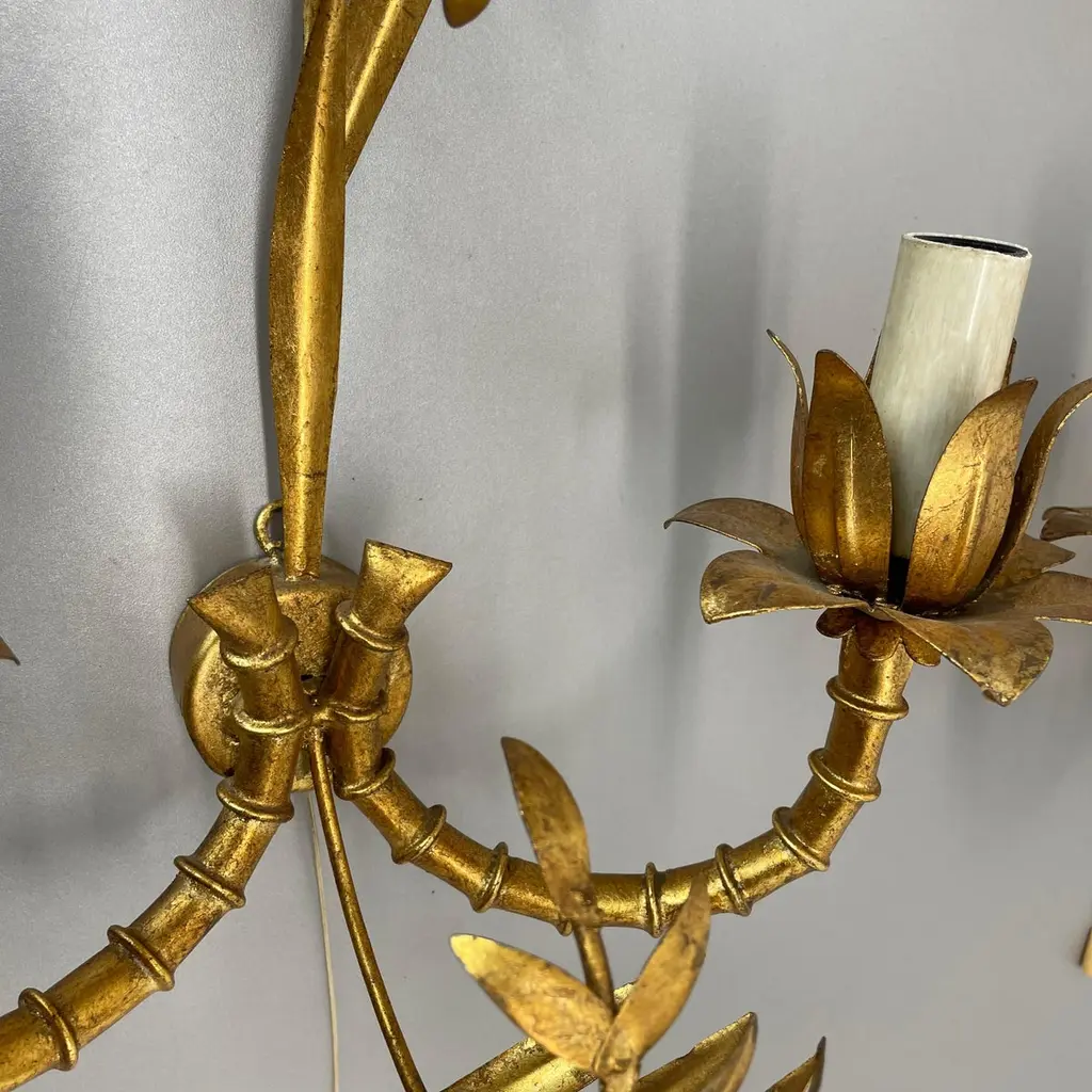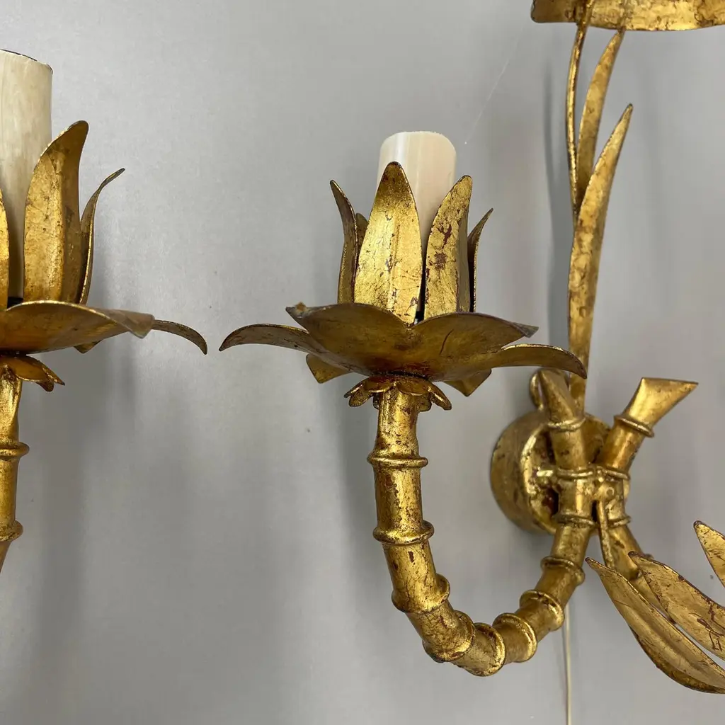 Set Of 2 Hollywood Regency Golden Florentiner Tiki Style Wall Lights, Italy 1970