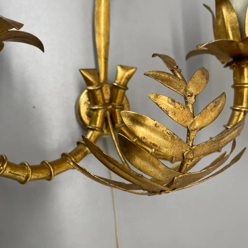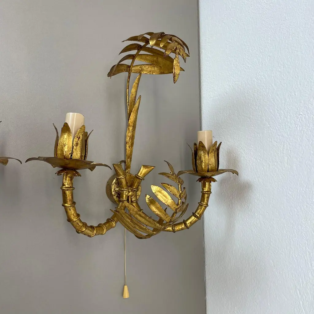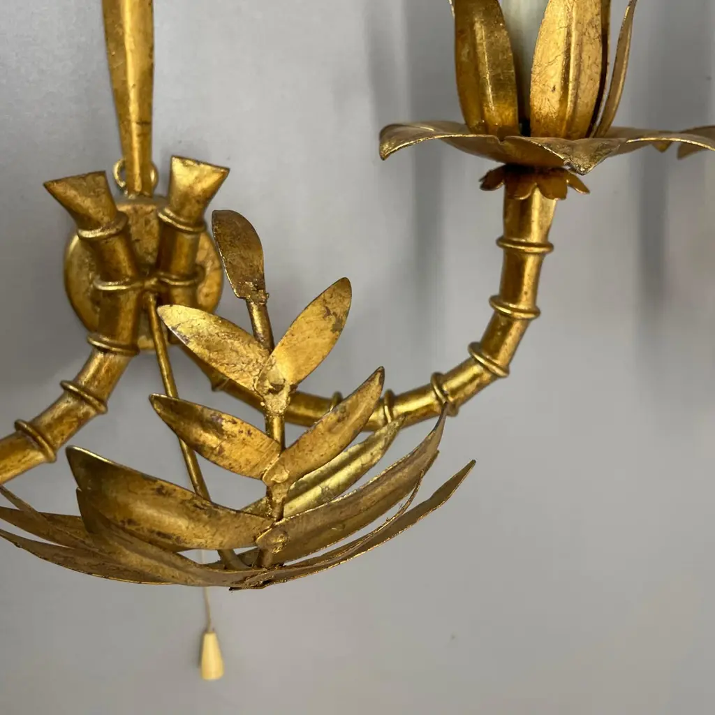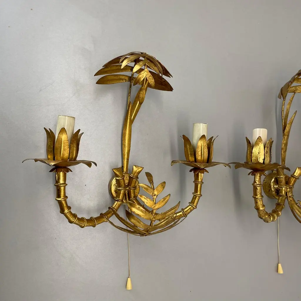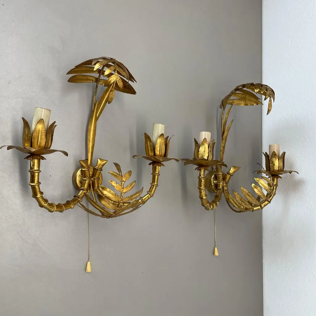 Article:Wall light, set of 2Origin:ItalyAge:1970.This modernist light set was produced in Italy in the 1980s . It is made from gilded metal and has floral tree structure with leafes and bamboo optic parts The metal of this light has a gold tone lacquer finish. each of this wonderful and rare light two three for sockets e 14 light bulbs. the light remember of the typical Hollywood Regency design in gold tone and TIKI Style. each light has a pull down switch element with a cord.the lights strictly remembers in design of KÖGL lights of the 1970s and 1980s.The light remains in a good all original vintage condition due to the age with normal metal surface patina and slight traces of use. The light is in full working condition.Dimensions:Height 30cm.Depth 17cm.Length 35cmCondition:The light remains in a good all original vintage condition due to the age with normal metal surface patina and slight traces of use. The light is in full working condition.