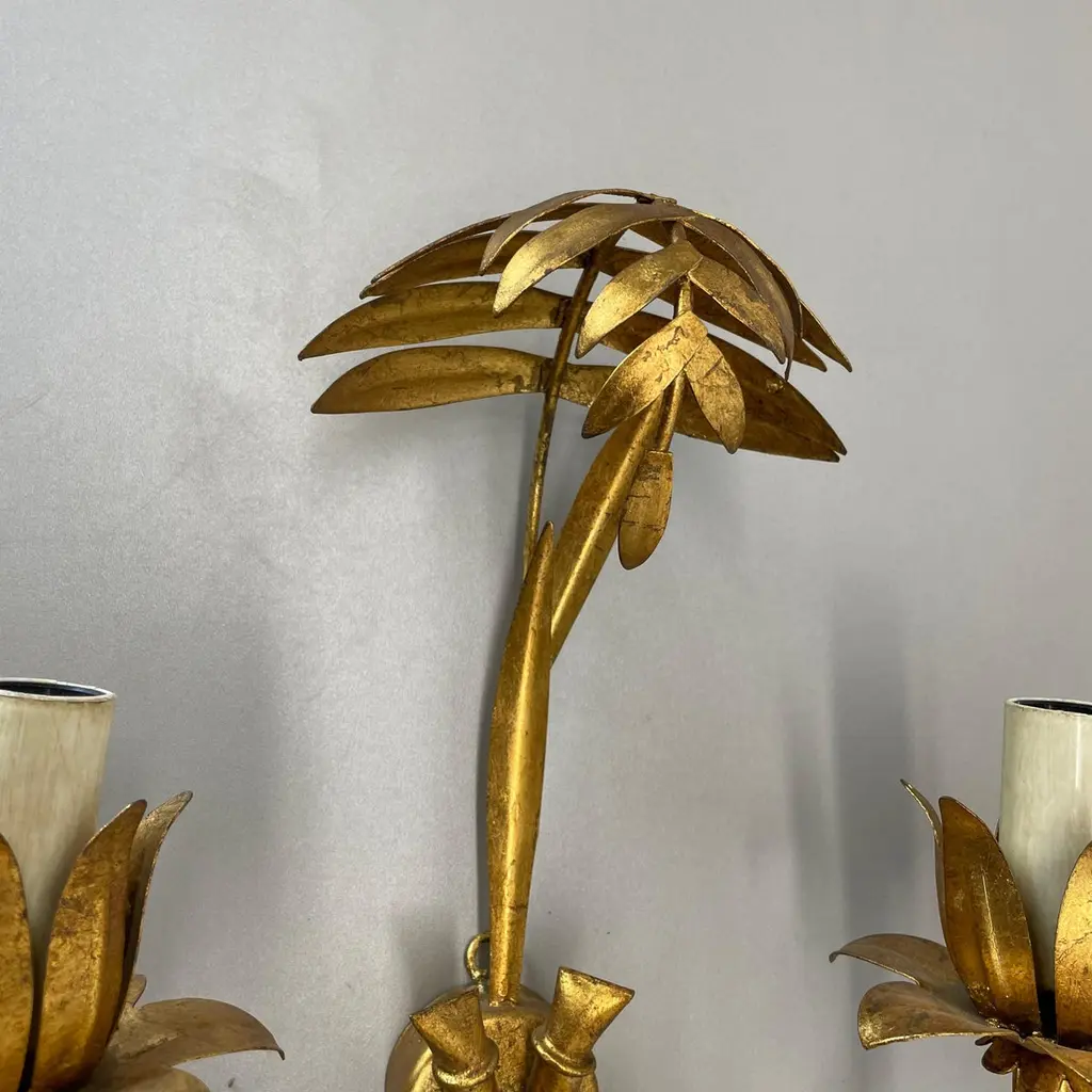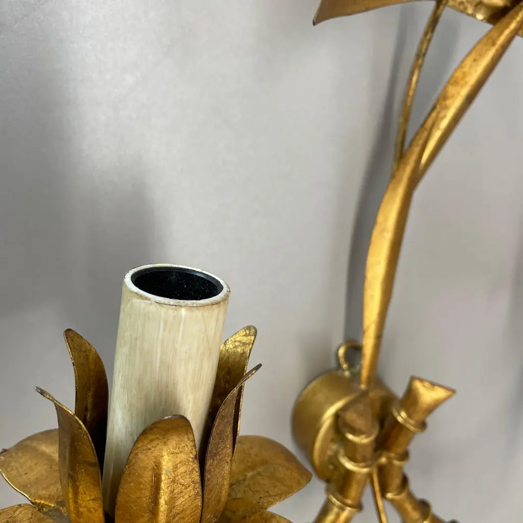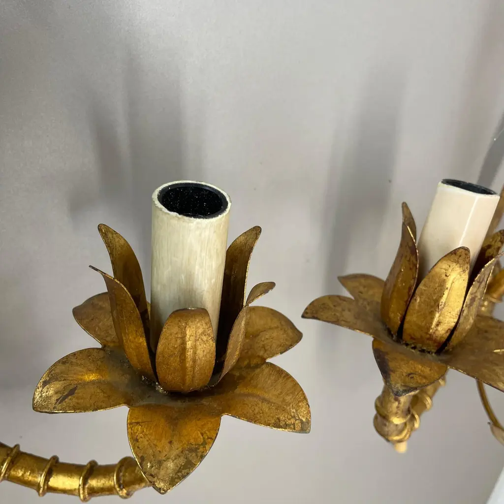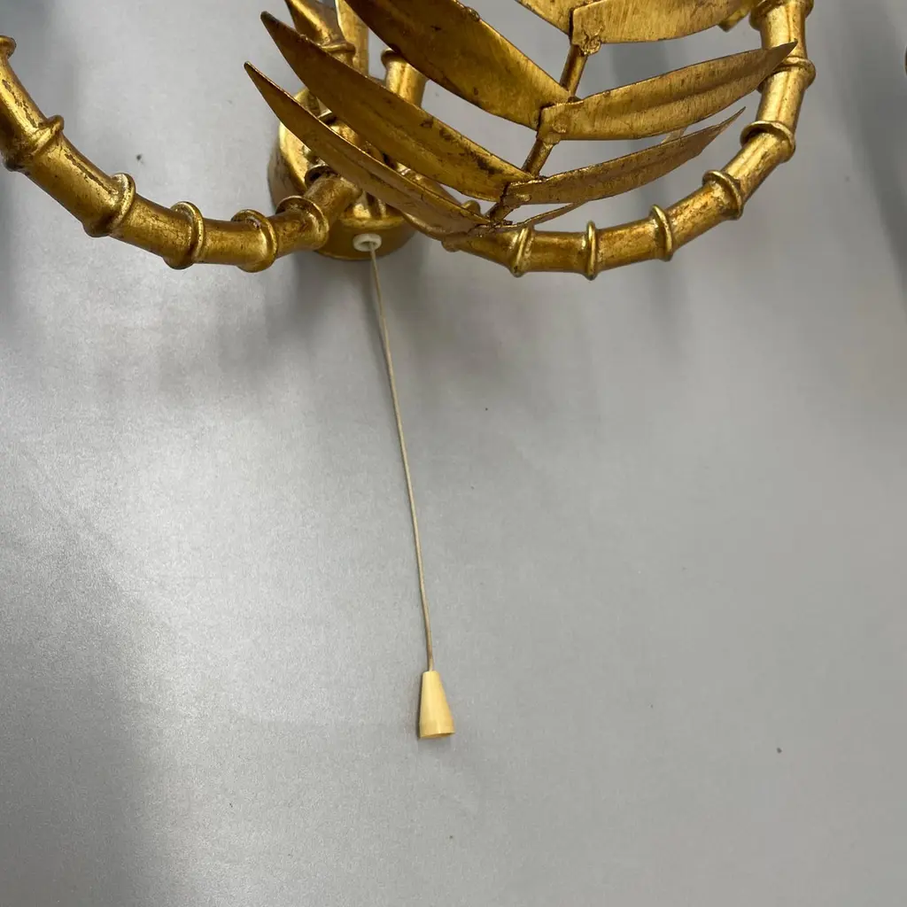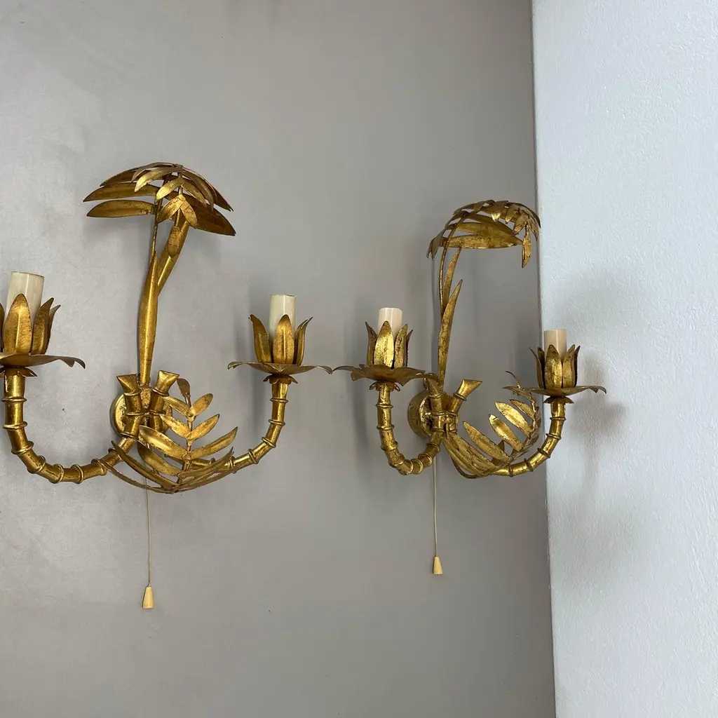 Article:Wall light, set of 2Origin:ItalyAge:1970.This modernist light set was produced in Italy in the 1980s . It is made from gilded metal and has floral tree structure with leafes and bamboo optic parts The metal of this light has a gold tone lacquer finish. each of this wonderful and rare light two three for sockets e 14 light bulbs. the light remember of the typical Hollywood Regency design in gold tone and TIKI Style. each light has a pull down switch element with a cord.the lights strictly remembers in design of KÖGL lights of the 1970s and 1980s.The light remains in a good all original vintage condition due to the age with normal metal surface patina and slight traces of use. The light is in full working condition.Dimensions:Height 30cm.Depth 17cm.Length 35cmCondition:The light remains in a good all original vintage condition due to the age with normal metal surface patina and slight traces of use. The light is in full working condition.