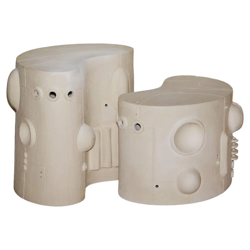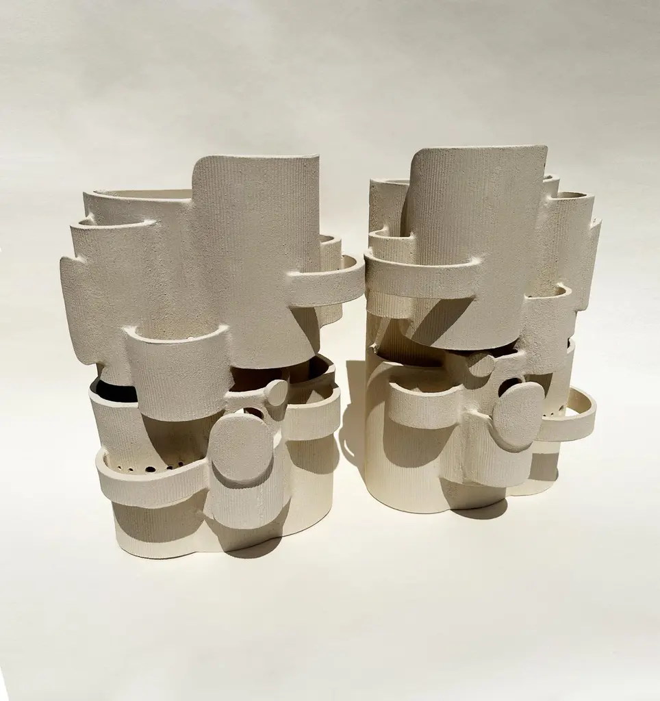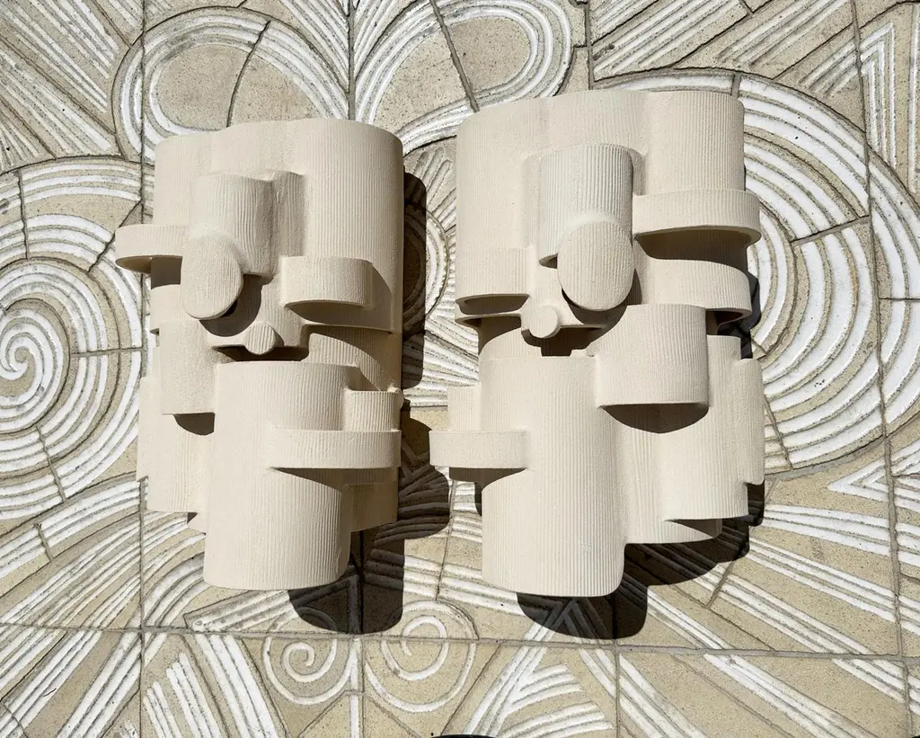 Set of 2 Sconces Bridge Wall Lamps by Olivia CognetDimensions: W 50 x D 25 x H 35 cmMaterials: Ceramic.Non electrified.Each of Olivia’s handmade creations is a unique work of art, the snapshot of a precious moment captured in a world of fast ‘everything’.Since moving to Los Angeles in 2016, French artist and designer Olivia Cognet has focused on ceramics as the fertile medium through which she expresses her boundless creativity.With the freedom this material affords to explore every type of shape and size, she creates monumental bas-reliefs and giant totems as well as chairs, tables, lamps and vases.These unique pieces, handmade by the artist in her studio, all share the same high aesthetic, abstract and graphic standards. She draws inspiration from the lights and shadows of the landscapes of California, its modernist architecture and intense nature.Infusing a modern take on the great tradition of decorative arts, her works are both functional and powerfully evocative.Olivia Cognet grew up in Nice on the Côte d’Azur, studied at the Villa Arson and was nourished by the brilliant masters from the school of Vallauris, from Picasso to Roger Capron; for her, ceramics are a key element of architecture.She starts by exploring ideas on paper, before moving to stoneware, using a local clay that comes in three natural shades. Her designs showcase the power of contrasts; her minimal, geometric lines are interwoven with a sensual and organic vocabulary.The austere aesthetic of rough clay is heightened by the elegance of the crackle glazes, which generate singular effects.Elsewhere, ethereal excrescences defy the laws of gravity.Day after day, guided by her intuition, Olivia Cognet reinvents the poetic experience of creation, fashioning work through the purity of the material. This is the magic of the artisan, combined with the promise of vibrant beauty, to enhance everyday life.Marion Vignal.All our lamps can be wired according to each country. If sold to the USA it will be wired for the USA for instance.