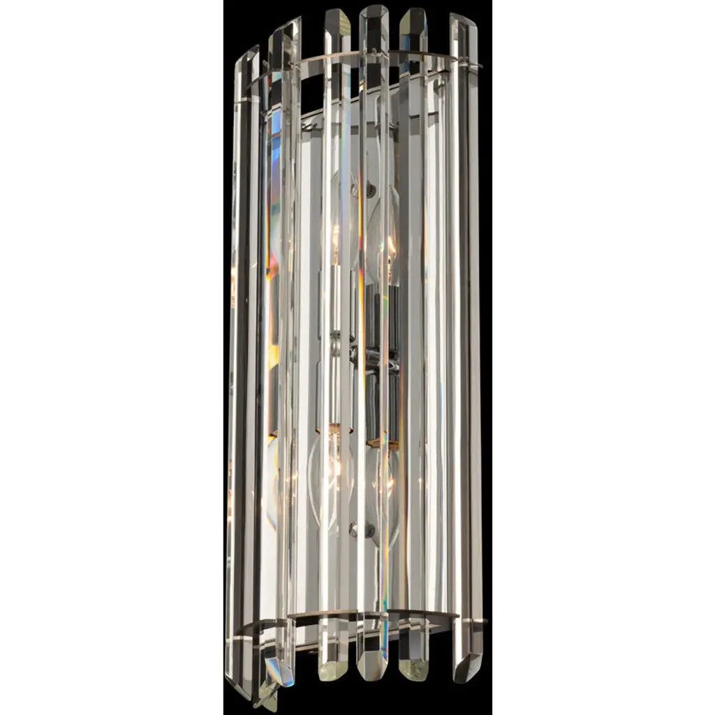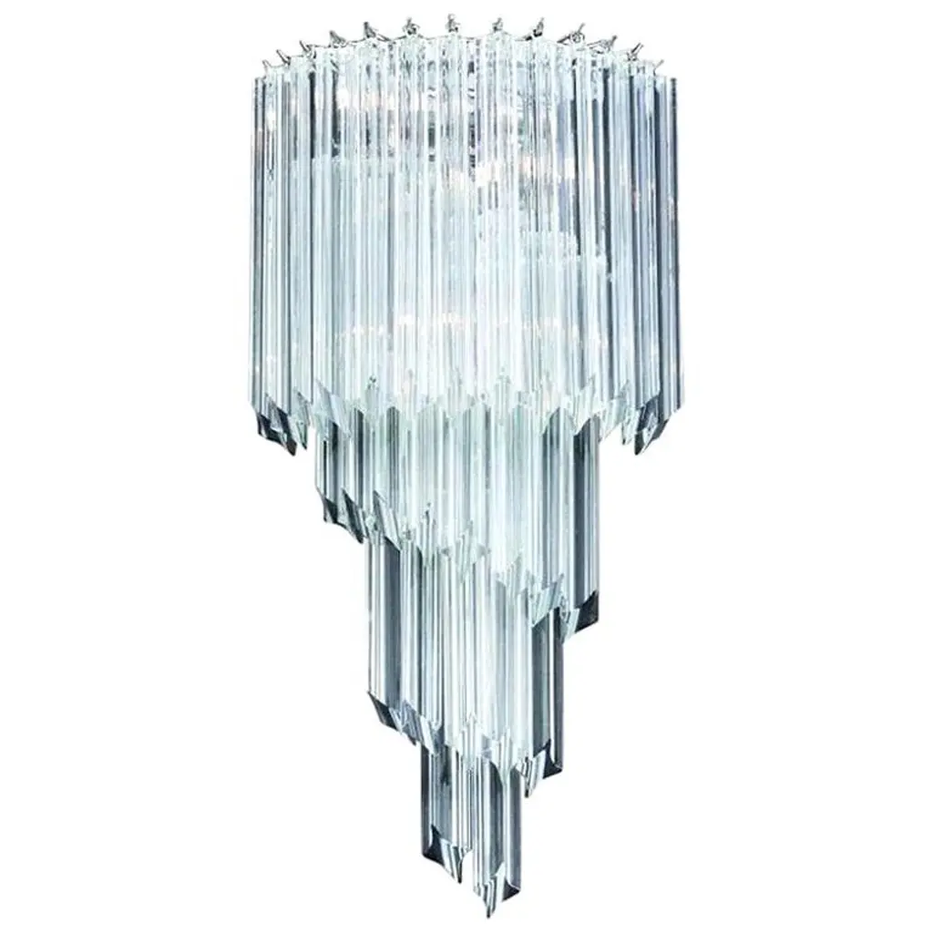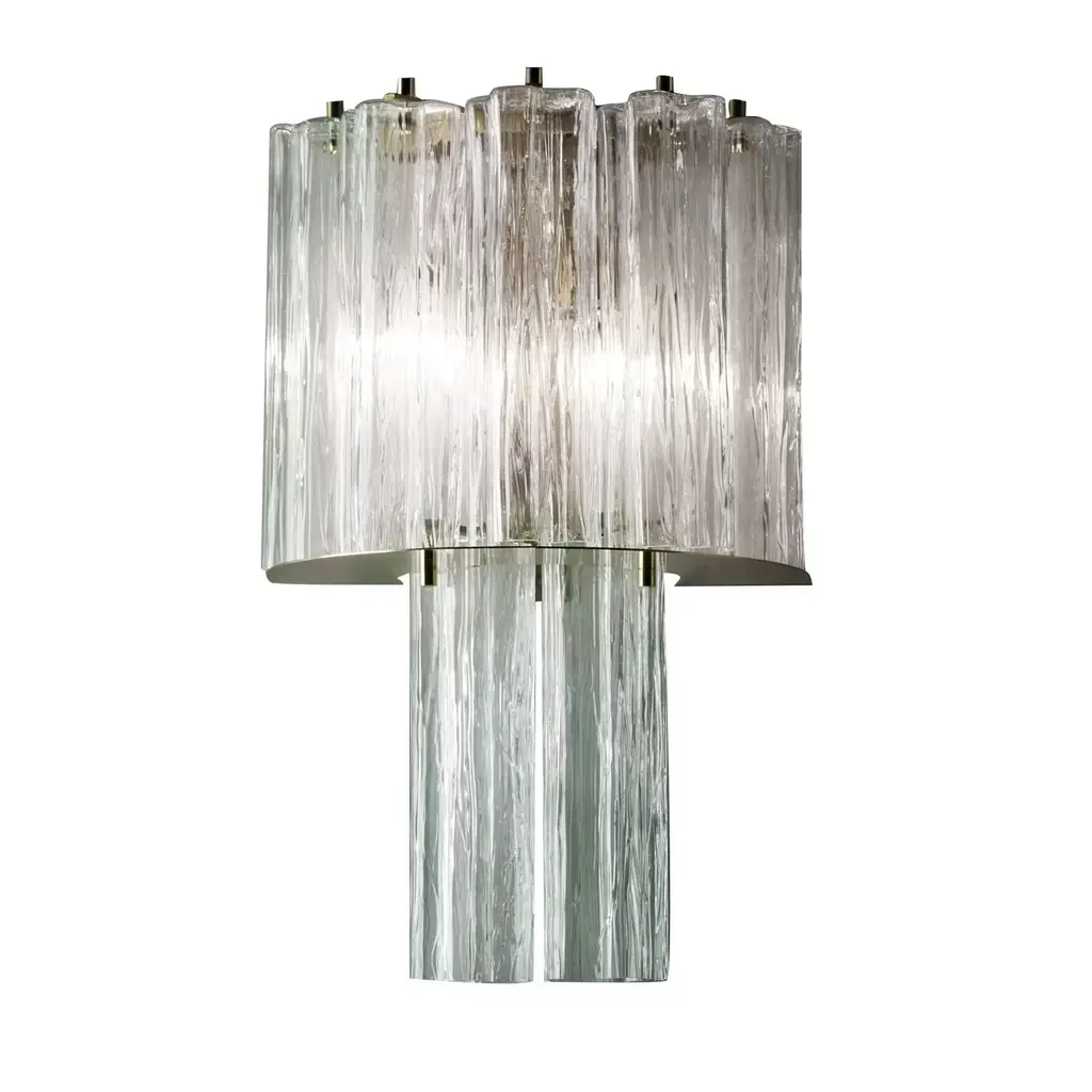 The effortless elegance of streamlined volumes and the sublime charm of clear Murano glass merge in this exclusive set of two artisan sconces. Featuring a frame in nickel-finished brass, the shading elements consist of eight glass sticks filtering the light emitted by three E27 lightbulbs (LED also available upon request). Due to the artisan manufacturing process, each piece showcases singular, unrepeatable details.