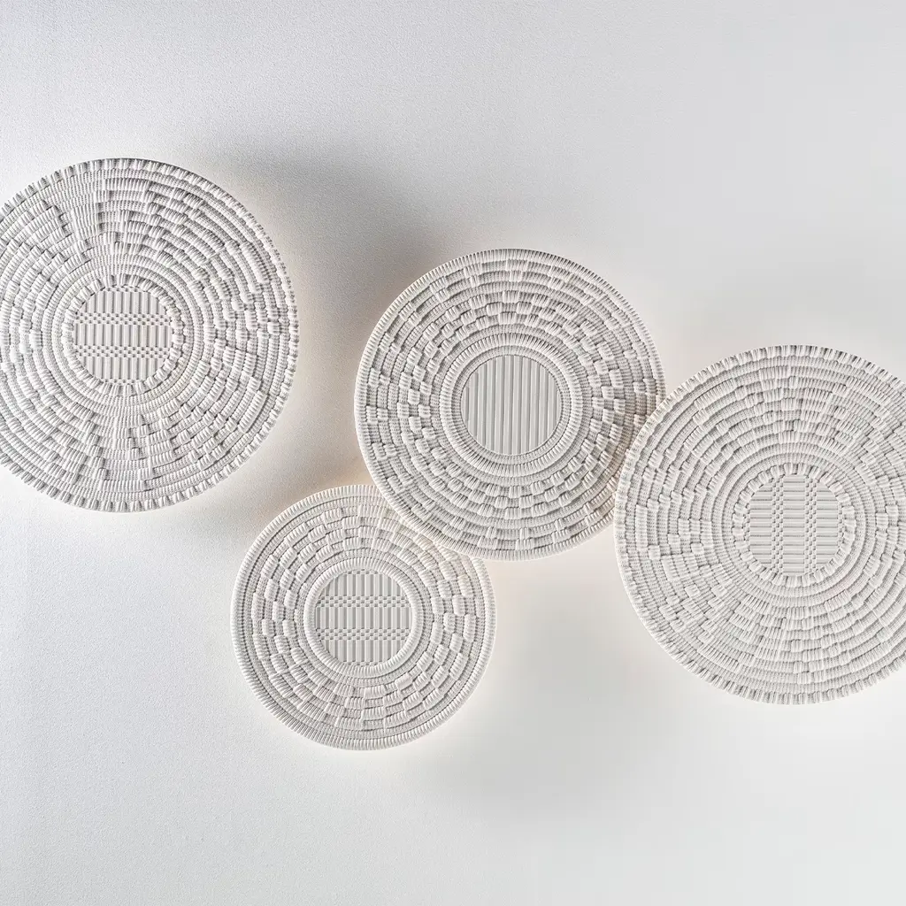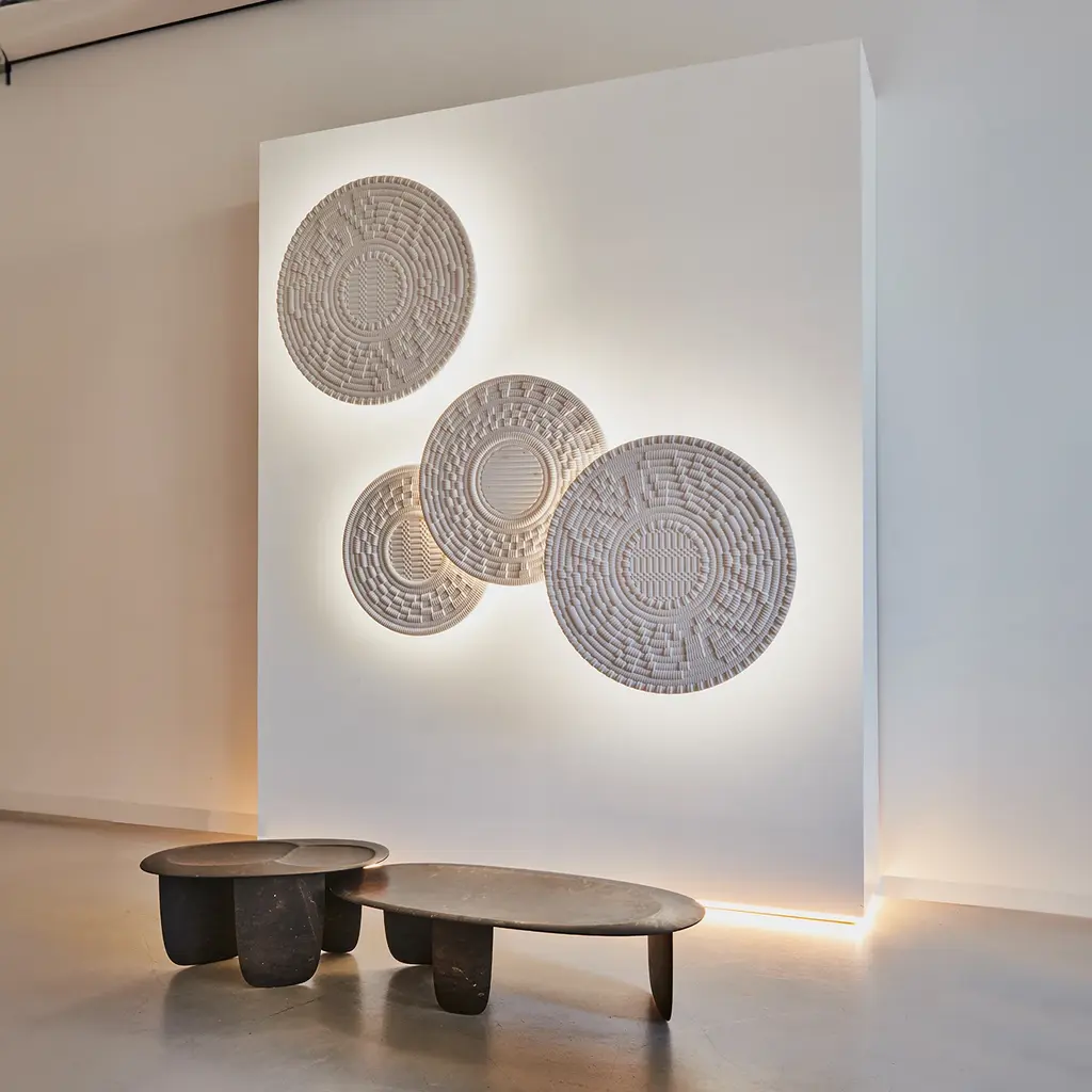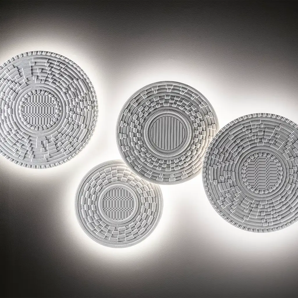 In Sardinia, on the plains of Campidano, the round baskets, usually deep and wide, used to hold and measure flour and which women used to carry around balanced on their heads are called Corbulas. The set of four different Còrbulas wall lamps are made in Bianco Diocleziano marble. In the olden days they would decorate farmers’ houses by hanging groups of baskets together on the walls. This project uses this secondary use as its subject, highlighting the bottom section of the basket, which is its most elaborate part and to which a striking halo of light has been added. This item has been part of the exhibition MARMO on display at Artemest Galleria until May 2023.