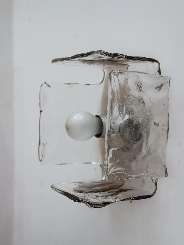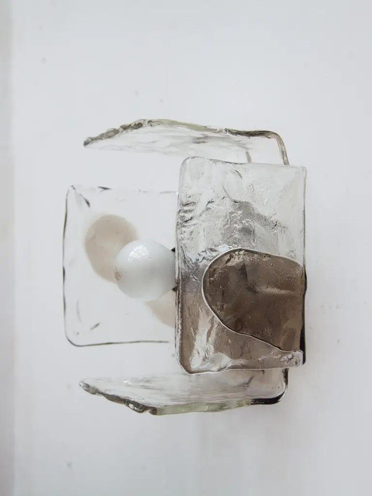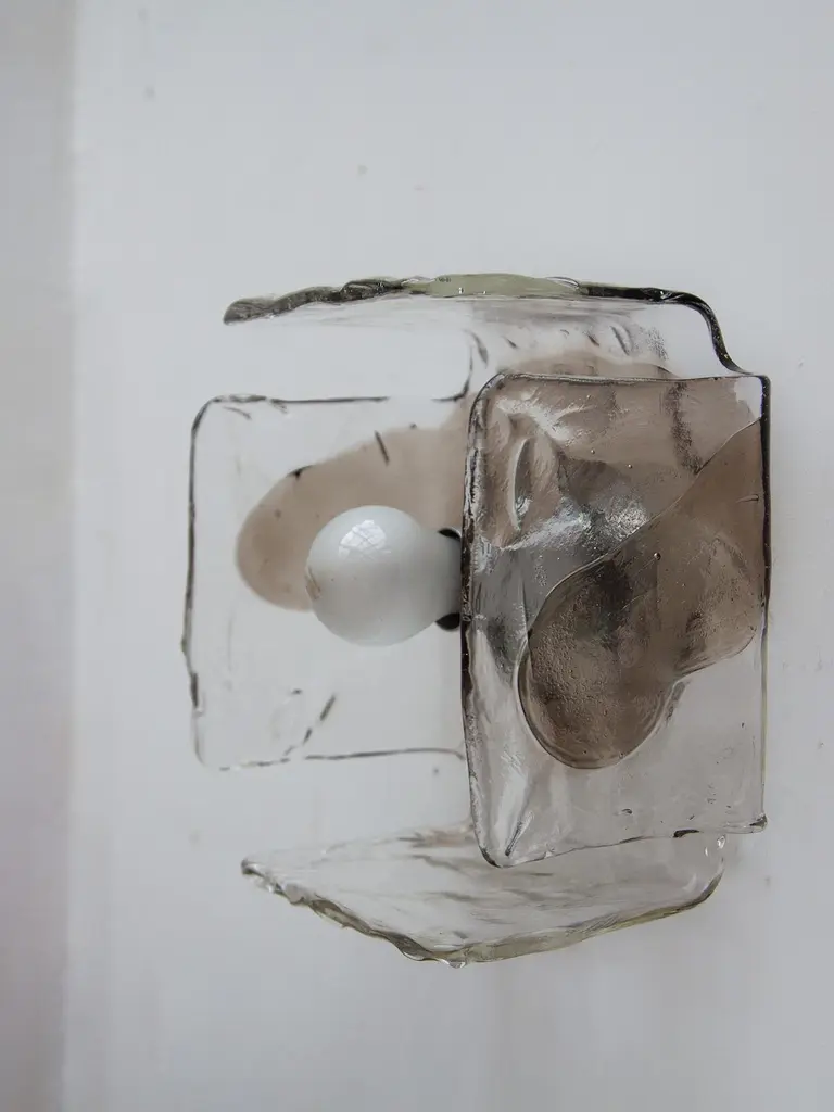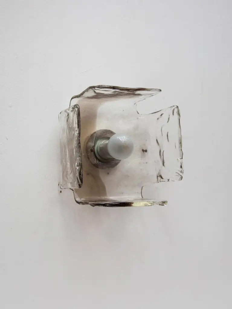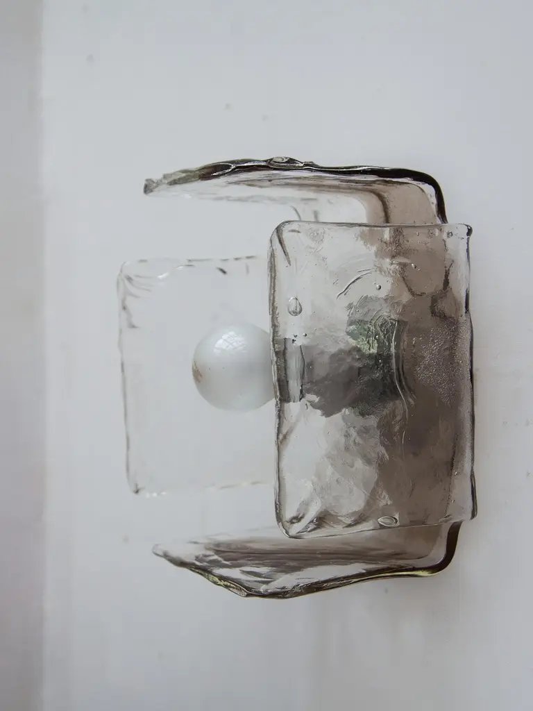 Beautiful and elegant large modern brass wall light or sconce, manufactured by J.T. Kalmar Austria in the 1970s. Lovely design, executed to a very high standard. The wall light has a wonderful textured solid iced glass with a smoked swirl.The high quality large ice crystal plate beautifully reflecting the light.Heavy quality, in full working order and ready to use. The frame and the glass shade is in excellent condition. The wall sconce can be disassembled and the ice crystal sheets individually wrapped for easy transport. The fixture requires 1 E27standard bulb and is Led.