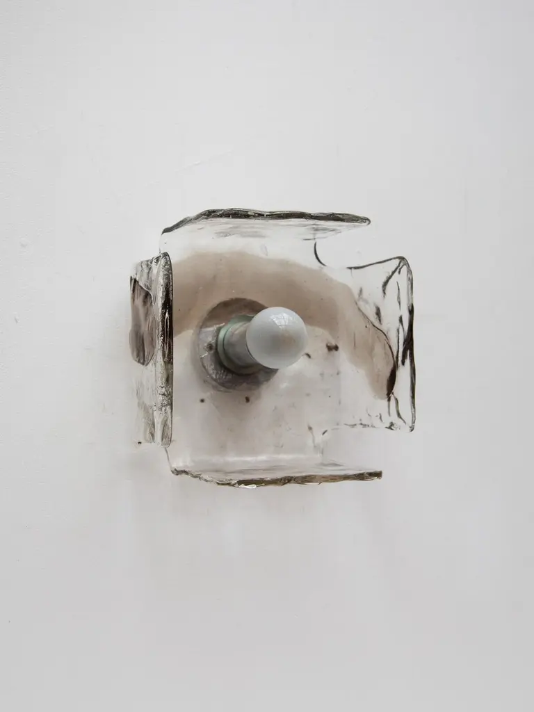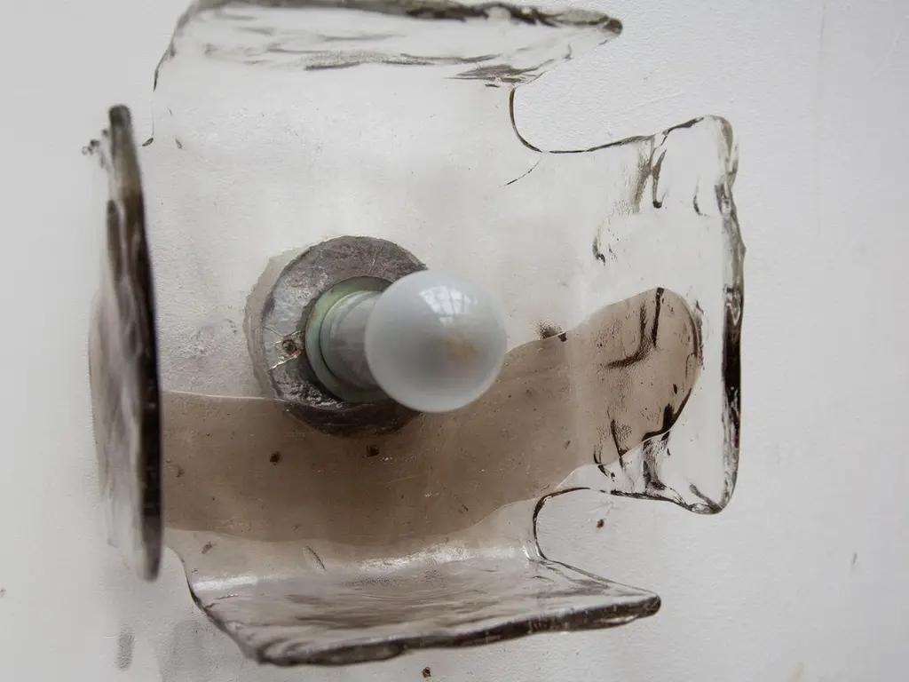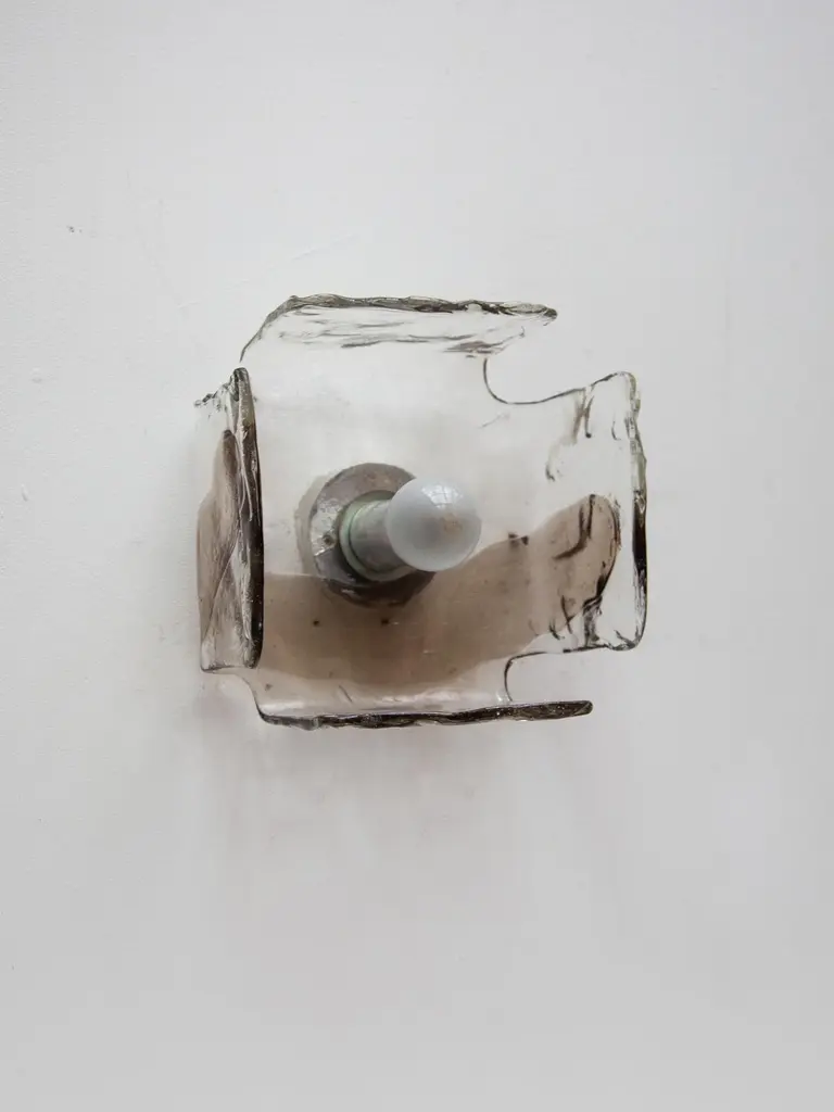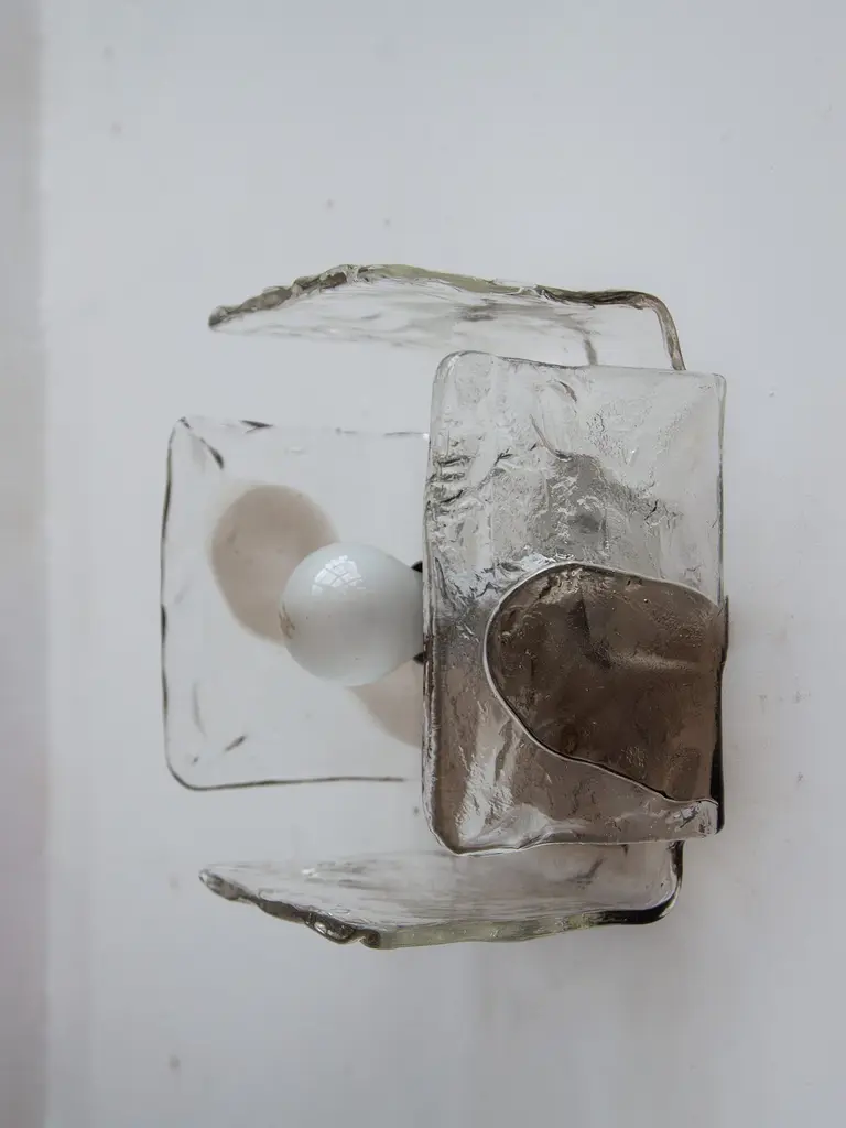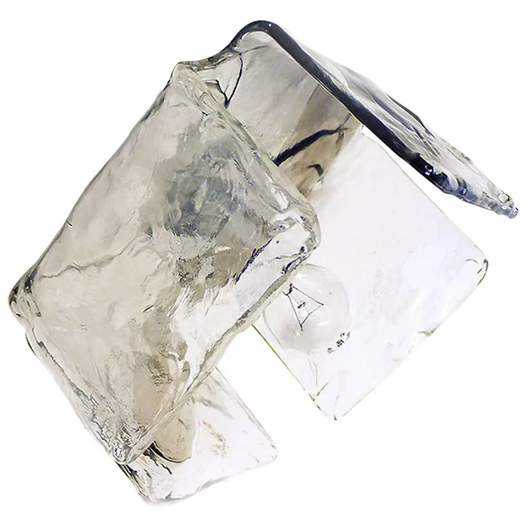 Beautiful and elegant large modern brass wall light or sconce, manufactured by J.T. Kalmar Austria in the 1970s. Lovely design, executed to a very high standard. The wall light has a wonderful textured solid iced glass with a smoked swirl.The high quality large ice crystal plate beautifully reflecting the light.Heavy quality, in full working order and ready to use. The frame and the glass shade is in excellent condition. The wall sconce can be disassembled and the ice crystal sheets individually wrapped for easy transport. The fixture requires 1 E27standard bulb and is Led.