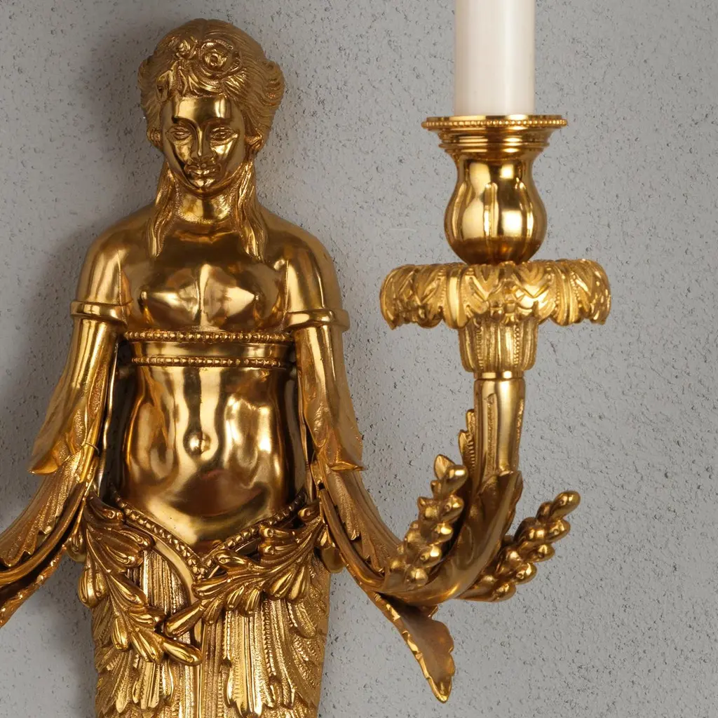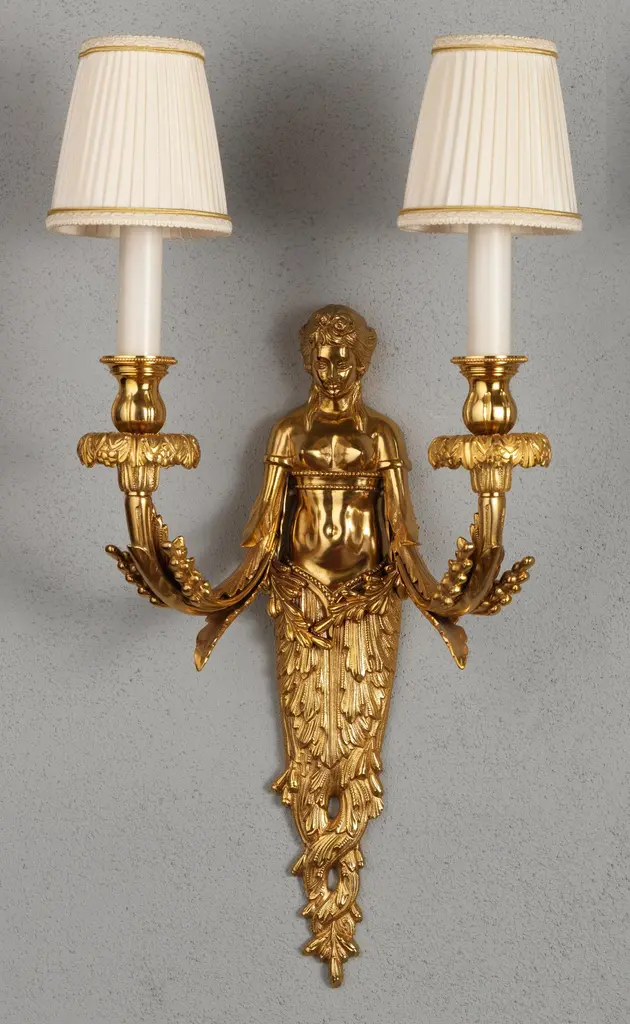 Decorative set of two large gilt bronze figural wall sconces by Gherardo Degli Albizzi. Female figure is characterized by a very rich vegetal decoration with fruit and leaves, both in lower body part and in candelabra arms. Even candleholders feature finely chiselled vegetal details decoration.This sconces set is provided with pleated silk shades.