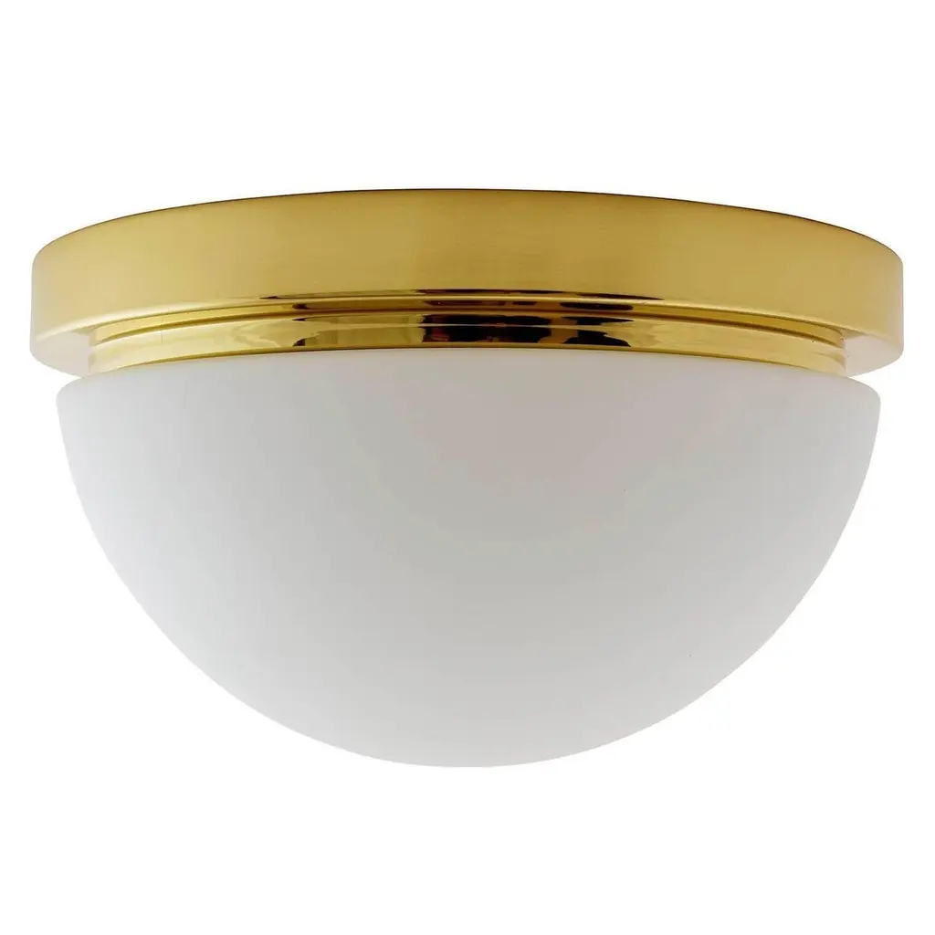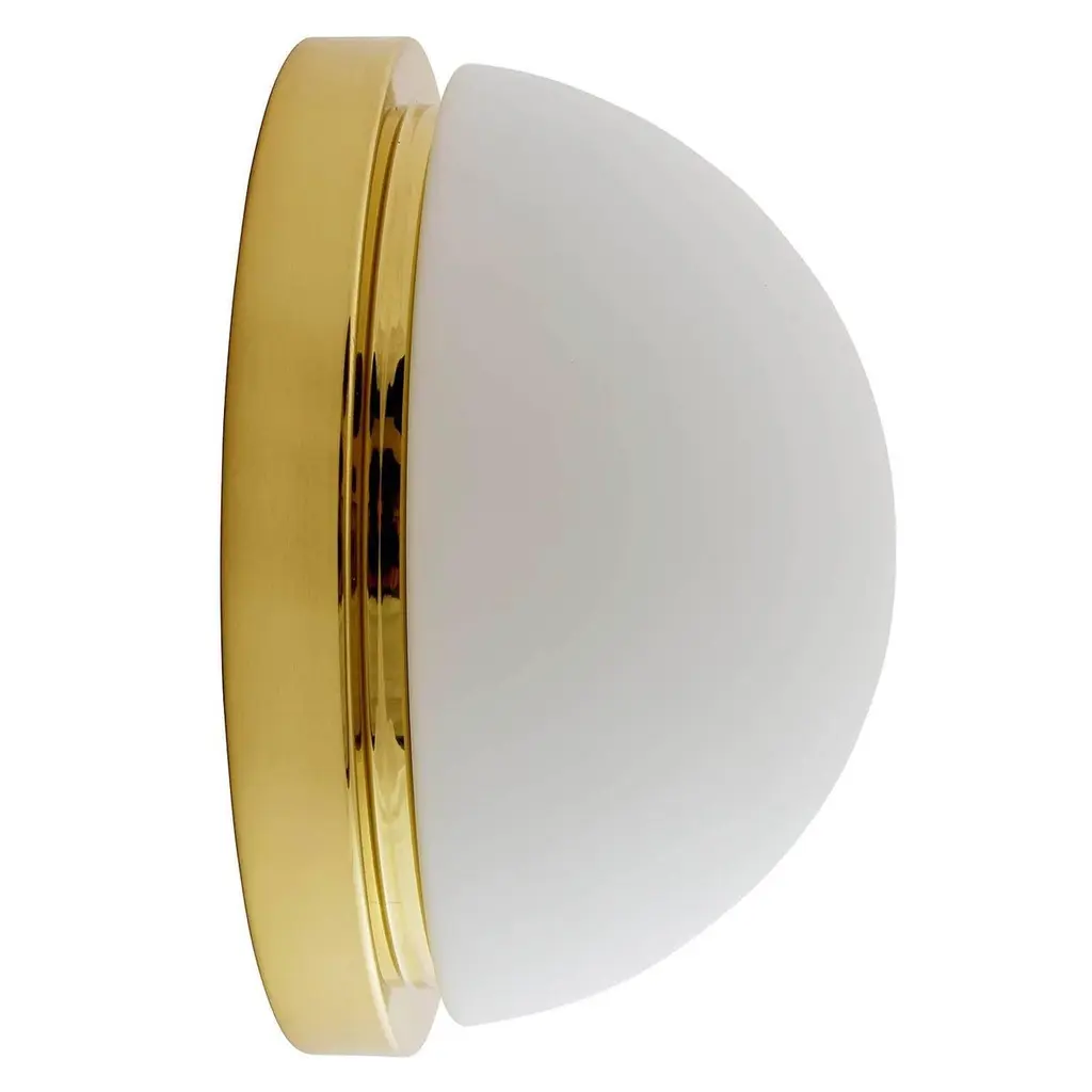 One of eight flush mount or wall lights by Glashütte Limburg, manufactured in midcentury, circa 1970.They are made of a polished brass armature with a dome shaped white milk glass lampshade. Labelled with Glashütte Limburg.The price is per light. They will be sold individually, as pair, or as set of two, three, four, five, six, seven, or eight lights.