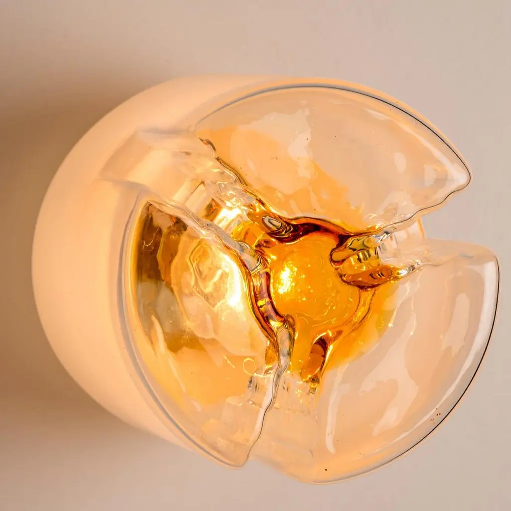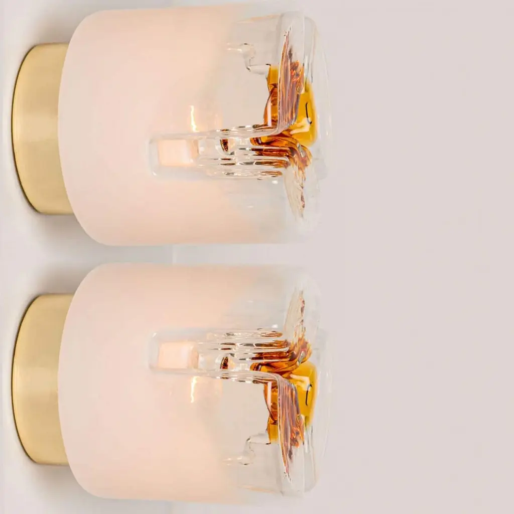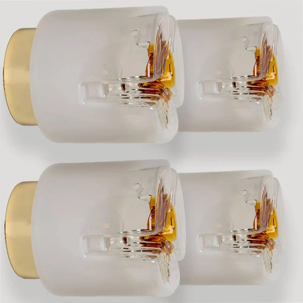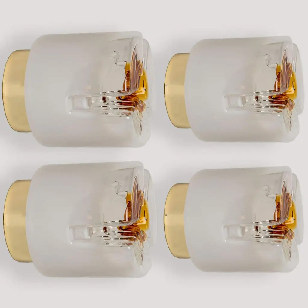 Several great Mid-Century Modern abstract wall sconces by Mazzega Murano. An Italian design from the 1970s. Mazzega is one of the famous manufacturer of Murano like Venini, Vistosi, Seguso or Carlo Nason, Tuny Zuccheri.Truly a beautiful pair of sconces in person. Can also be used as flush mount.Each is comprised of amber and clear glass with brass hardware.Cleaned and re-wired, in full working order and ready to use. The brass frame is in very good condition. The wall lights can be disassembled and the crystals individually wrapped for easy transport. Each lamp requires a E14 light bulb.Please notice the price is for one, several pieces available.