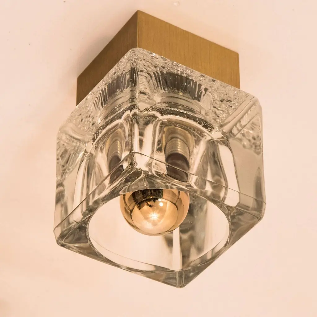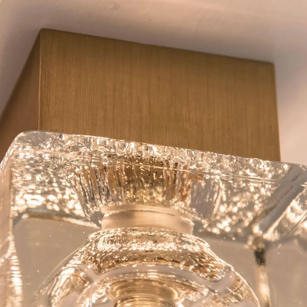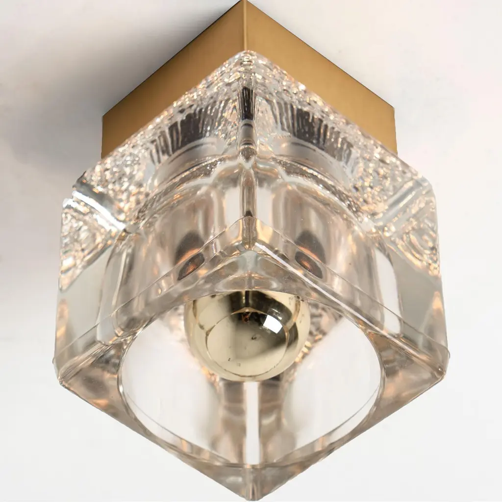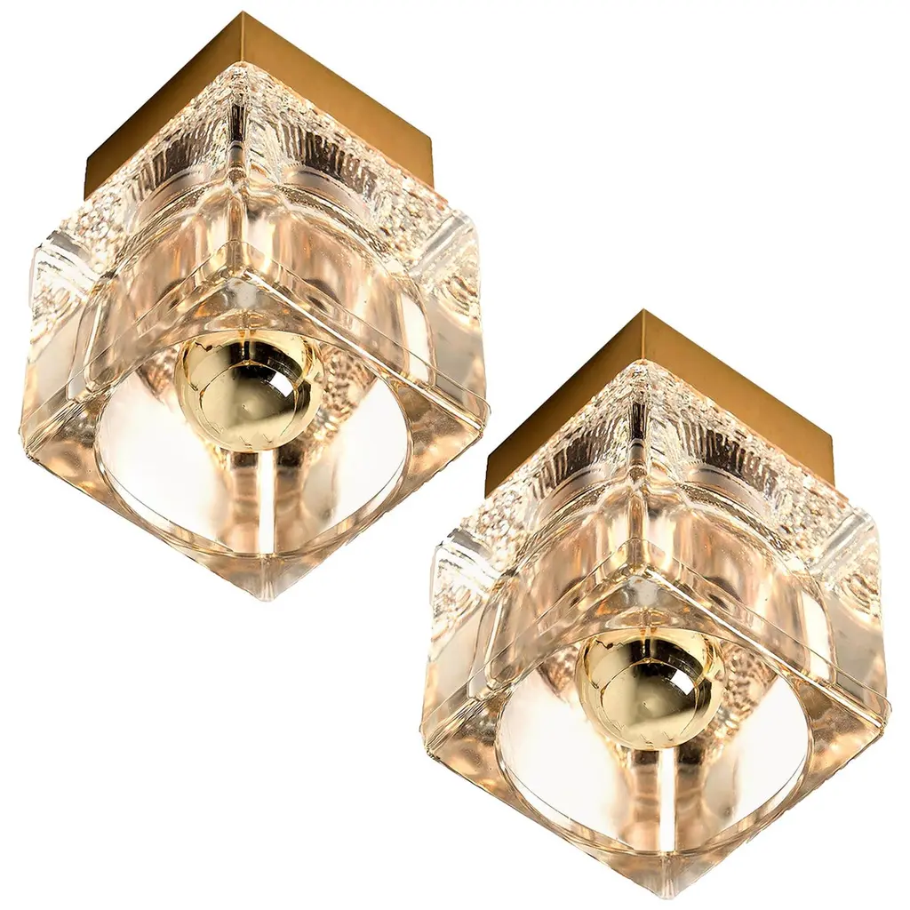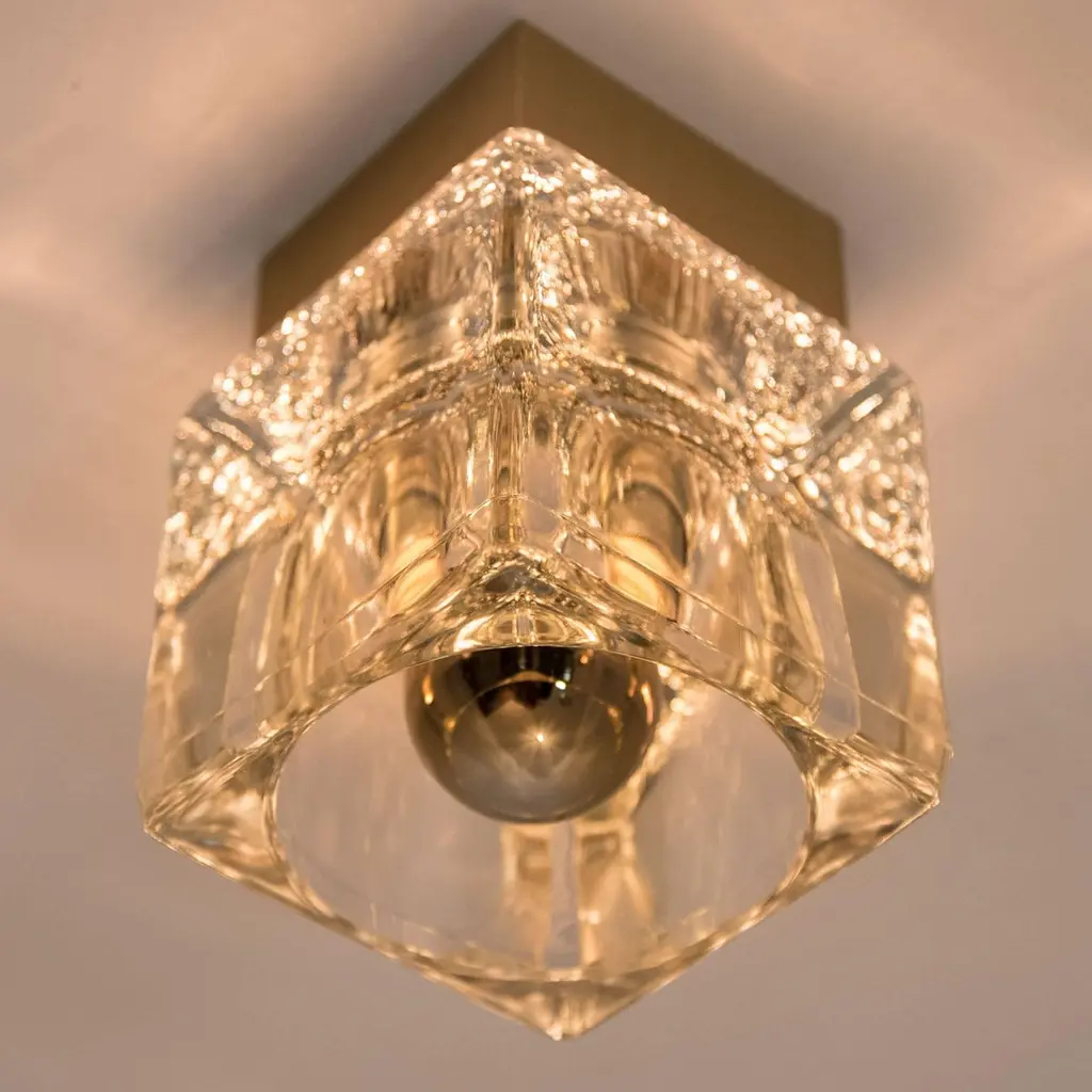 Several high quality Peill & Putzler wall lights brass and glass cubes, circa 1970s, Germany. This sculptural ceiling lights from Peill & Putzler consists 1 clear illuminated glass cube on a square brass frame.The glass cube beautifully reflects a warm golden light. The hick clear glass cubes have a textured pattern at the bottom of each. This beautifully texture creates a nice three-dimensional effect.This cubes can also can be used as a wall or ceiling lights. It is fitted to the ceiling or wall through 1 hole in the frame. High quality, well- wired, in full working order and ready to use.Carries 1 standard small screw light bulbs (E14) up to 40 Watts each. Fitted with gold light bulbs 15 Watts (for a different look it can take different types of light bulbs, such as E14 clear or silver light bulbs, Max 40 Watts) . The brass frame is in very good condition the glass cubes are in very good condition.