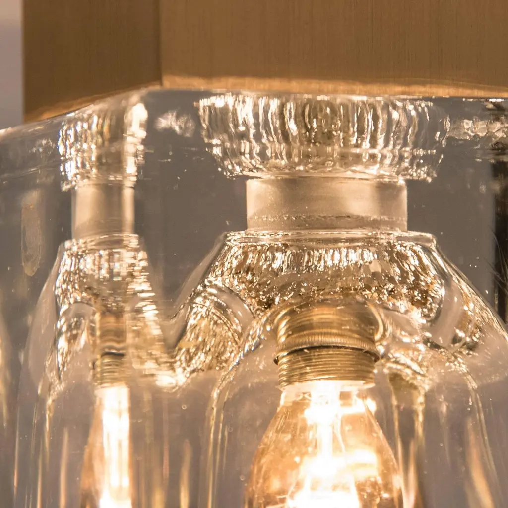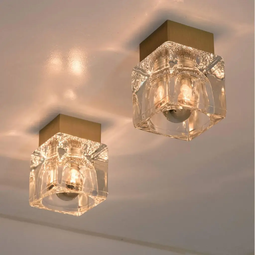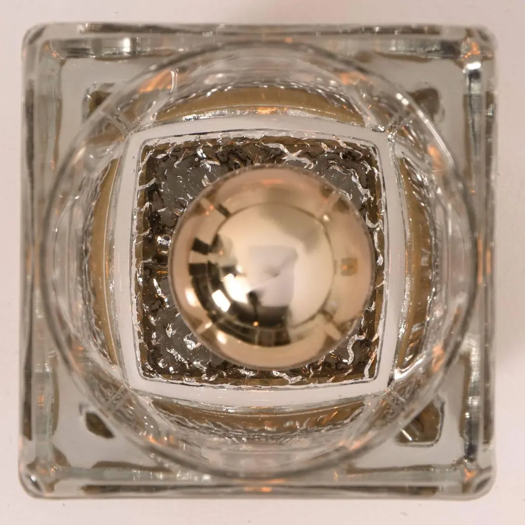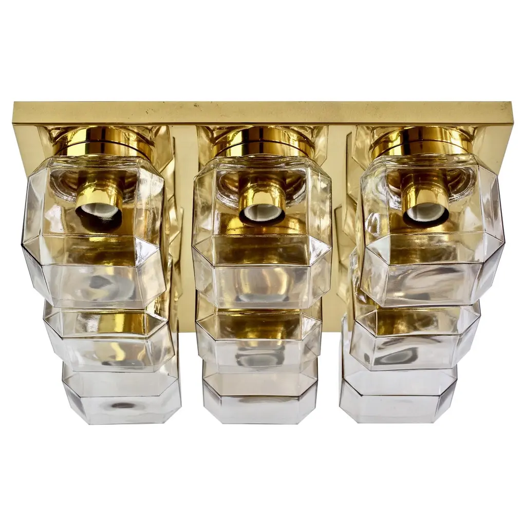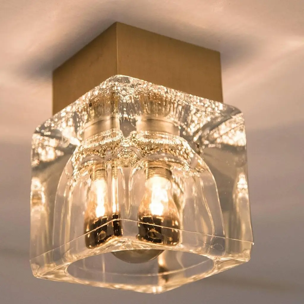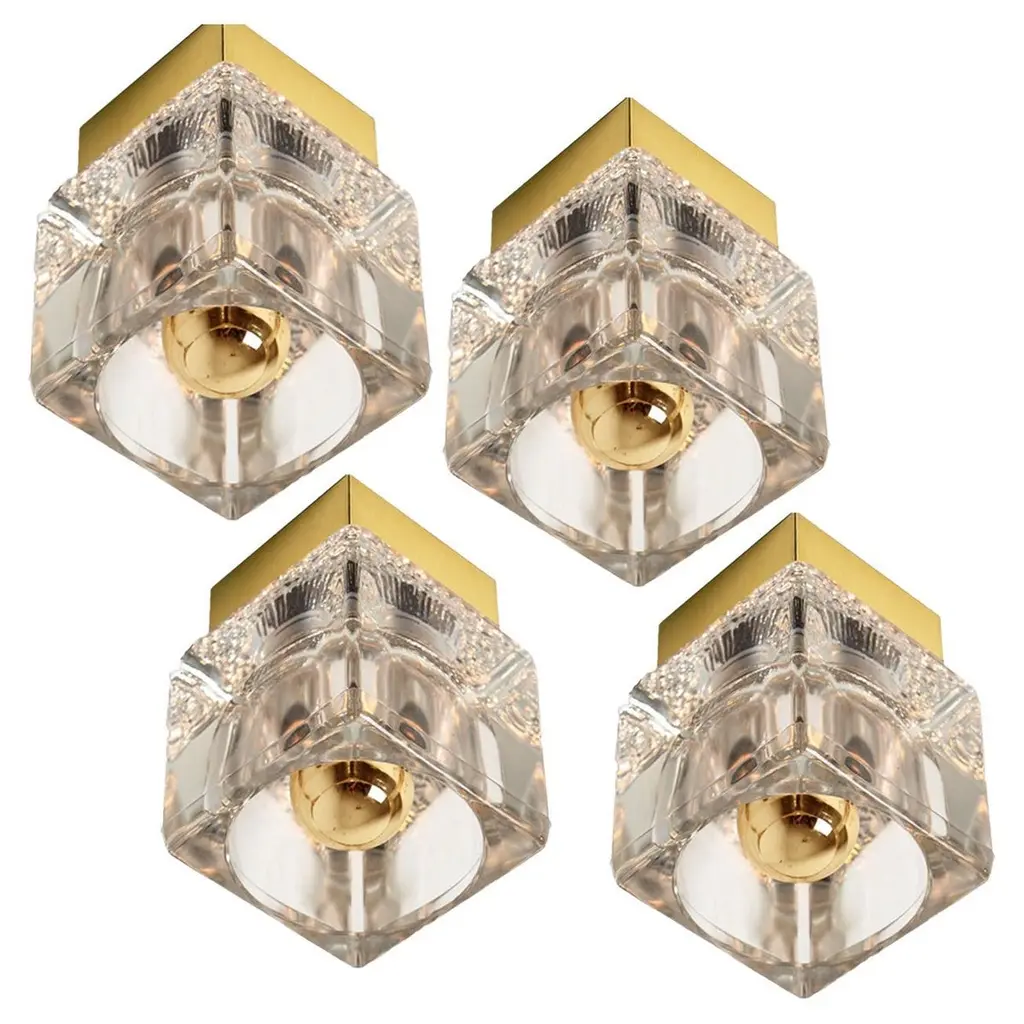 Several high quality Peill & Putzler wall lights brass and glass cubes, circa 1970s, Germany. This sculptural ceiling lights from Peill & Putzler consists 1 clear illuminated glass cube on a square brass frame.The glass cube beautifully reflects a warm golden light. The hick clear glass cubes have a textured pattern at the bottom of each. This beautifully texture creates a nice three-dimensional effect.This cubes can also can be used as a wall or ceiling lights. It is fitted to the ceiling or wall through 1 hole in the frame. High quality, well- wired, in full working order and ready to use.Carries 1 standard small screw light bulbs (E14) up to 40 Watts each. Fitted with gold light bulbs 15 Watts (for a different look it can take different types of light bulbs, such as E14 clear or silver light bulbs, Max 40 Watts) . The brass frame is in very good condition the glass cubes are in very good condition.