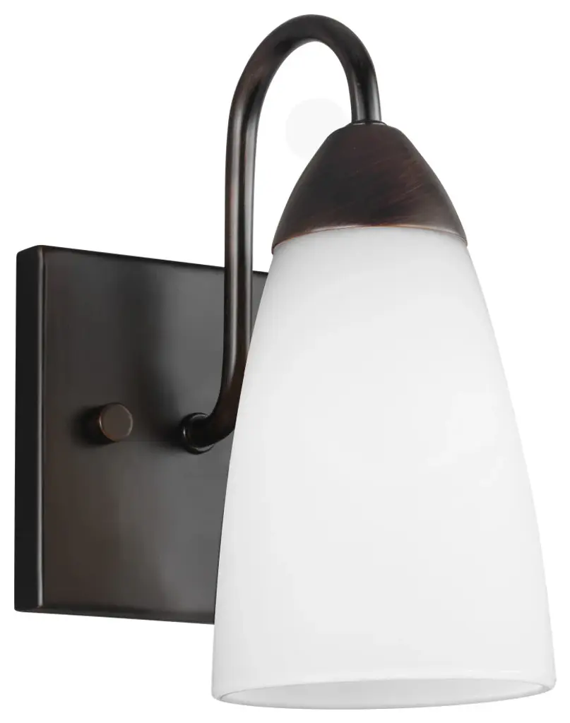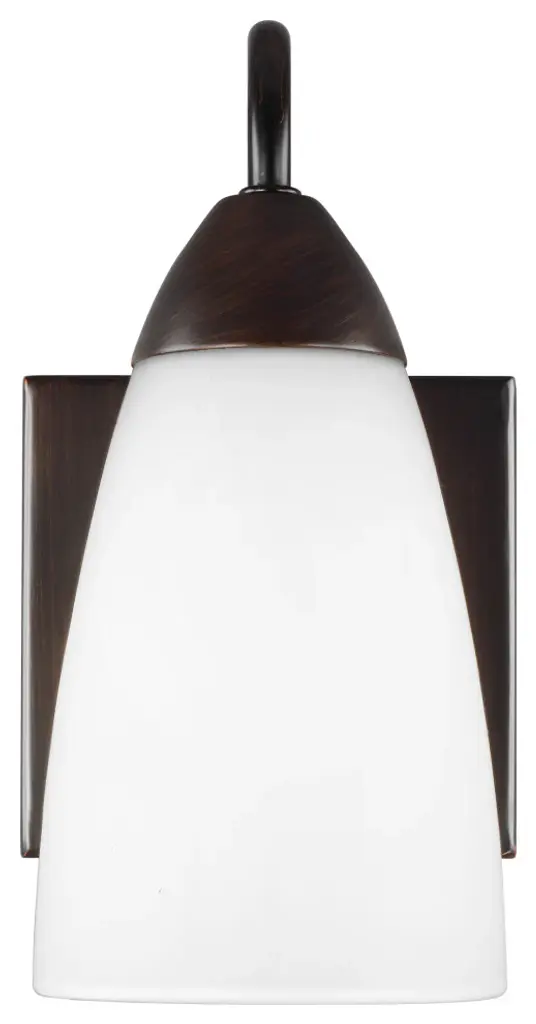 The Generation Lighting Lighting Seville one light wall sconce in bronze is an ENERGY STAR qualified lighting fixture that uses fluorescent bulbs to save you both time and money. The Seville collection represents commitment to high style at a sharp price. The modernist design is epitomized by the teardrop curves in the arms tipped by etched glass diffusors throughout the chandeliers and bath fixtures. The collection offers a "whole home" lighting solution in every imaginable category. The assortment includes nine-light, five-light, and three-light chandeliers (either with up-light or down-light), pendants in four sizes as well as one-light, two-light, three-light, four-light and five-light wall/bath fixtures. Install a stylish and elegant addition to any room in the house. Seville is offered in Brushed Nickel and Burnt Sienna finishes.Lighting Information:Bulb type: 1 A19 Medium 9.3 watt light bulbNumber of bulbs: 1Bulb(s) includedcETL Listed