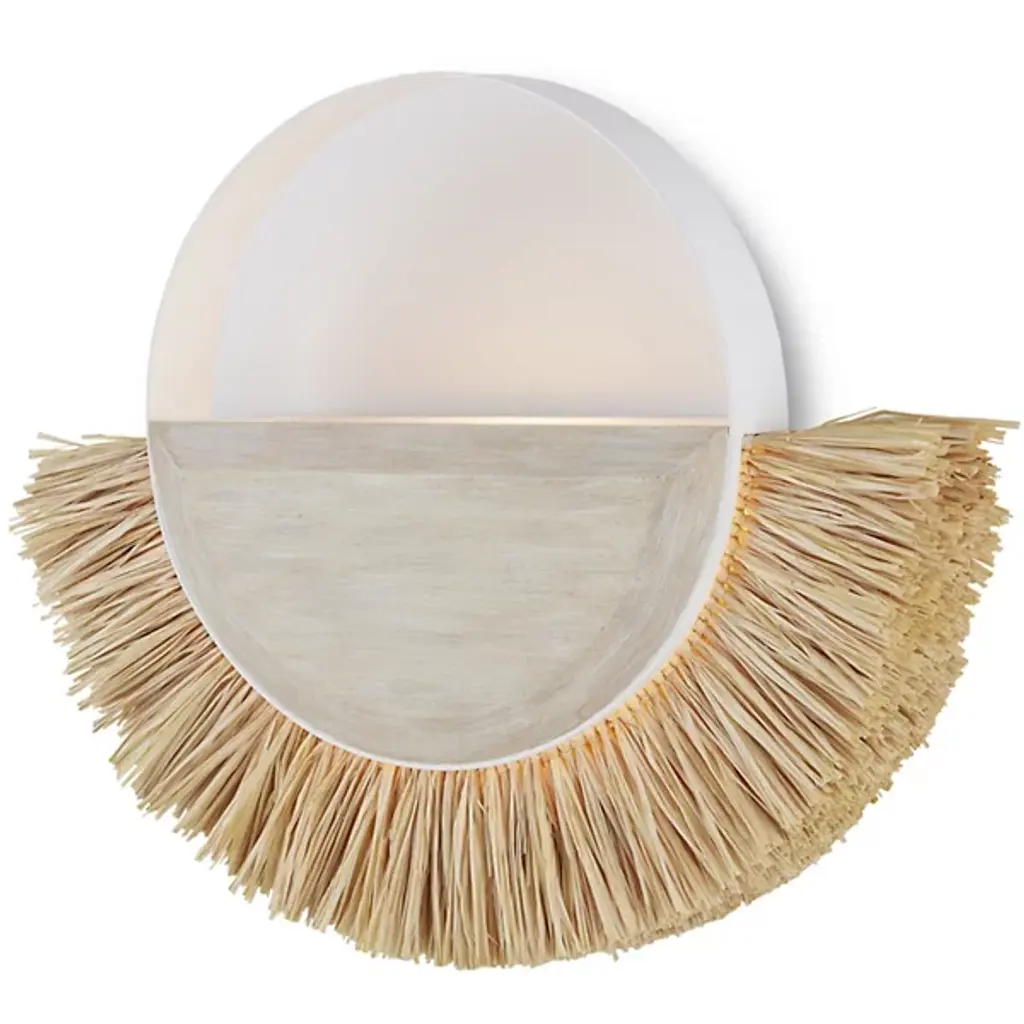 Presented by Currey & Company and designed by Jamie Beckwith, the Sychelles Wall Sconce is a transitional piece that draws from mid-mod design and laid-back, island-hopping coastal vibes. A circular silhouette makes up the bodice, formed from wrought iron in a sugar white finish. It’s fitted with a wooden panel in a sandstone finish. When illuminated, it gives the illusion of a sandy horizon at dusk or dawn. The natural raffia embellishments along one side will glow beautifully as well. It can be placed in several positions based on personal style.