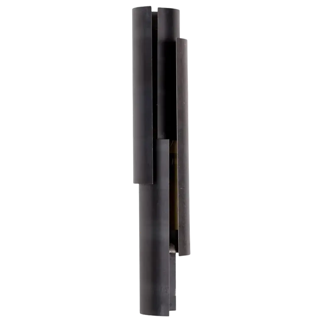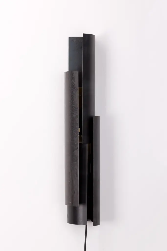 Sfoglia wall sconce by MingardoDimensions: D 15 x W 18 x H 59 cm Materials: Black natural ironWeight: 6 kgAlso available in different finishes.All our lamps can be wired according to each country. If sold to the USA it will be wired for the USA for instance.Sfoglia and Piega are two bright items made of black steel and raw brass.The two wall lamps are realized with the combination of bending metal sheets. The overlapping effect of metal sheets creates a sculpted shape while inside the lamp, there is an E27 light bulb with cable and plug. It generates unique and different bright shapes on the wall, only using a small spike and using more of them you will create different light games on the house walls.Mingardo Ilario founded Mingardo Blacksmith Workshop in 1970, after over twenty years’ experience in the metal processing field.The production was initially focused on simple blacksmith works for the construction industry. Over the time, it has become more refined, enabling the company to collaborate with internationally renowned companies and architects: from the first collaborations with architect Carlo Scarpa to the more recent commissions for Museo del Novecento in Milan, Parco della Musica in Florence, and Teatro Petruzzelli in Bari.Over the years, the Workshop has achieved great results, with the production of unique metal products, all hand-wrought by a highly skilled team of specialized artisans. Nowadays, it is highly regarded in the local artisan field for its high-end refined finishing touches and details, and for its know-how.