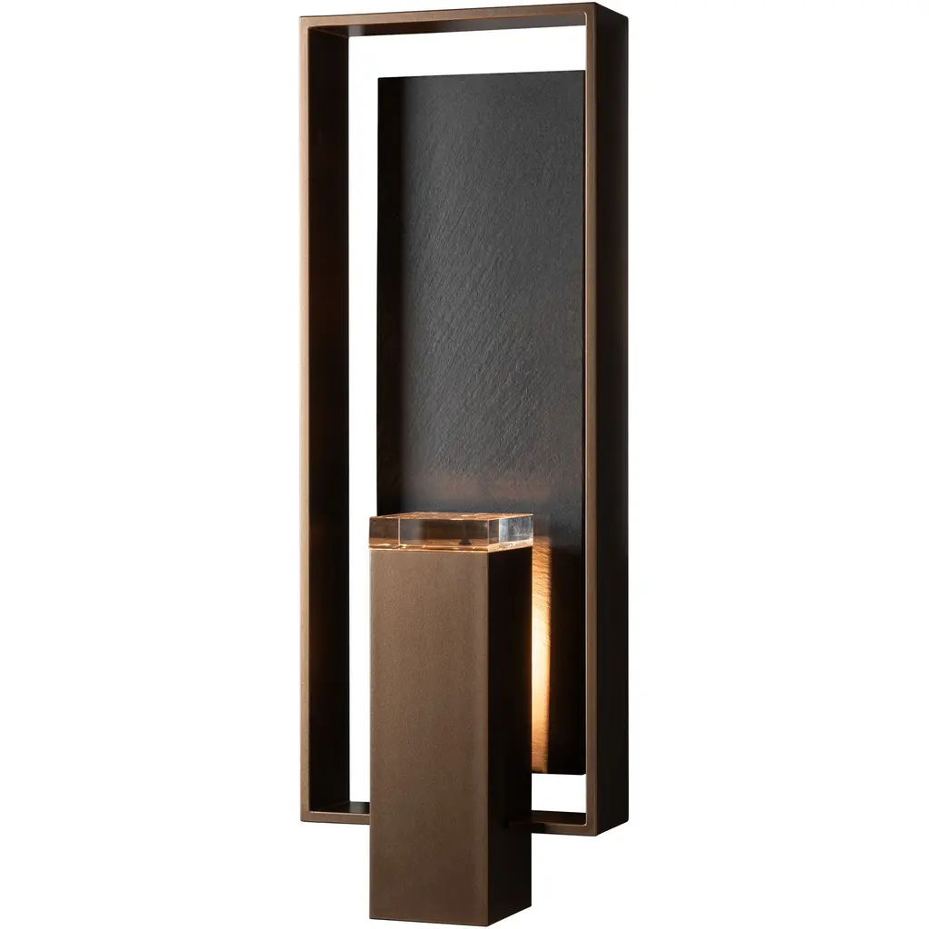 High-impact lighting need not be complex," according to Shadow Box designer David Martin. Inspired by contemporary architecture, this large outdoor wall mount is both minimalist and elegant. Natural black Vermont slate serves as a dramatic backplate. This Dark Sky Friendly version features an uplight inhibitor to reduce unnecessary light pollution and preserve our night skies. Available in a choice of AAMA 2604-rated Coastal Outdoor Finishes.