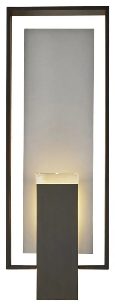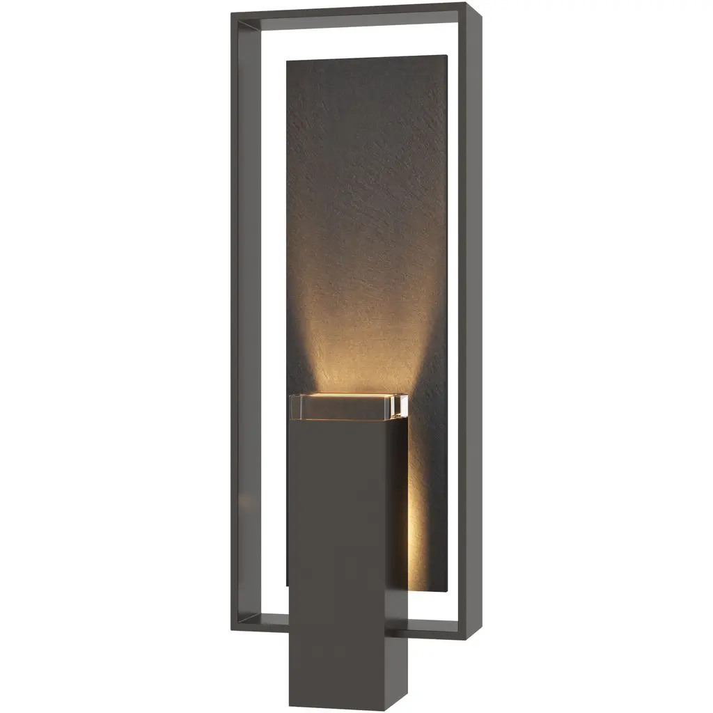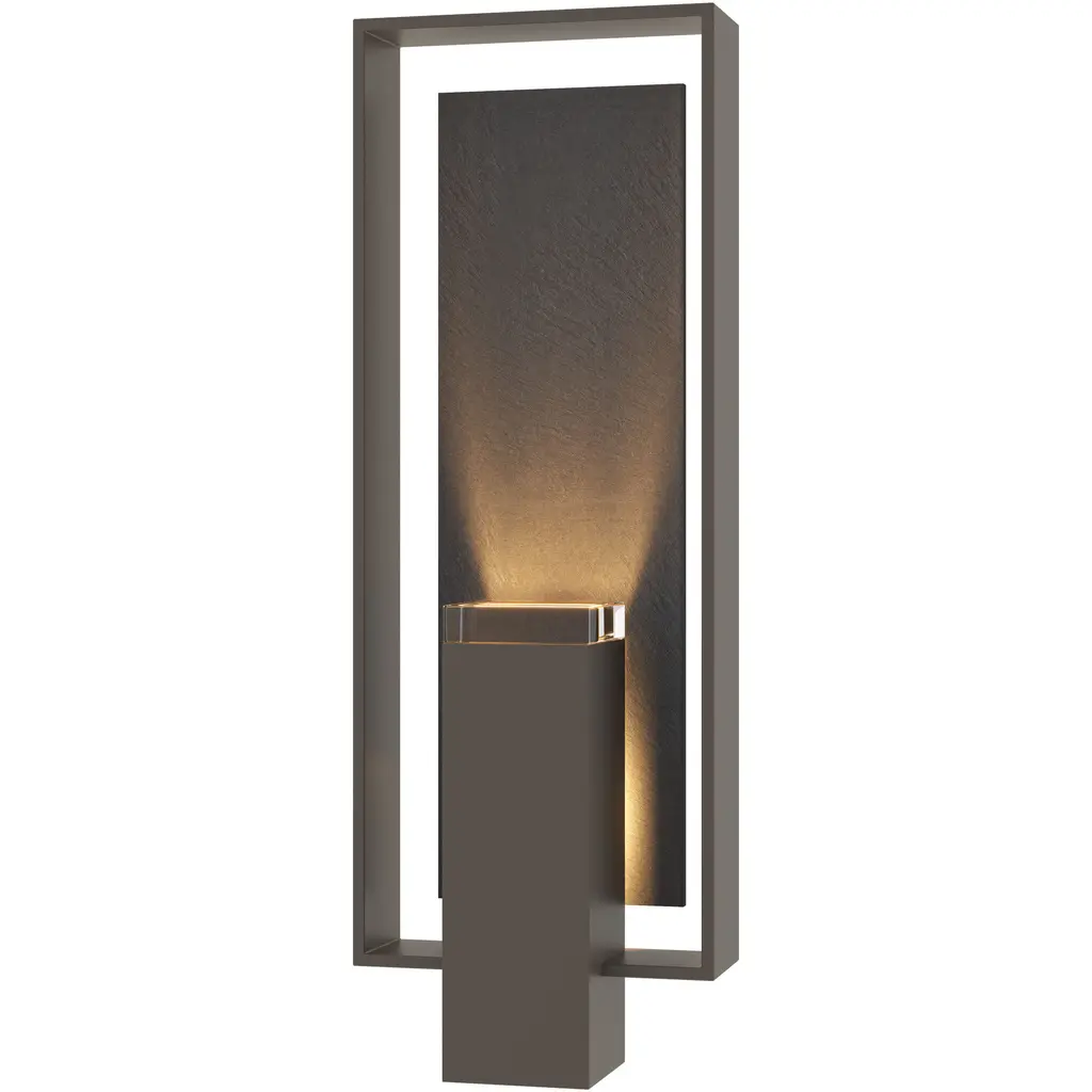 Layers of diffused light and dramatic shadow create the perfect blend of style and austere lines. By focusing on materials and faultless geometric balance, this large Shadow Box sconce makes a statement. This Dark Sky Friendly version allows us to truly appreciate the night sky''s constellations by impeding uplight and directing the light downward. Offered as a two-toned wall sconce, with the frame being one finish and the backplate another, if desired. Available in a choice of AAMA 2604-rated Coastal Outdoor Finishes. Custom backplate option.Features:Lifetime Limited Warranty when installed in residential settingFeatures a robust Coastal Outdoor finish specifically formulated to resist some of the harshest environmental conditions. Coastal oil rubbed bronze, coastal bronze, coastal dark smoke, and coastal burnished steel finishes are AAMA-2604 rated making these among the most durable, resistant finishes available for corrosion resistance, colorfastness, and durability. these coatings deliver exceptional hardness, scratch & mar resistance for enhanced performance in seacoast environments.ADA compliant direct wire wall sconce with finish and accent. Choose a finish for the fixture core and an accent for the backplate. Includes optical diffuser.AAMA 2604-ratedAll Hubbardton Forge Coastal Outdoor finishes are AAMA-2604 certified, meaning they are among the most durable, resistant finishes available.Handcrafted in Vermont, USADark sky friendly flush mount outdoor wall sconce with Vermont slate.Requires 2 A15 E26 Medium Replaceable Bulb (120 max wattage) (Not Included)