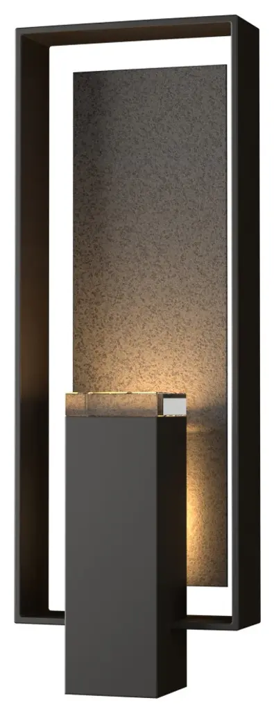 By focusing on materials and faultless geometric balance, the Shadow Box sconce proves that high-impact lighting need not be complex. Layers of diffused light and dramatic shadow create the perfect blend of style and austere lines. Each piece is accented with a block of optic crystal for an added touch of elegance. Custom backplate available. All Hubbardton Forge products are hand-crafted to last one at a time in Vermont and backed by a Lifetime Limited Warranty.Features:Lifetime Limited Warranty when installed in residential settingFeatures a robust Coastal Outdoor finish specifically formulated to resist some of the harshest environmental conditions. Coastal oil rubbed bronze, coastal bronze, coastal dark smoke, and coastal burnished steel finishes are AAMA-2604 rated making these among the most durable, resistant finishes available for corrosion resistance, colorfastness, and durability. these coatings deliver exceptional hardness, scratch & mar resistance for enhanced performance in seacoast environments.ADA compliant direct wire wall sconce with finish and accent. Choose a finish for the fixture core and an accent for the backplate. Includes optical diffuser.AAMA 2604-ratedAll Hubbardton Forge Coastal Outdoor finishes are AAMA-2604 certified, meaning they are among the most durable, resistant finishes available.Handcrafted in Vermont, USARequires 2 (1) A15 (wet location) and (1) B E26 medium Replaceable LED (120 max wattage) (Not Included)