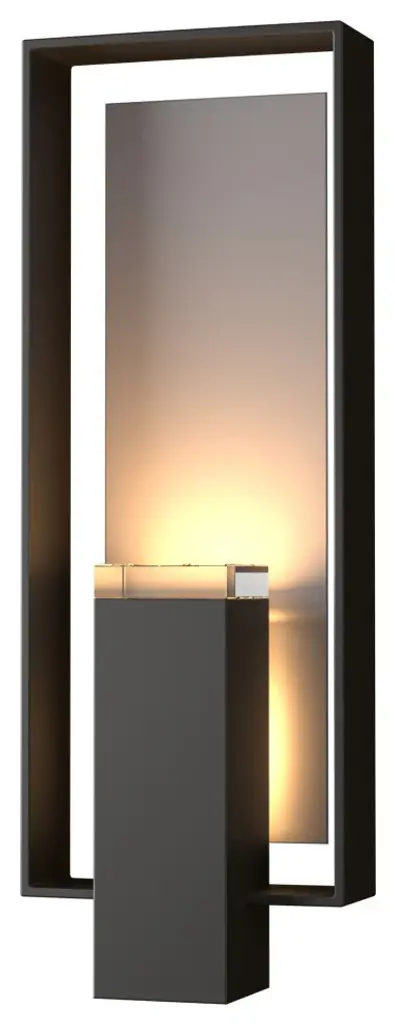 By focusing on materials and faultless geometric balance, the Shadow Box sconce proves that high-impact lighting need not be complex. Layers of diffused light and dramatic shadow create the perfect blend of style and austere lines. Each piece is accented with a block of optic crystal for an added touch of elegance. Custom backplate available. All Hubbardton Forge products are hand-crafted to last one at a time in Vermont and backed by a Lifetime Limited Warranty.Features:Lifetime Limited Warranty when installed in residential settingFeatures a robust Coastal Outdoor finish specifically formulated to resist some of the harshest environmental conditions. Coastal oil rubbed bronze, coastal bronze, coastal dark smoke, and coastal burnished steel finishes are AAMA-2604 rated making these among the most durable, resistant finishes available for corrosion resistance, colorfastness, and durability. these coatings deliver exceptional hardness, scratch & mar resistance for enhanced performance in seacoast environments.ADA compliant direct wire wall sconce with finish and accent. Choose a finish for the fixture core and an accent for the backplate. Includes optical diffuser.AAMA 2604-ratedAll Hubbardton Forge Coastal Outdoor finishes are AAMA-2604 certified, meaning they are among the most durable, resistant finishes available.Handcrafted in Vermont, USARequires 2 (1) A15 (wet location) and (1) B E26 medium Replaceable LED (120 max wattage) (Not Included)