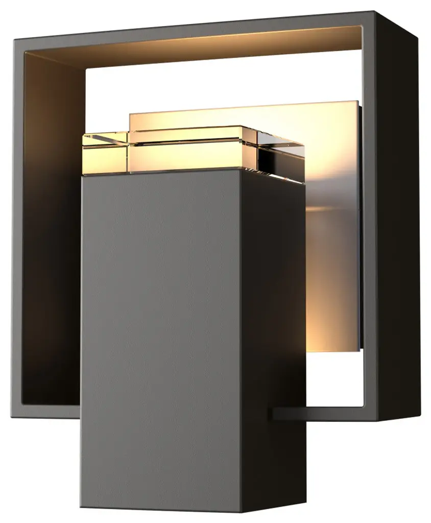 By focusing on materials and faultless geometric balance, the Shadow Box sconce proves that high-impact lighting need not be complex. Layers of diffused light and dramatic shadow create the perfect blend of style and austere lines. Each piece is accented with a block of optic crystal for an added touch of elegance. All Hubbardton Forge products are hand-crafted to last one at a time in Vermont and backed by a Lifetime Limited Warranty.Features:Lifetime Limited Warranty when installed in residential settingFeatures a robust Coastal Outdoor finish specifically formulated to resist some of the harshest environmental conditions. Coastal oil rubbed bronze, coastal bronze, coastal dark smoke, and coastal burnished steel finishes are AAMA-2604 rated making these among the most durable, resistant finishes available for corrosion resistance, colorfastness, and durability. these coatings deliver exceptional hardness, scratch & mar resistance for enhanced performance in seacoast environments.ADA compliant direct wire wall sconce with finish and accent. Choose a finish for the fixture core and an accent for the backplate. Includes optical diffuser.AAMA 2604-ratedAll Hubbardton Forge Coastal Outdoor finishes are AAMA-2604 certified, meaning they are among the most durable, resistant finishes available.Handcrafted in Vermont, USARequires 1 A15 (wet location) E26 medium Replaceable LED (60 max wattage) (Not Included)