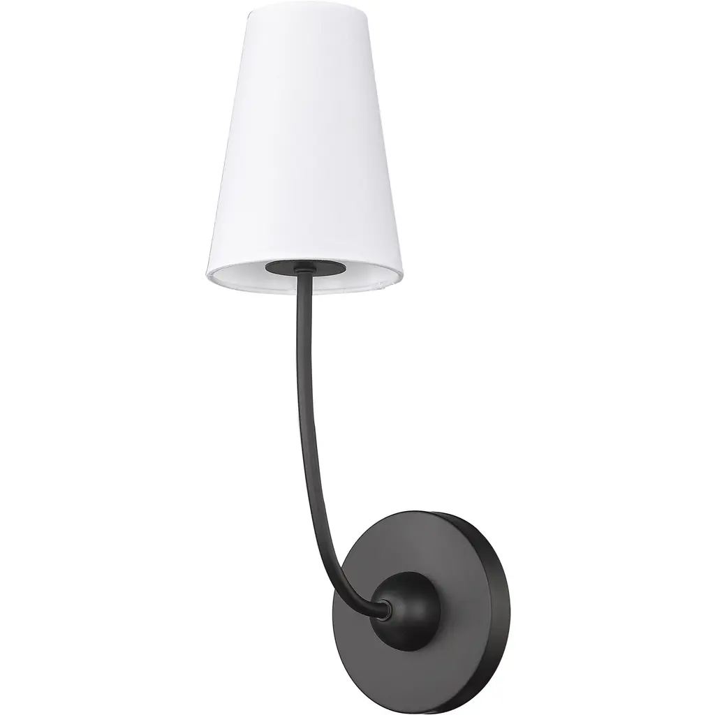 Soft curves repurpose a traditional lighting design and add a fresh motif to a modern space. From the Shannon collection comes a simple yet attractive wall sconce that ties together surrounding decor. Framing featuring matte black finish steel contrasts with a white fabric shade to embrace iconic design features.