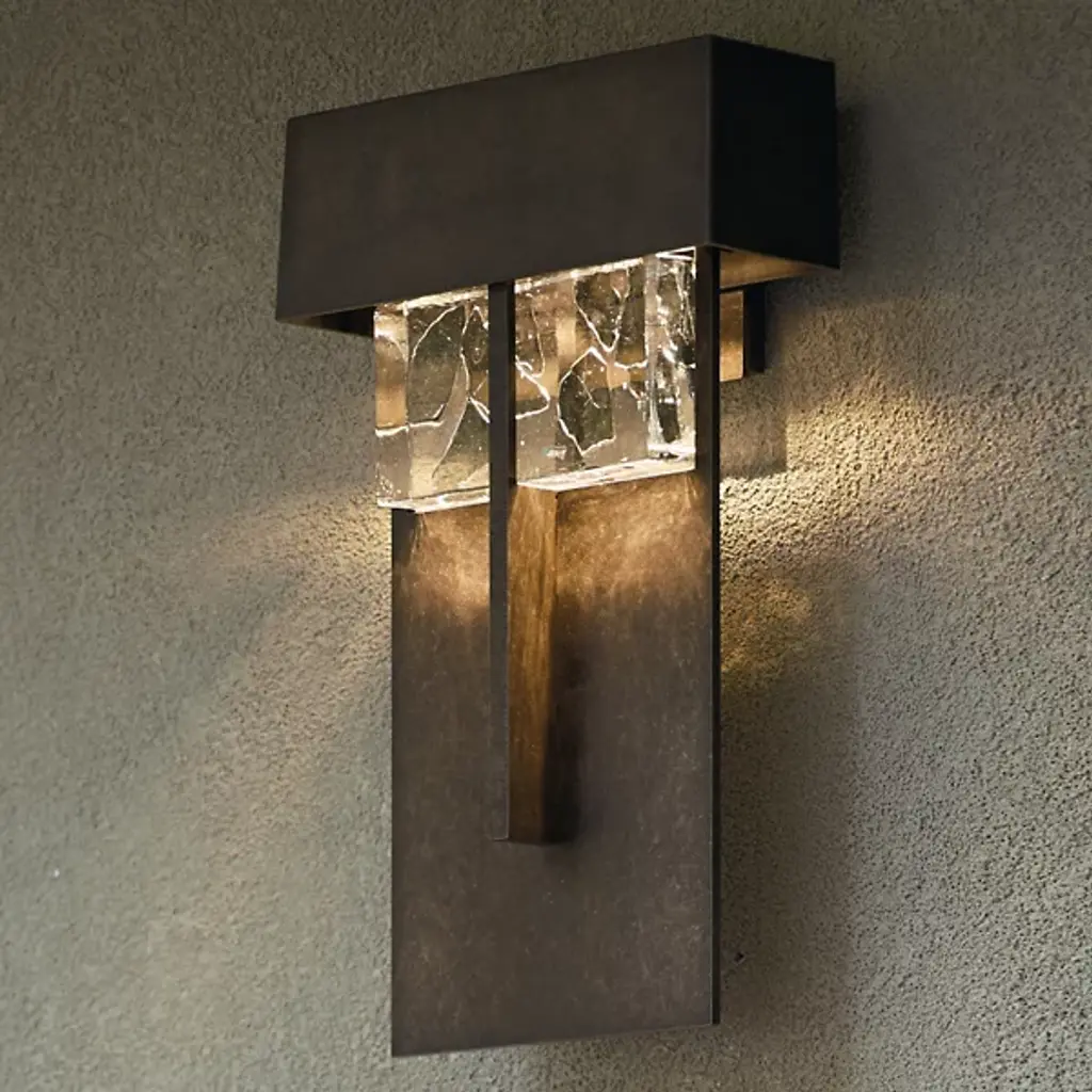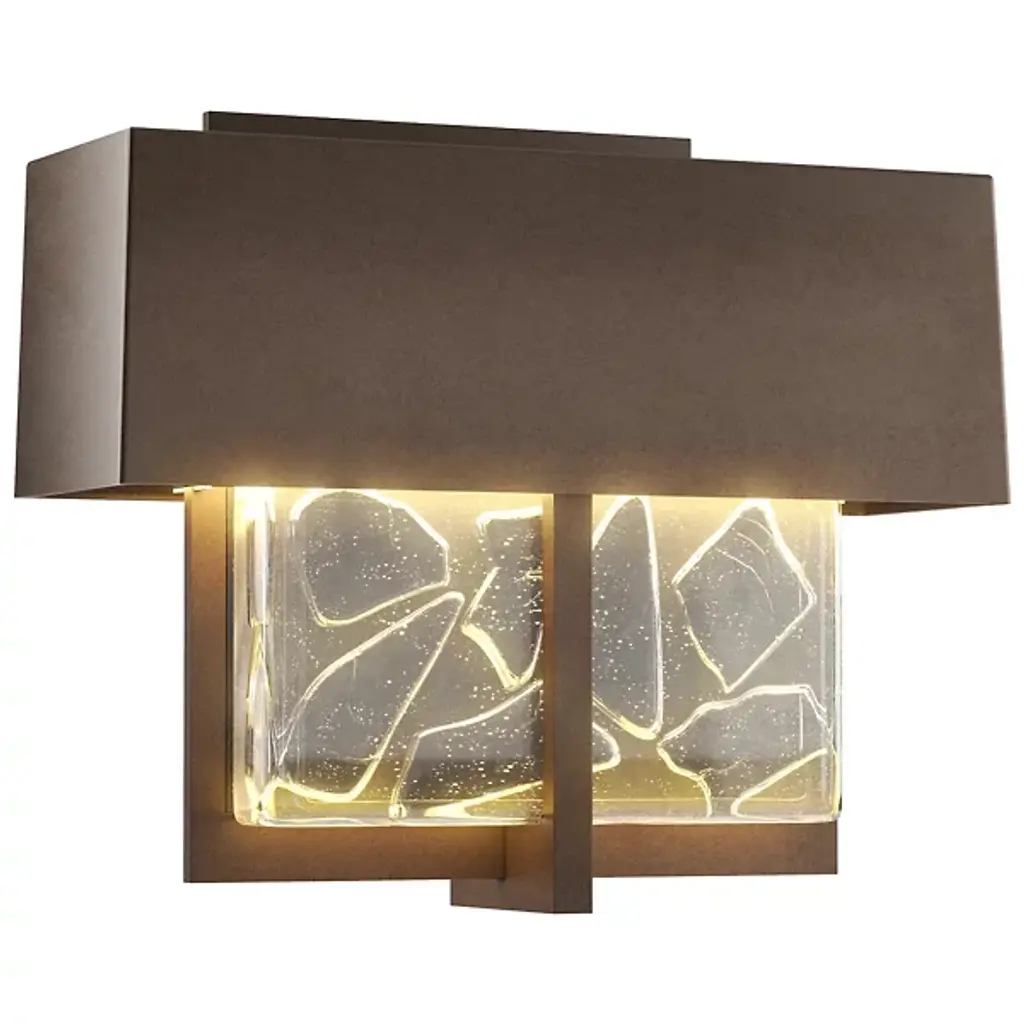 The Hubbardton Forge Shard Large LED Outdoor Wall Sconce features hand poured glass lit with energy efficiency. The clear glass block contains smoke glass shards, creating an interesting texture for the light to shine on. The illumination pours down from the iron shade, bringing out the unique qualities in the craftsman glass. The coastal finishes are meant to endure harsh saltwater environments and have been tested to 100% humidity and water with salinity 50% greater than the average found in the Atlantic or Pacific.