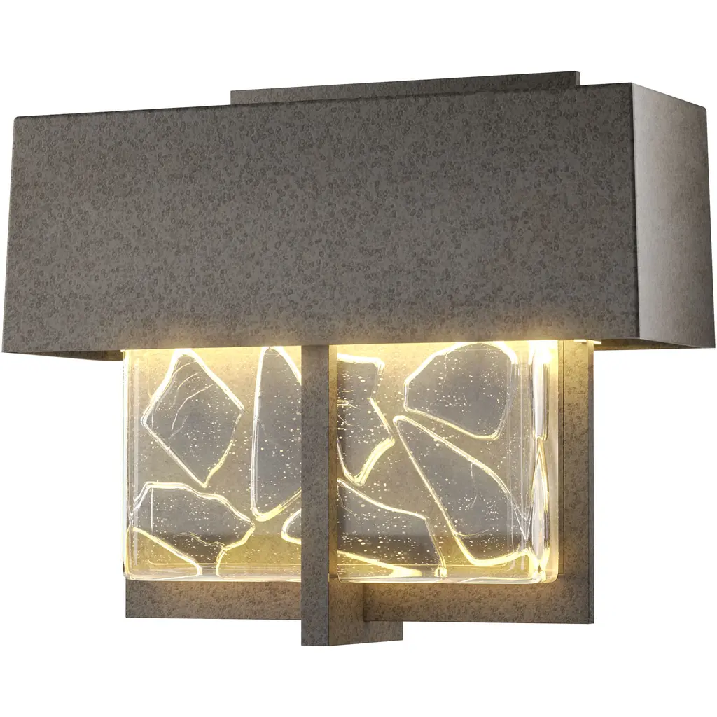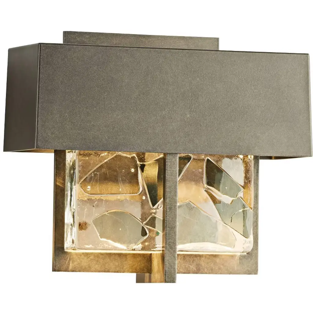 Dramatic lighting with an artistic flair. The Shard Small LED Outdoor Wall Sconce by Hubbardton Forge is highlighted with a thick hand-poured clear glass block that features colored shard inserts. This handcrafted design is placed on a geometrical back panel made of aluminum. A geometrical enclosure at the top houses an LED light that reflects the glow on the shards and back paneling. Install it on patio, backyard, or porch walls to infuse contemporary style and enhance the visual appeal.