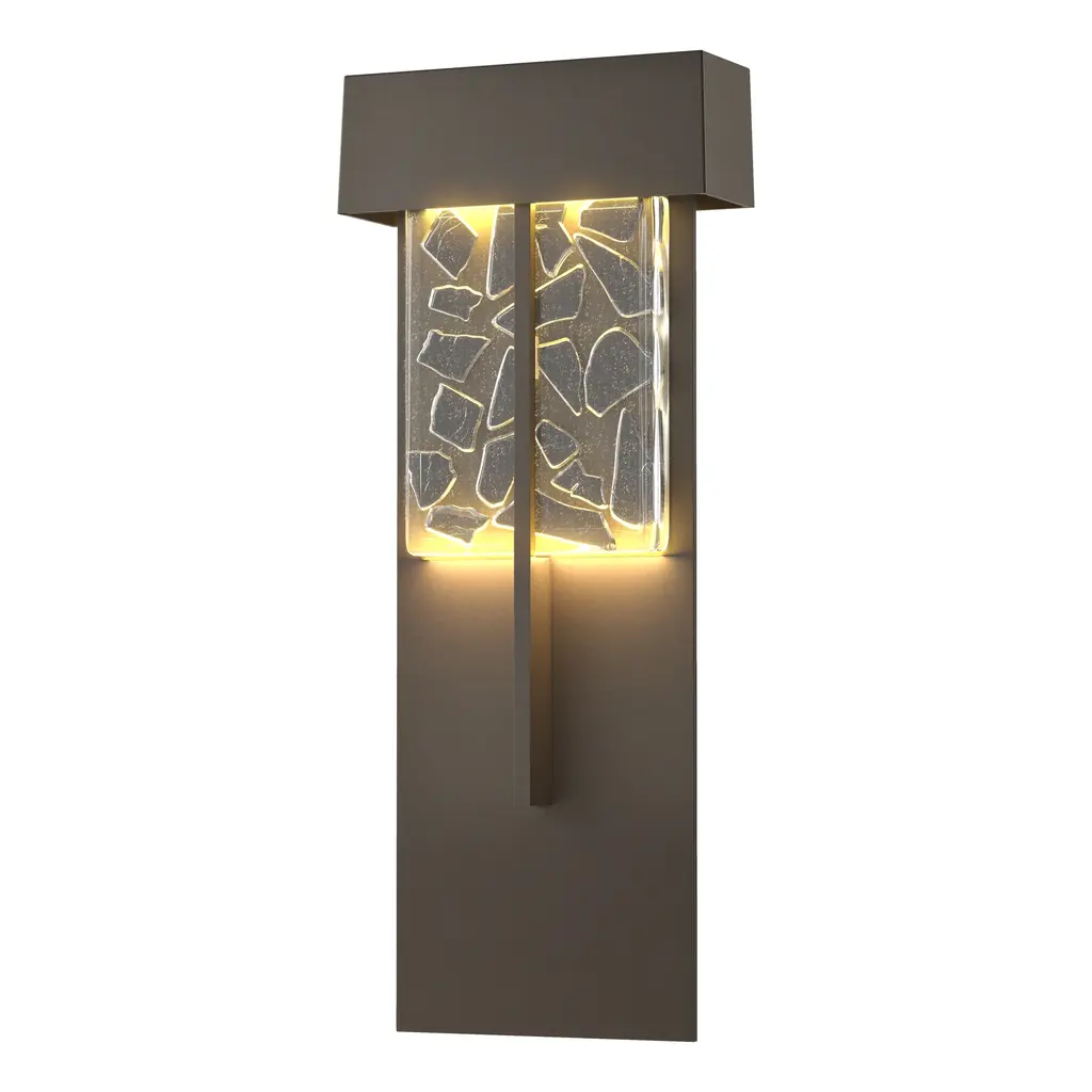 Illuminate exteriors with the captivating beauty of the Shard XL LED Outdoor Wall Sconce from Hubbardton Forge. This sizable fixture is secured by a rectangular aluminum backplate and is given a robust finish that is meant to withstand harsh environmental conditions, including those in coastal areas. An angular top contains the fixture’s LED light source, which spills downward over a clear glass panel with shards of smoked glass set inside. Glistening through the textural glass facets, its warm light creating a mesmerizing effect as it illuminates the space.