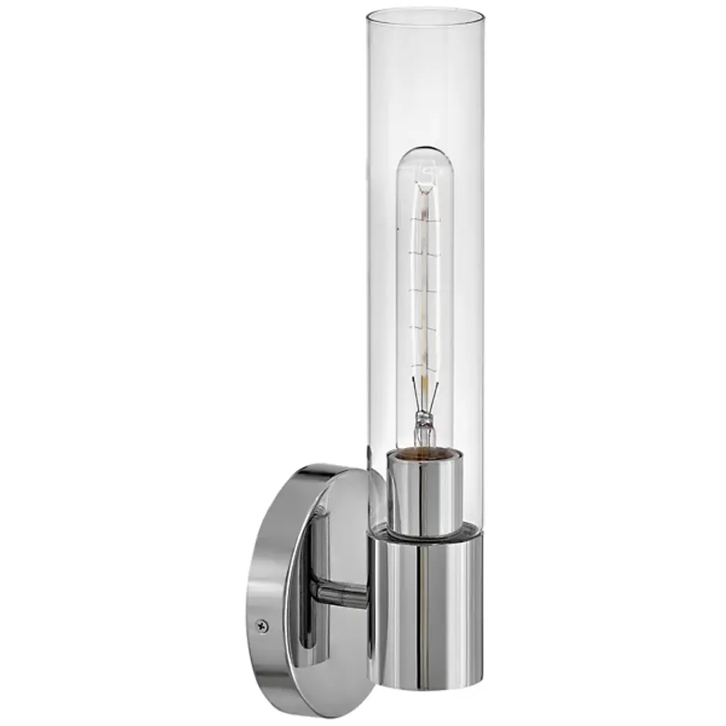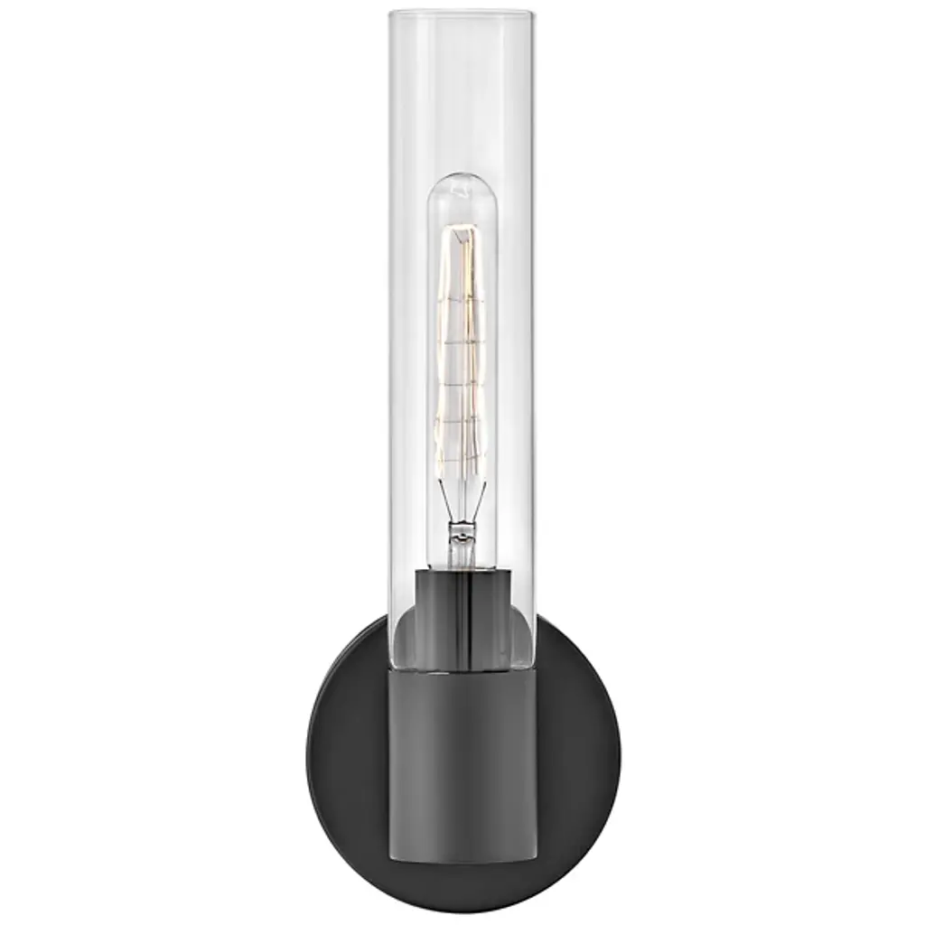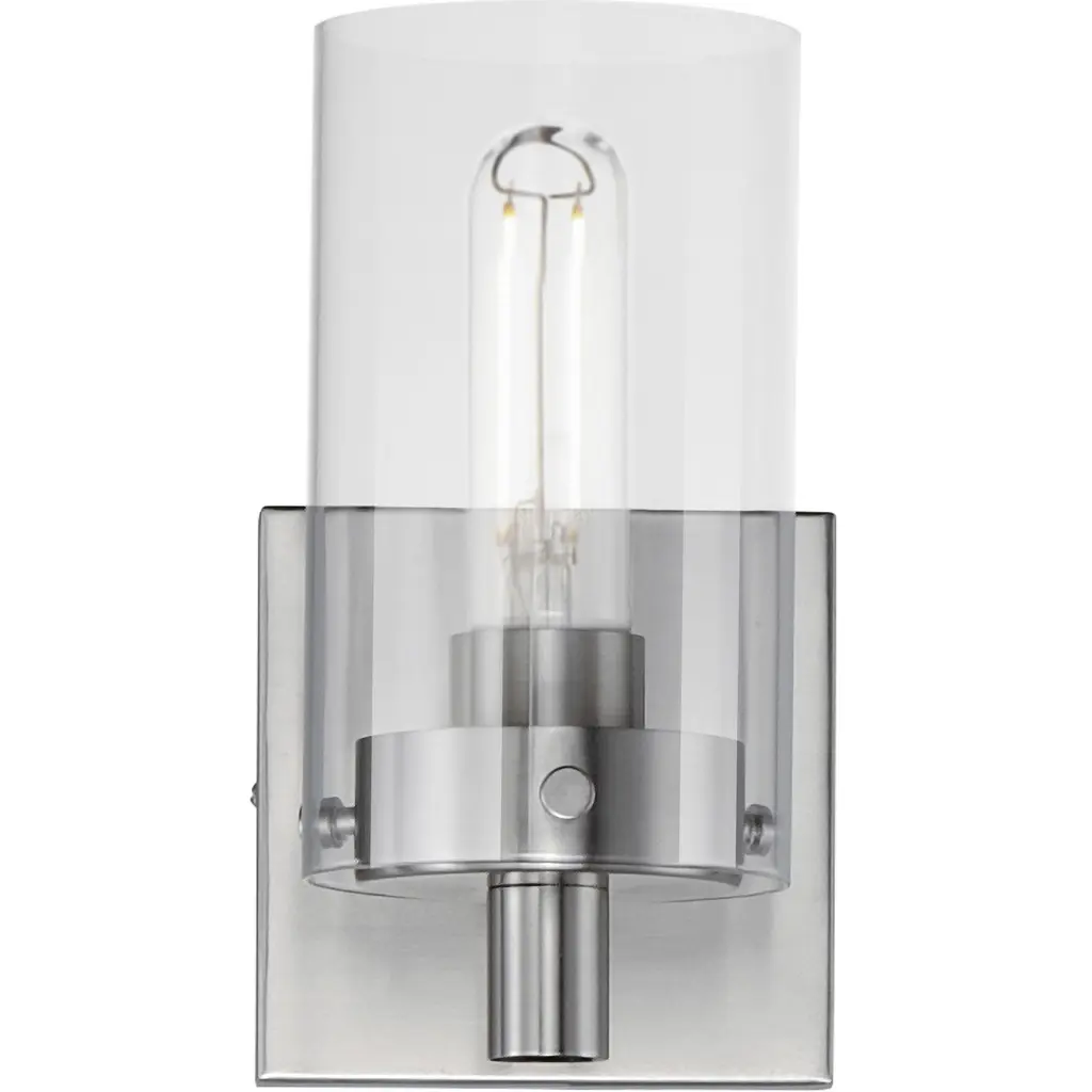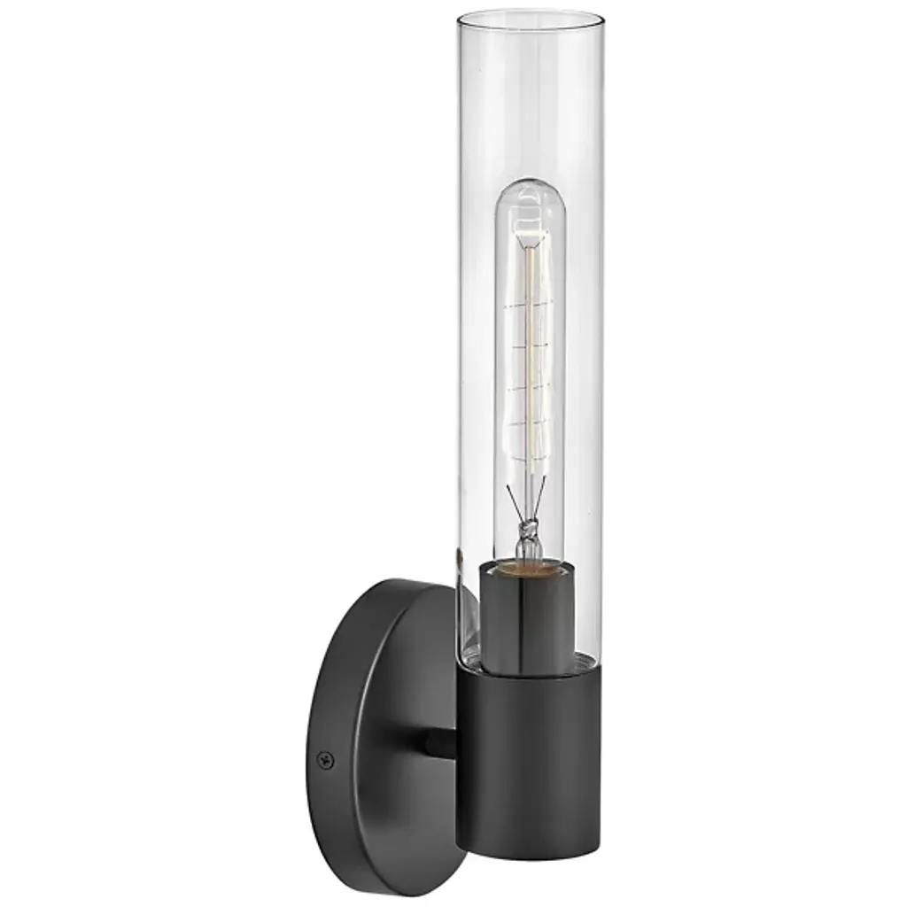 Add elegant ambiance to wall or hallway surfaces with the smooth, retro appeal of the Shea Bath Sconce from Lark. A sleek steel wall mount secures the fixture, sending out a short horizontal rod to a rounded housing for wet-listed and vintage-style lamping placed inside a cylindrical shade of clear glass. The fixture can mount up or down with ease, delivering either a reflected uplight or focused task light below while a wide wash of light extends through the sides of the clear glass shade.