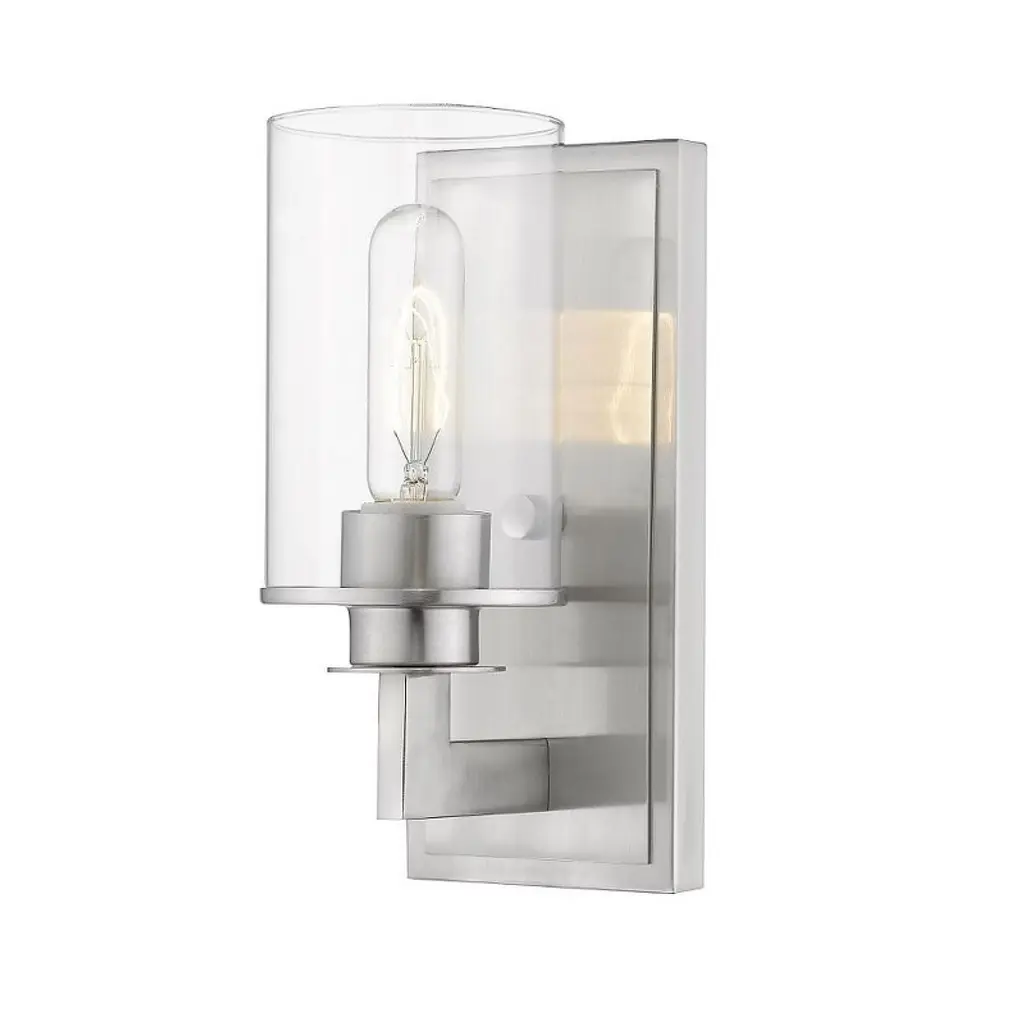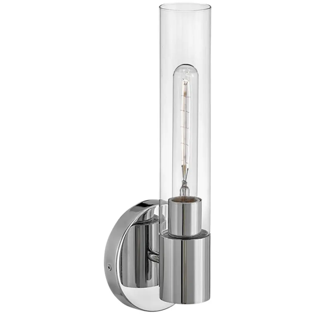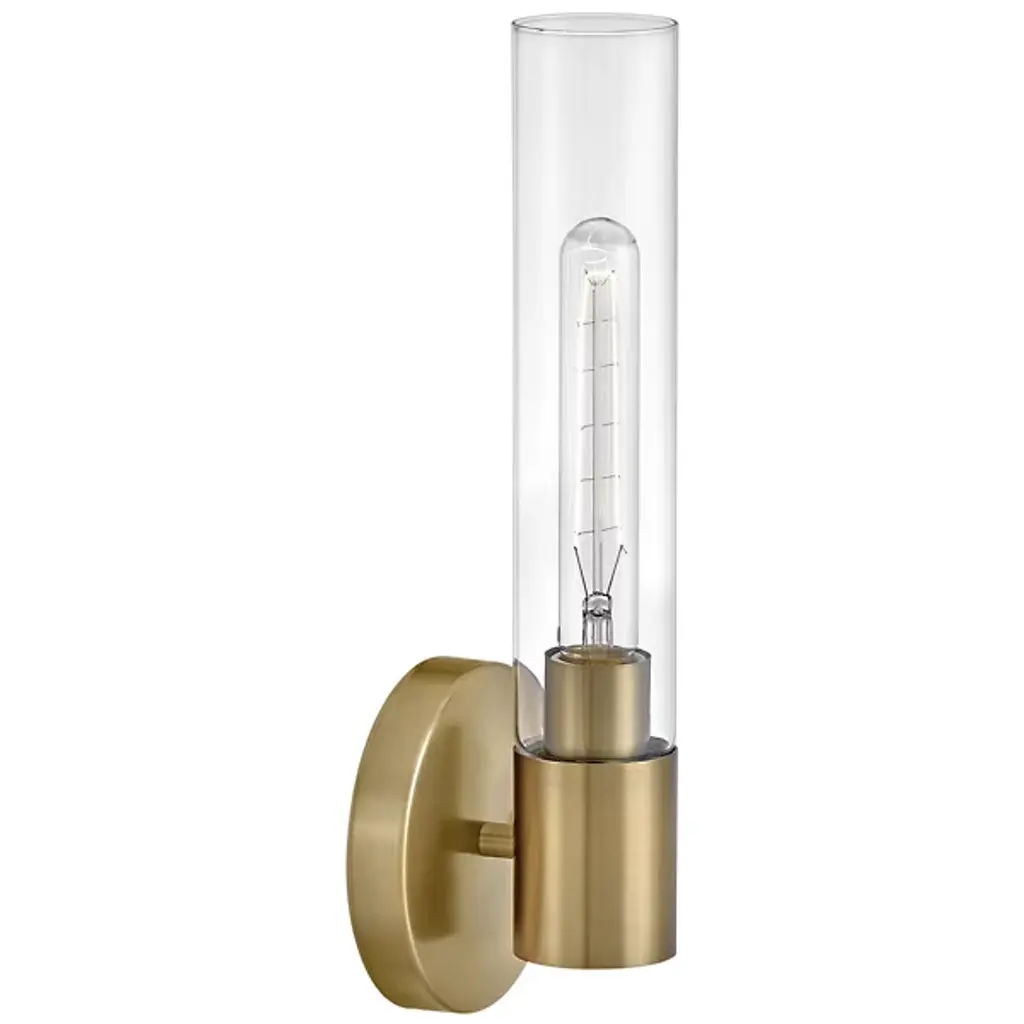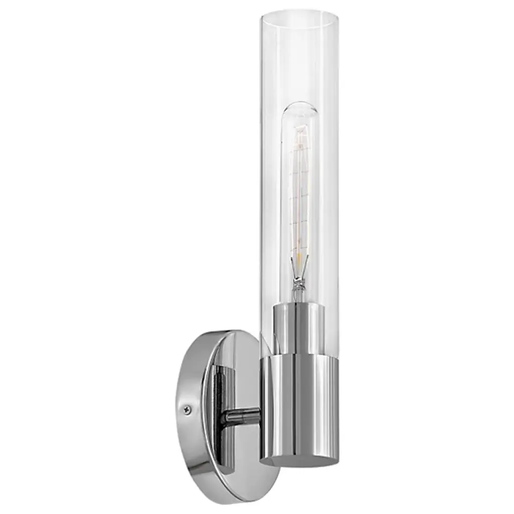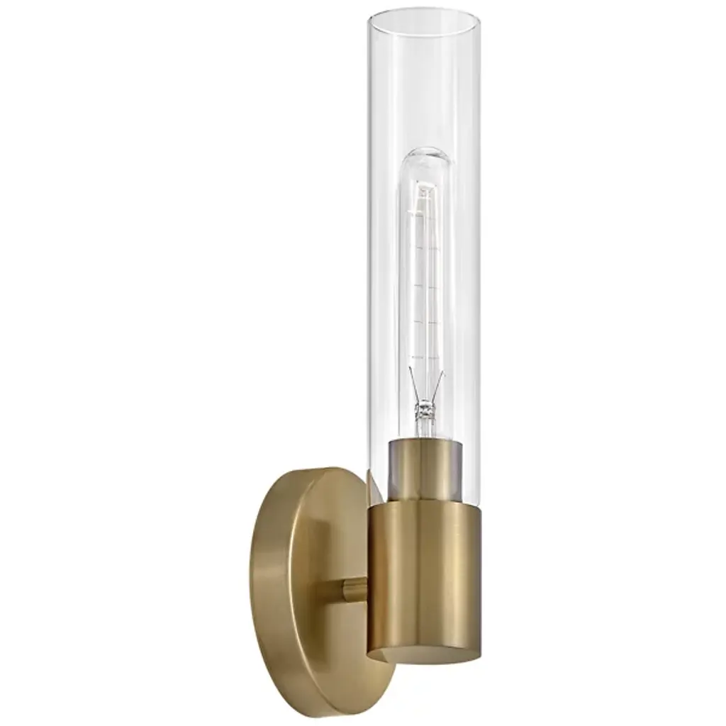 Add elegant ambiance to wall or hallway surfaces with the smooth, retro appeal of the Shea Bath Sconce from Lark. A sleek steel wall mount secures the fixture, sending out a short horizontal rod to a rounded housing for wet-listed and vintage-style lamping placed inside a cylindrical shade of clear glass. The fixture can mount up or down with ease, delivering either a reflected uplight or focused task light below while a wide wash of light extends through the sides of the clear glass shade.