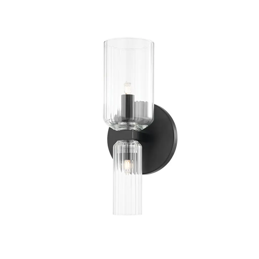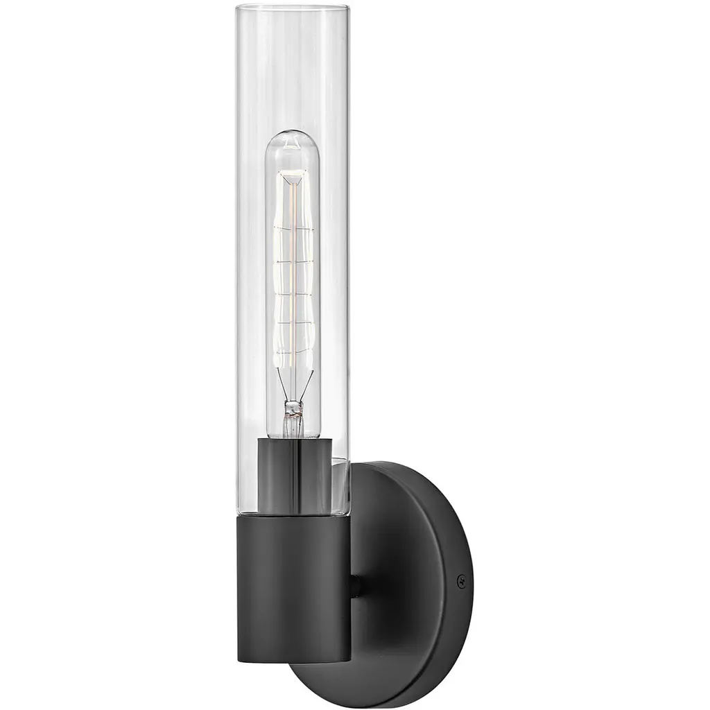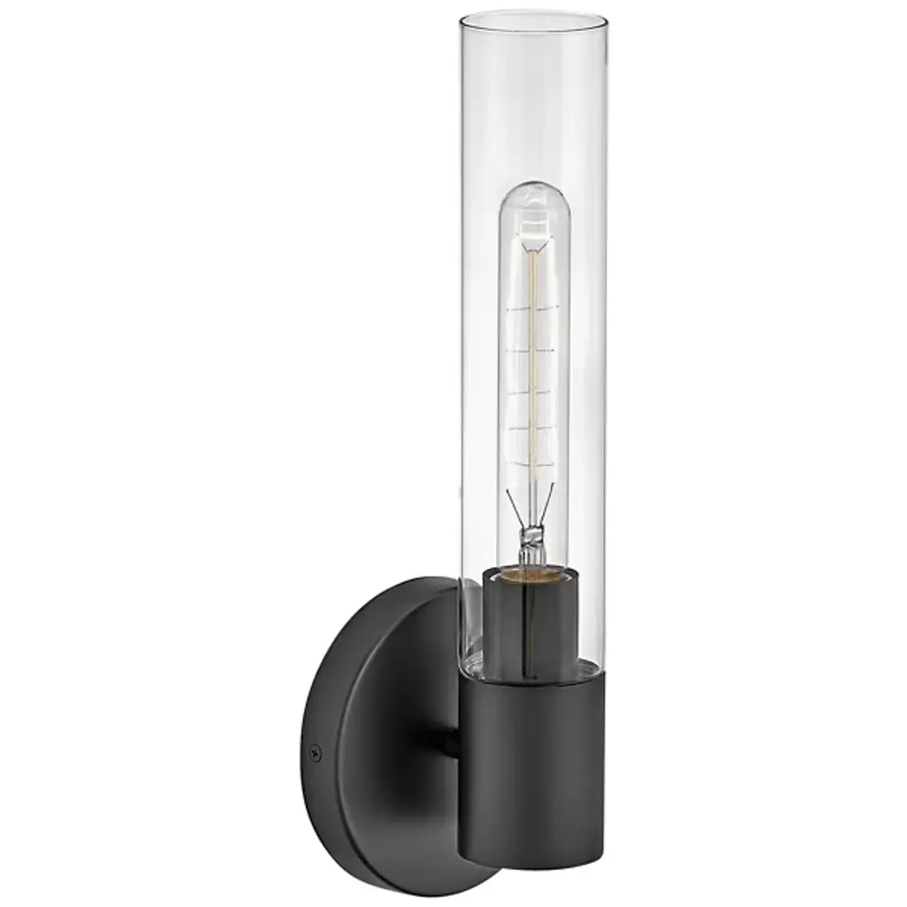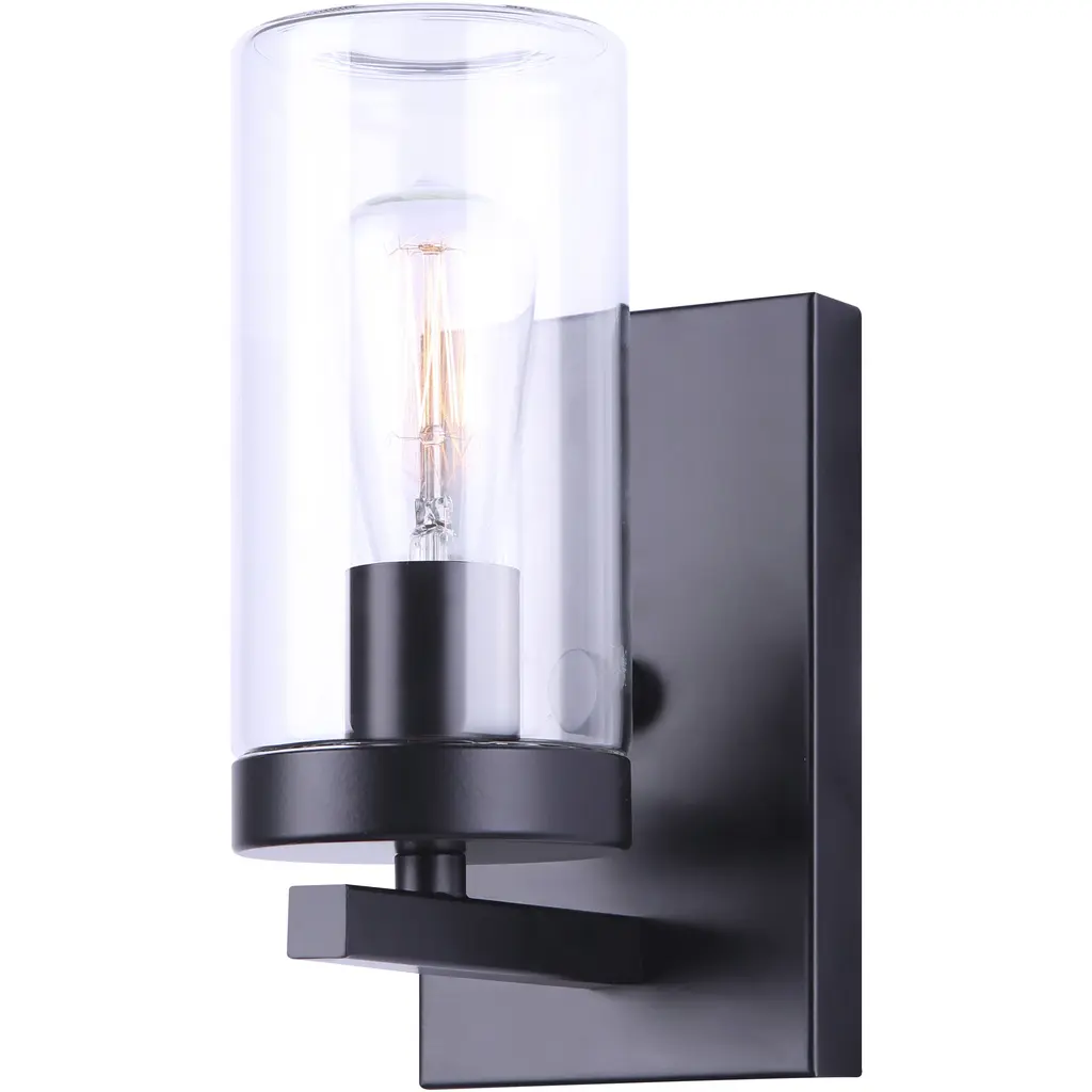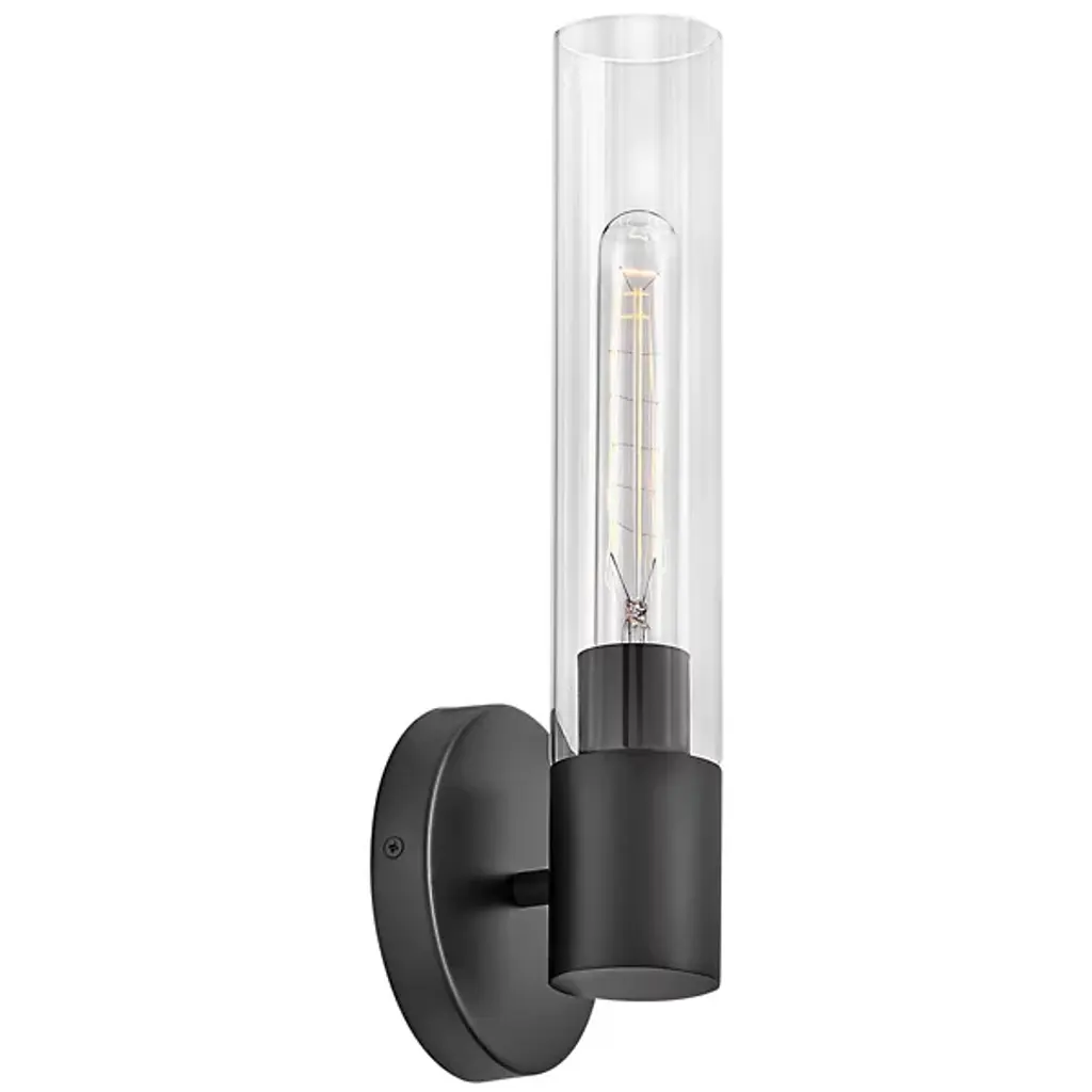 Add elegant ambiance to wall or hallway surfaces with the smooth, retro appeal of the Shea Bath Sconce from Lark. A sleek steel wall mount secures the fixture, sending out a short horizontal rod to a rounded housing for wet-listed and vintage-style lamping placed inside a cylindrical shade of clear glass. The fixture can mount up or down with ease, delivering either a reflected uplight or focused task light below while a wide wash of light extends through the sides of the clear glass shade.