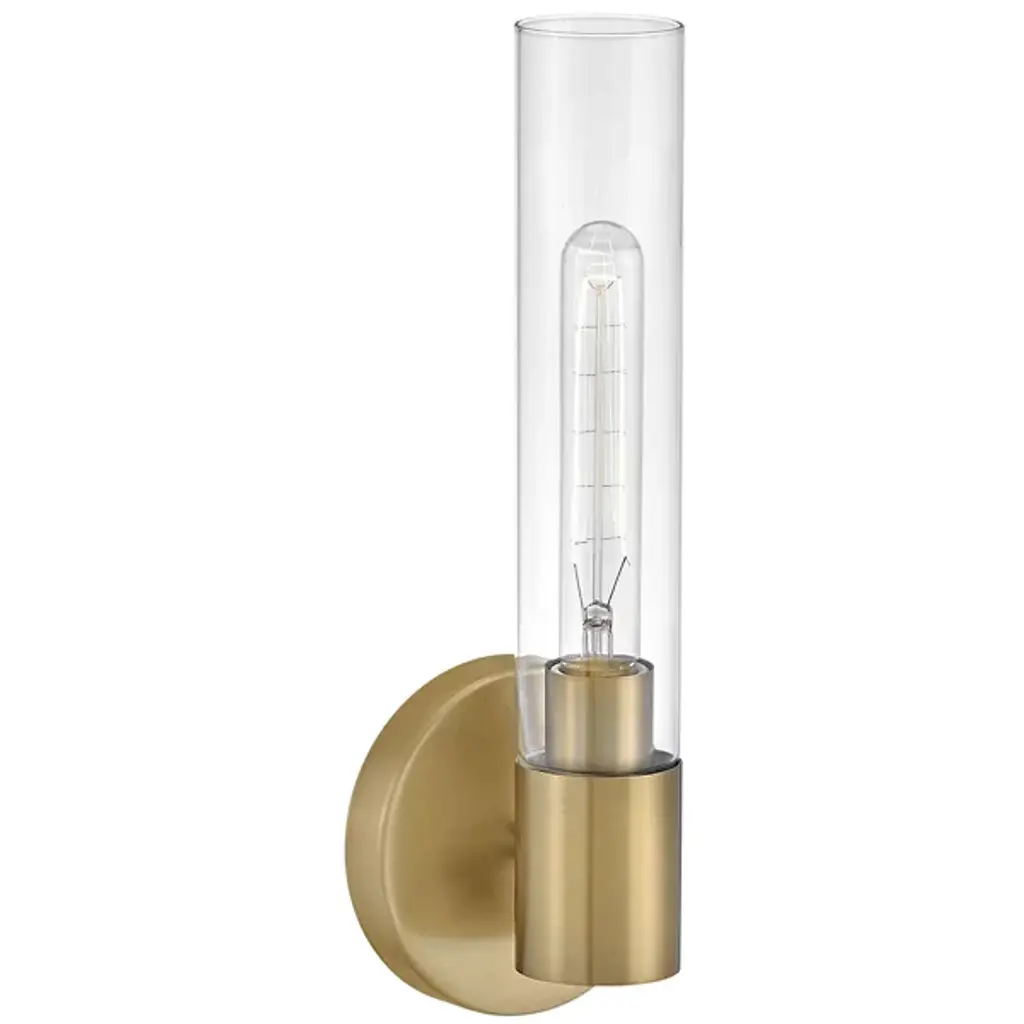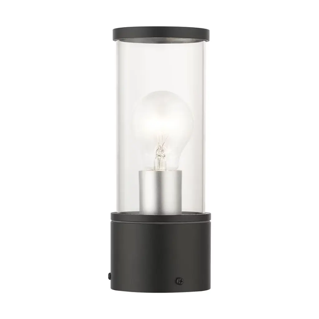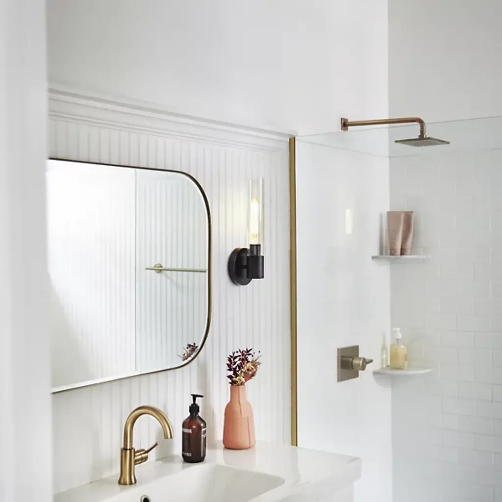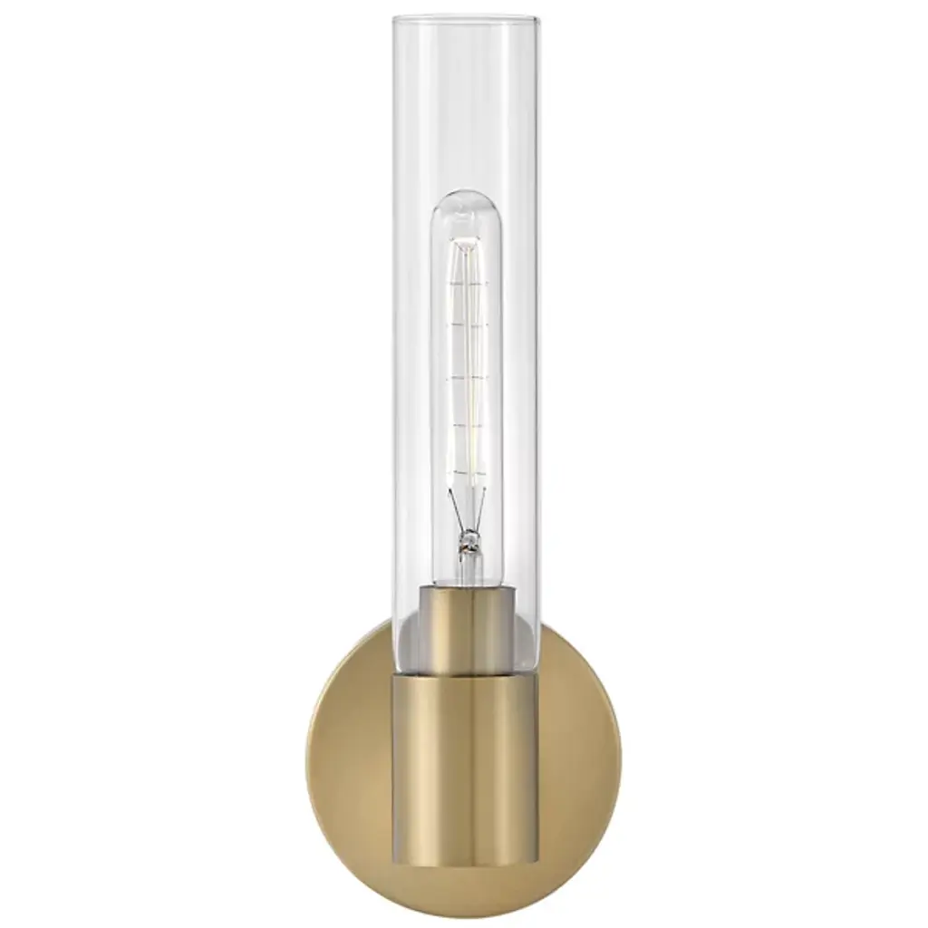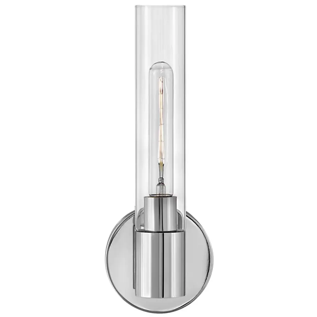 Add elegant ambiance to wall or hallway surfaces with the smooth, retro appeal of the Shea Bath Sconce from Lark. A sleek steel wall mount secures the fixture, sending out a short horizontal rod to a rounded housing for wet-listed and vintage-style lamping placed inside a cylindrical shade of clear glass. The fixture can mount up or down with ease, delivering either a reflected uplight or focused task light below while a wide wash of light extends through the sides of the clear glass shade.