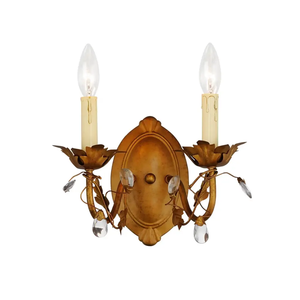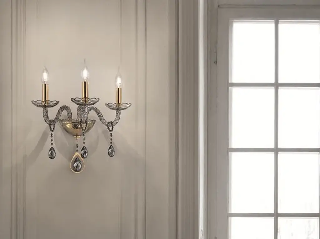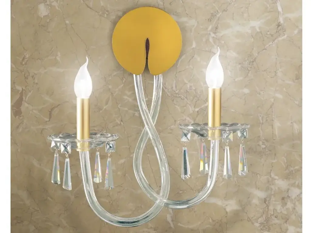 Finish: shiny gold 24K. Other finishes on request.Color: transparent with Sheen effect. Other colors on request.Details: Central body in glass hand-blown, made in Tuscany.Glass cup made in Venice.All glass components are in transparent color and after decorated with gold leaf. This decoration is called Sheen and it is perceptible to the touch and visually.Sheen: Embellished with floral elements, in metal handmade and with silver weldings.They are decorated in 24k gold finish. It’s possible to personalized floral elements by decorating them with colored enamel.Sheen twin : The version without floral elements. Enriched with Swarovski pendant.Shade 34/63 mod. high cone with pvc lurex and brown organza plisse’.Shade 34/64 mod. high cone with brown organza plisse’and pleated ivory fabric.