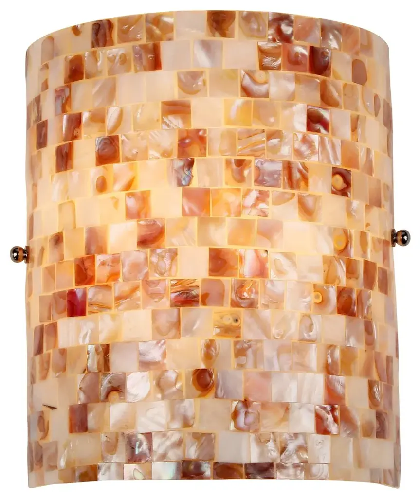 SHELLEY, a beautifully Mission style hand-crafted wall mount sconce with intricate designed and natural sea shell on top of glass shade. Lamp shade design features multi-toned colored pieces. Expertly crafted with top quality materials.(1) 60 Watt max E26 Type A Bulb (not included)Hardwired300 pcs sea shell cutUplightIndoor SettingHarmonized code: 940540Since these are hand crafted products, the exact color of glass pieces may vary. Colors of the glass will appear darker and less vibrant when not illuminated. Light bulbs used in lamps or ambient lighting may affect the appearance of the products. Glass has been protected with mineral oil as part of the finishing process. Please use a soft dry cloth to remove any excess oil.