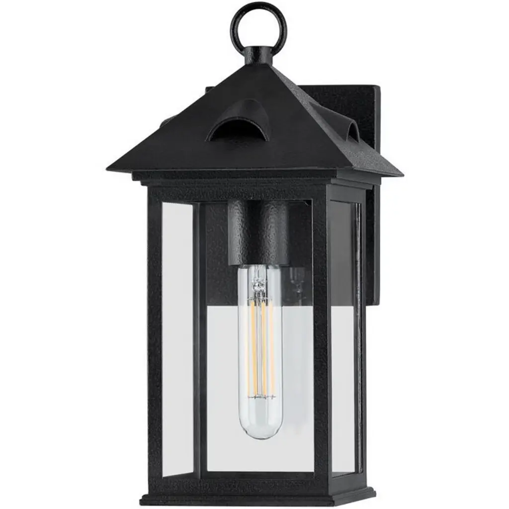 Transform your outdoor spaces with this distinctive wall lantern, where vintage-inspired design meets modern craftsmanship. Built from sturdy iron and softened with frosted glass, this piece blends clean rectangular lines with a gently curved cap and decorative ring. The single vintage-style bulb casts a warm, soothing glow, ideal for creating a welcoming atmosphere. Finished in a versatile matte black, this weather-resistant lantern is as practical as it is stylishperfect for adding character to patios, entryways, or garden paths.