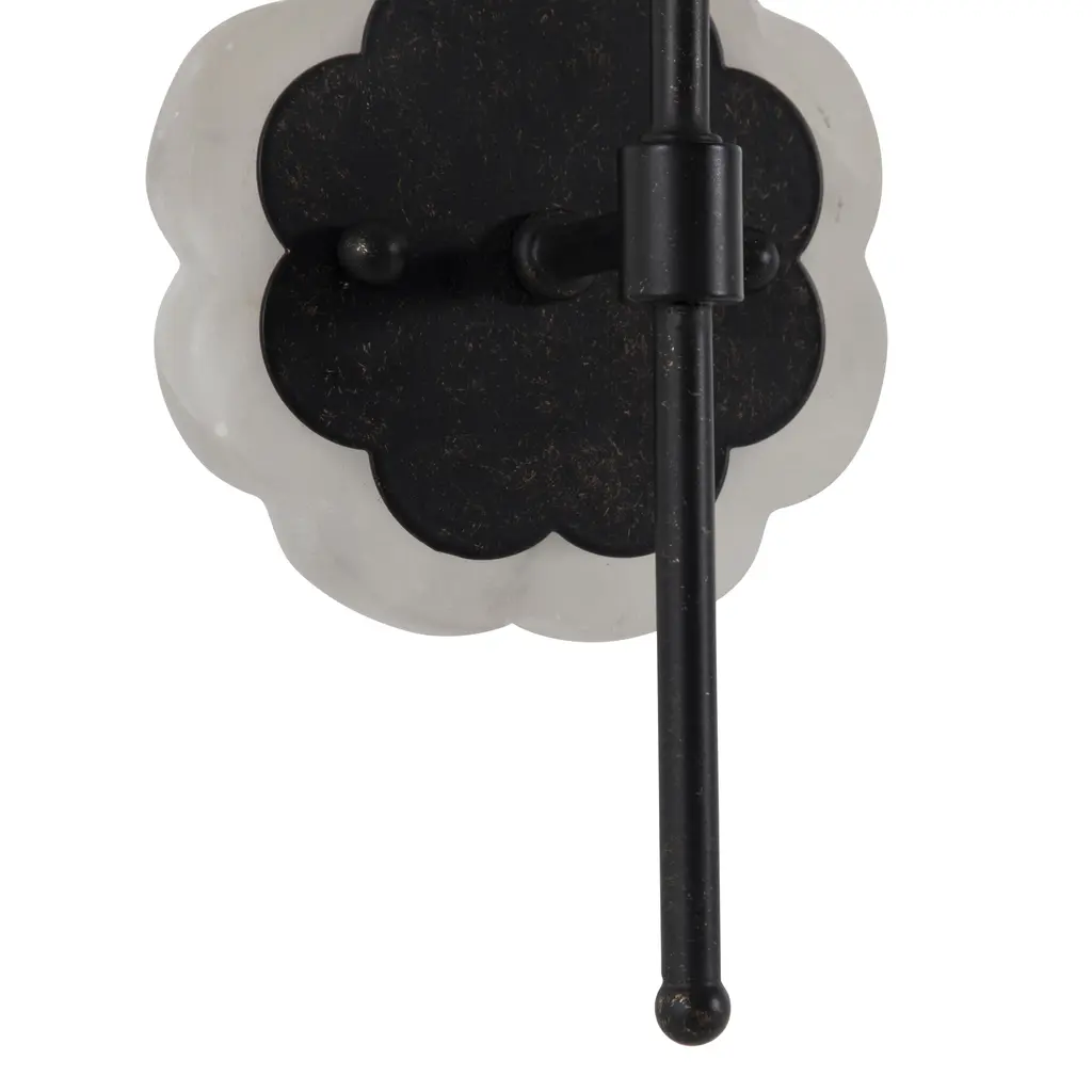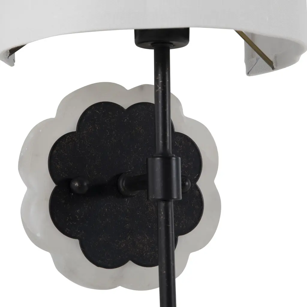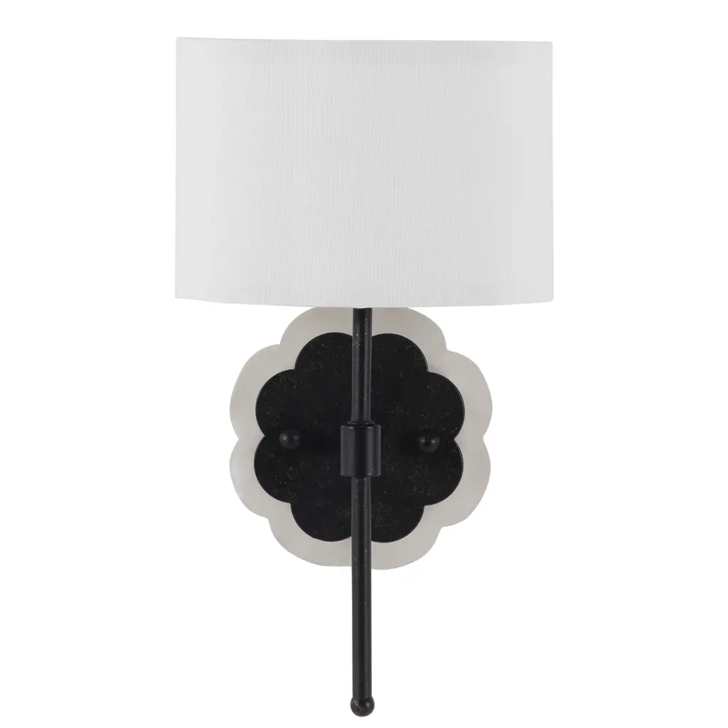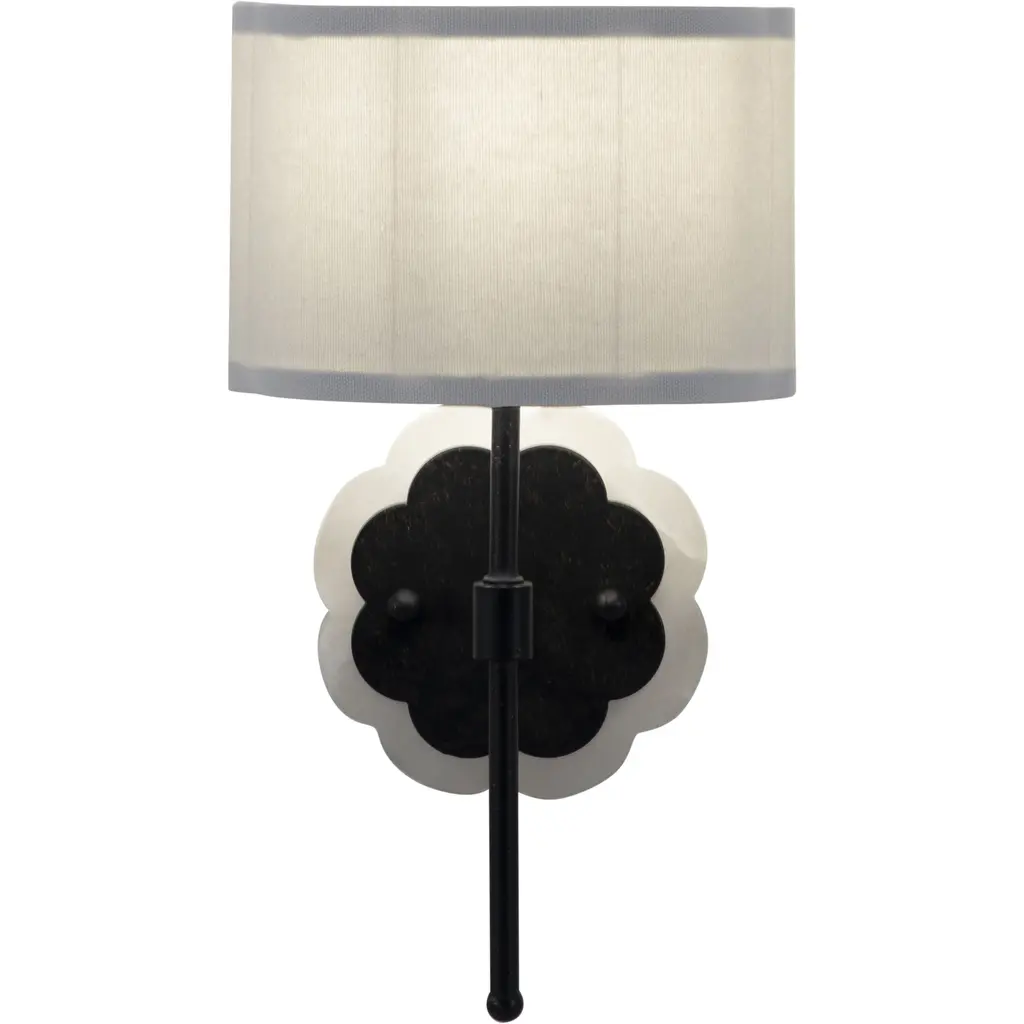 The Shirley Sconce elevates floral motifs to new heights with its miniature and elegant design. The scalloped acrylic backplate and matching demilune shade create a multitude of dainty curves, making this petite wall sconce an elevated piece in any room. Finished in a brushed black hue, it adds a touch of refined elegance to hallways, bedrooms, or living spaces, blending seamlessly with both contemporary and traditional decor. Its ADA-compliant design ensures that it meets the highest standards for accessibility, making it suitable for both residential and commercial settings.