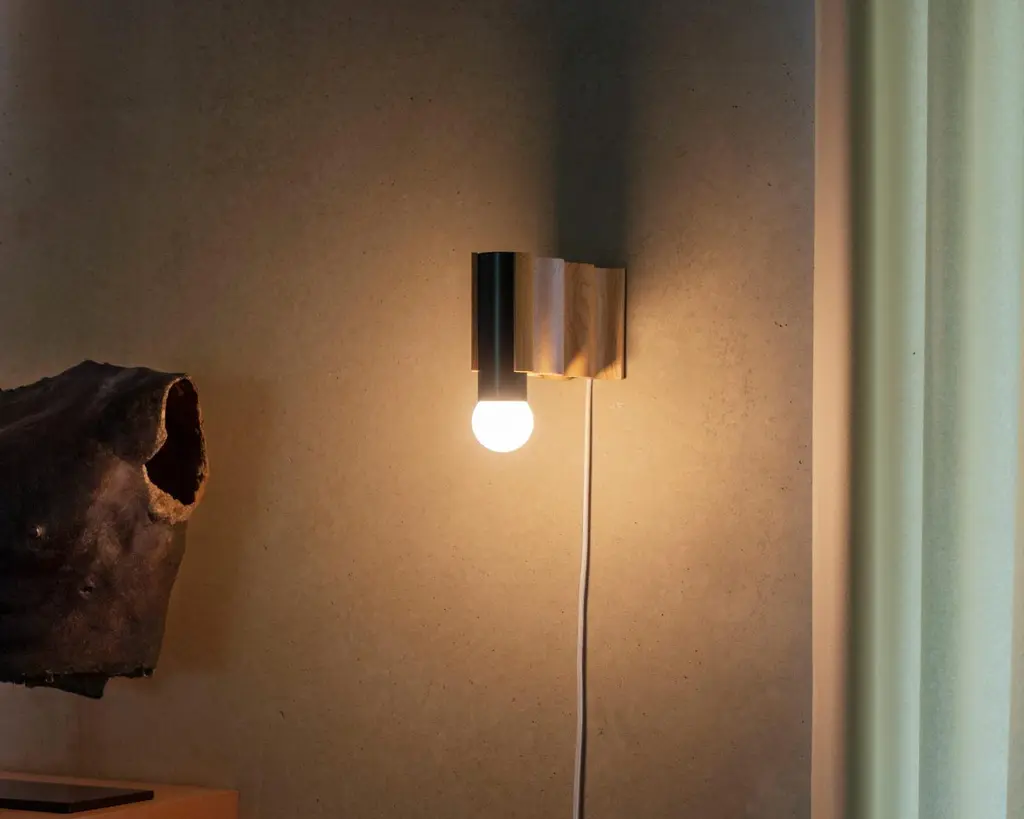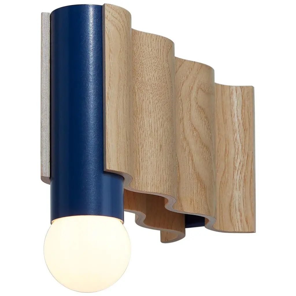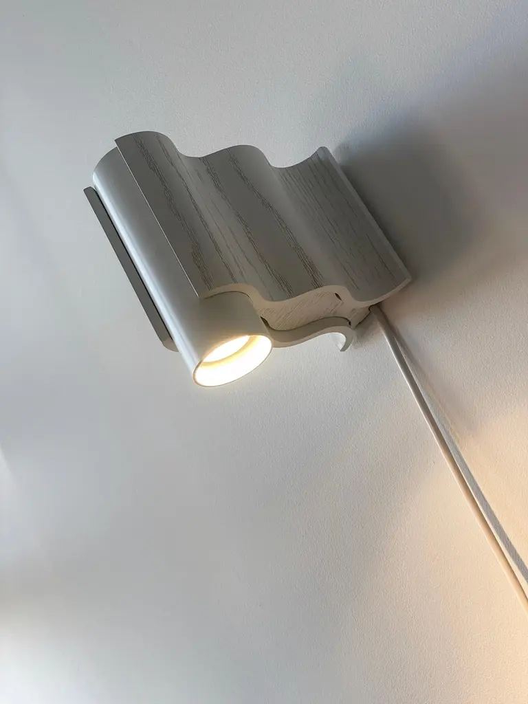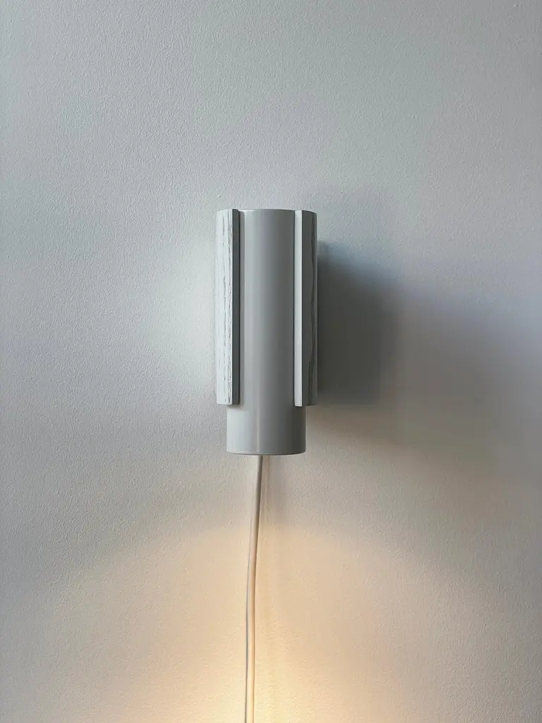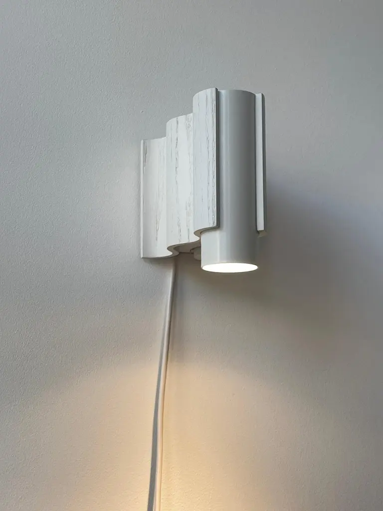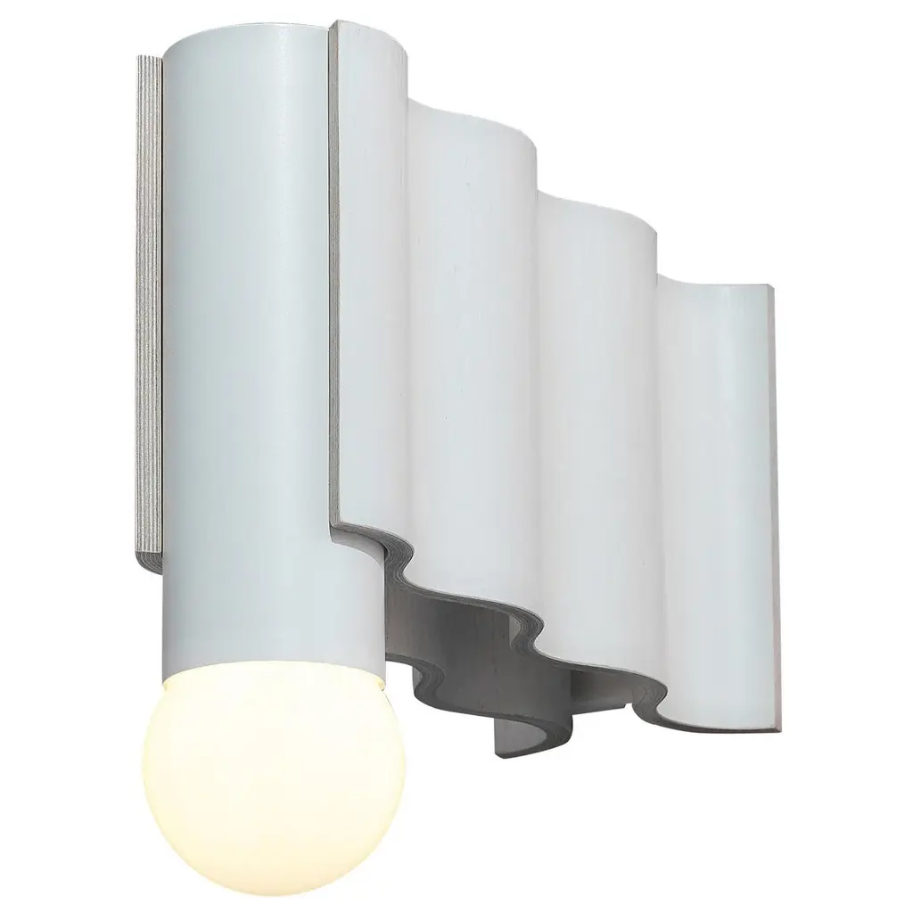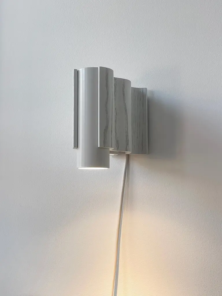Short single sconce made from grey white painted ash veneered plywood and grey white powder-coated aluminium tube.This discounted listing is for this material / colour combination only and is wired for 220 - 240V. Two pieces are available at the discounted price and additional discount can be given if purchased as a pair. Please just get in touch or submit an offer.Technical information:- Comes with dimmable bulb (Class A60, 8W, 720 Lumen, 3000° Kelvin, A+ energy rating, Ra > 80)- Can be connected directly to an outlet box or fitted with a cable and regional plug to be plugged into a socket- The sconce can be installed upside downOther color combinations on both the aluminium tube and the wood veneer are available as well as spot lights inside the tubes instead of protruding bulbs and we are always happy to discuss custom solutions. If you need help planning a bigger installation of Corrugation lights, please feel free to get in touch. The linear light and the wall pieces can be cut to length to fit any space and work harmoniously with their surroundings.The sconce also comes in a longer version - 3 corrugations long. Please find it in our other listing or get in touch for more information.Created in collaboration with Theodora Alfredsdottir, “Corrugation” is a collection of lights inspired by midcentury furniture making, honouring the technique of veneer forming. It consists of a scalable hanging light and wall sconces, which can serve as building blocks to create unique combinations playfully spanning across whole rooms.The collection takes veneer forming as a starting point, a process that requires skilled craftsmanship, which was introduced to the furniture world by design names like Alvar Aalto and the Eames couple, and pairs it with off-the-shelf aluminium tubes. A snug fit where the hard powder-coated metal meets the soft wavy wood and gives the pieces a pleasant contrast.