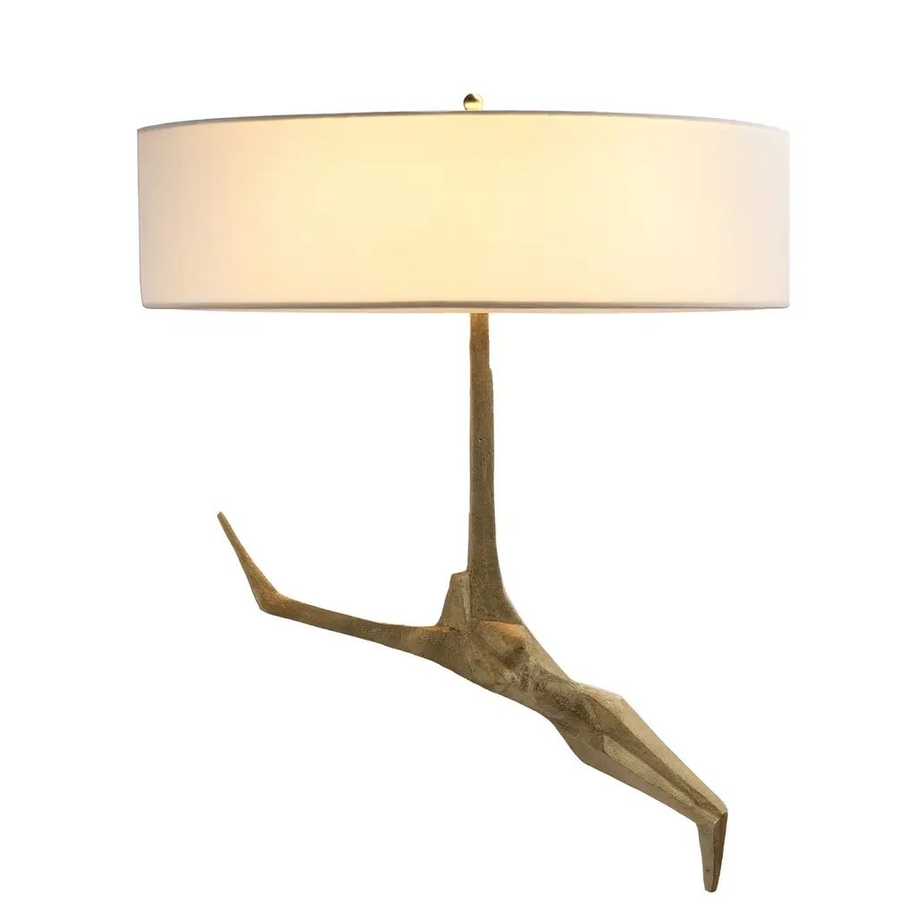 A sublime synthesis between a lighting fixture and a sculpture, this wall lamp seduces with its dynamic and minutely sculpted silhouette reminiscent of a graceful female body. A refined white linen diffuser filters the glow radiating from behind, which provides suffused illumination while enhancing the bronzed structure. A male-inspired counterpart is also available in the Artemest catalog.
