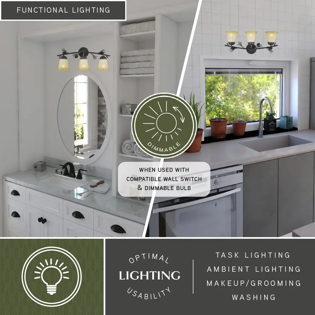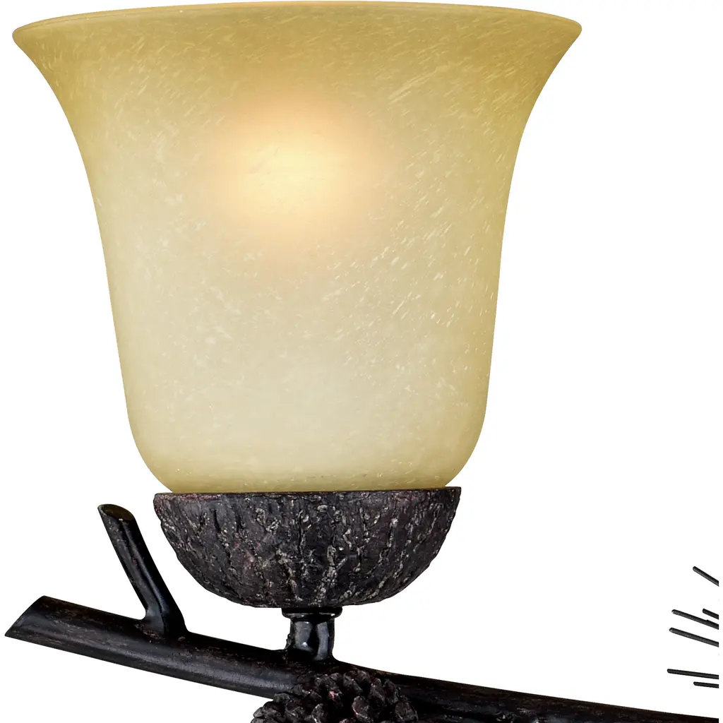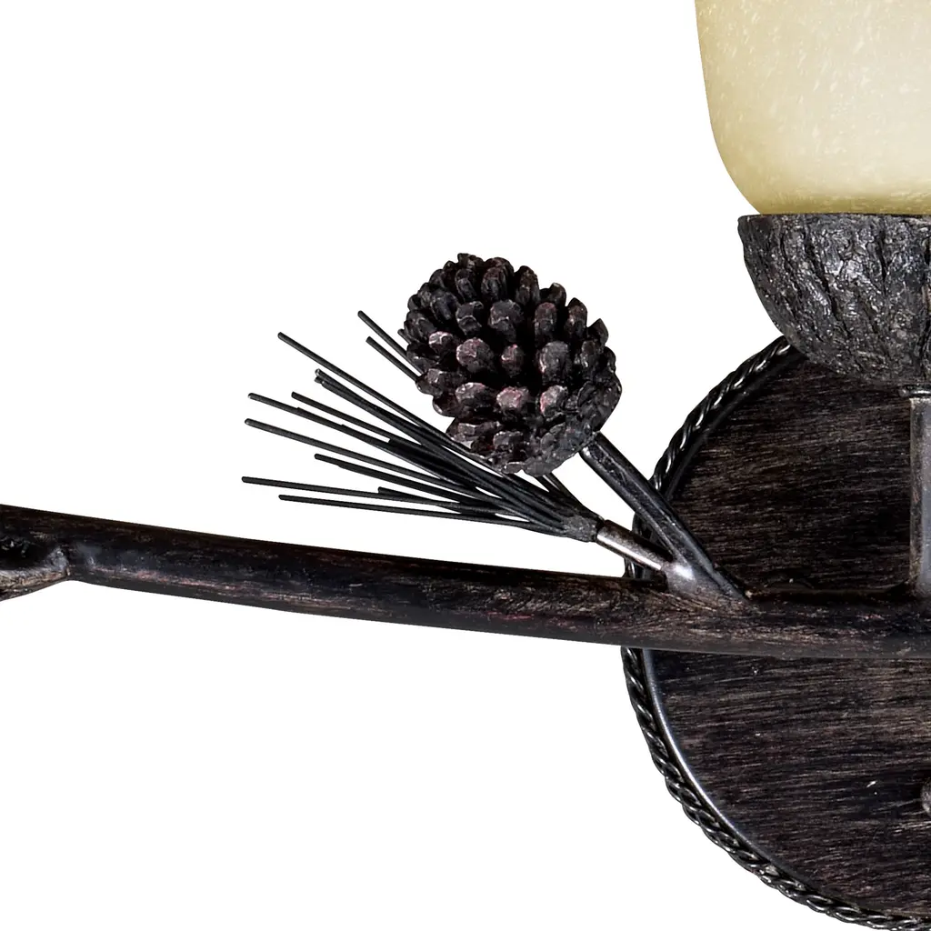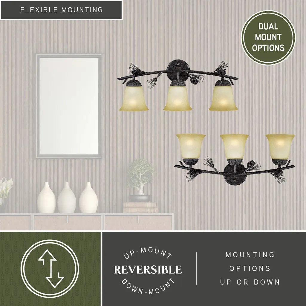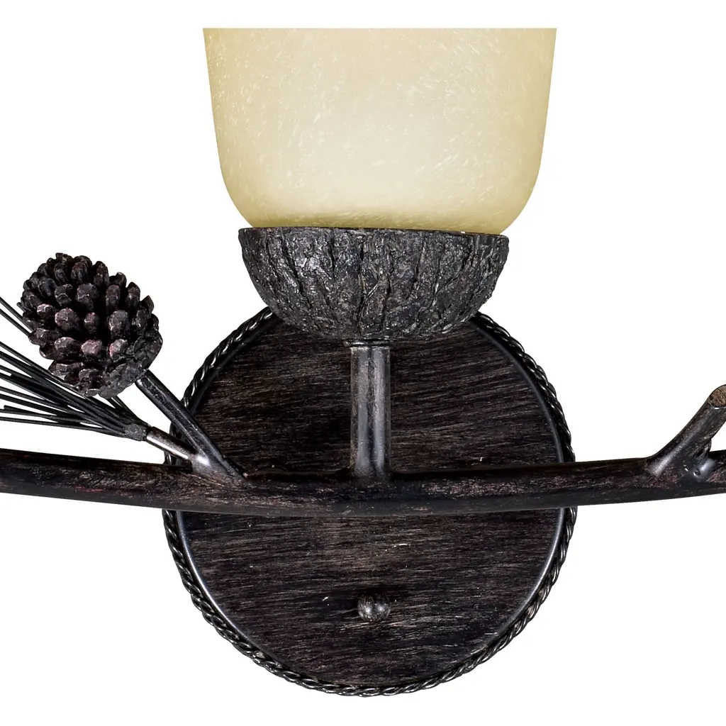 The Sierra collection combines rustic and classic styling that brings nature indoors. This fixture features black walnut finish and frosted scavo glass, with twisted wire rope and pine tree elements. It is a great choice for a vacation lodge, cabin or a suburban home and it will complement a variety of home decors. Versatile reversible mounting option lets you install this fixture up or down.