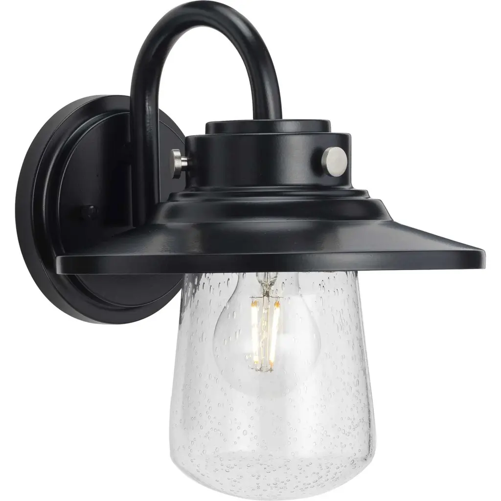 Bring the best of coastal style and farmhouse charm to your home with the Signal Park Outdoor Wall Sconce from Minka-Lavery. Designed after the traditional industrial pieces found in coastal towns, this fixture features a rounded backplate to support its gooseneck arm as it extends to a wide shade. Clear seeded glass surrounds the fixture’s light source, creating a wet look that lends a glistening effect to its light. An oval-shaped cage covers the shade, completing its distinctive style.