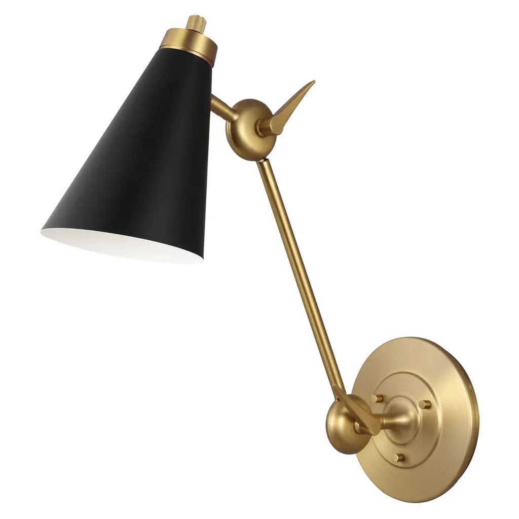 The Signoret Adjustable Wall Sconce by Visual Comfort Studio, formerly known as TOB by Thomas OBrien, brings a handsome blend of form and function to spaces. With a rotatable, adjustable build, this piece is anchored by a round wall plate and supports a movable arm and sleek, tapered shade. Hand-carved from wax, the metal structure of this design takes shape as the wax melts for a tailored look that complements a range of spaces as it allows you to direct a layer of illumination where it is needed.