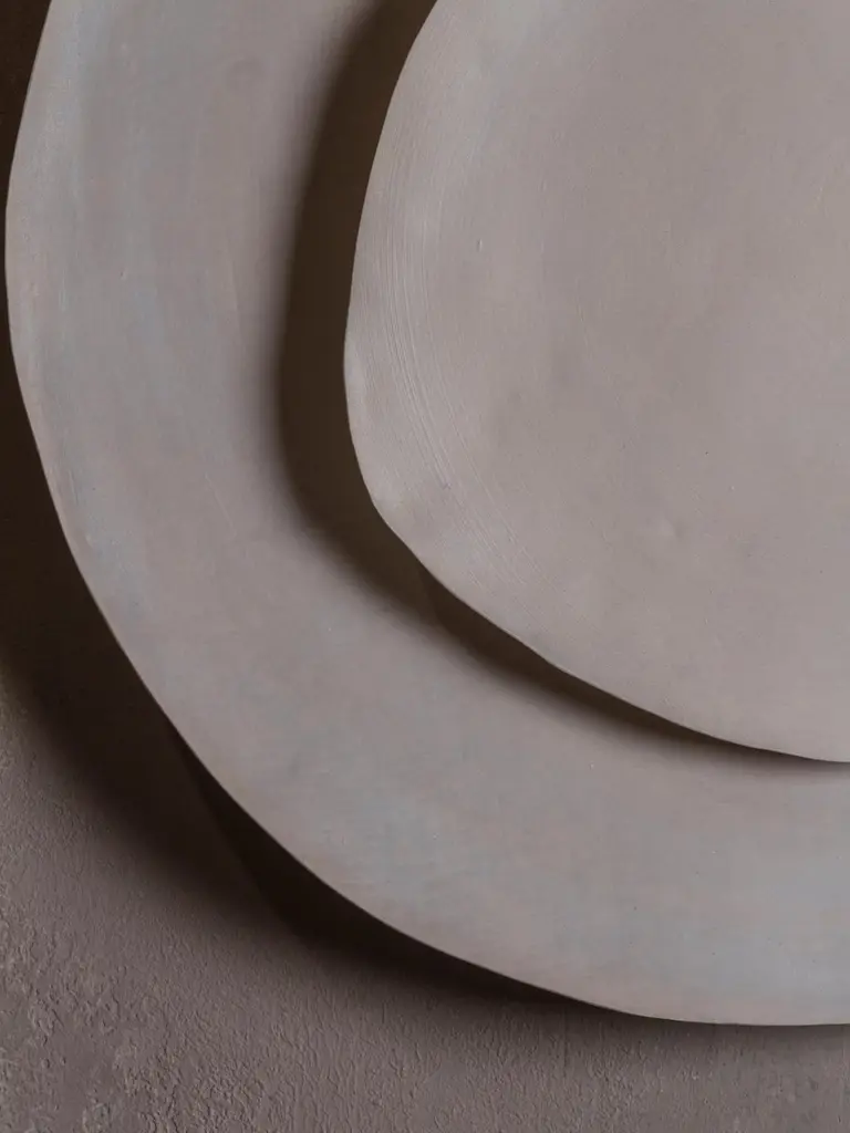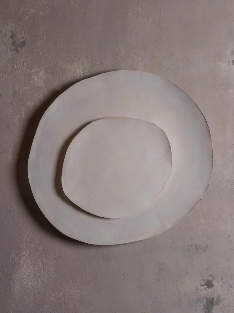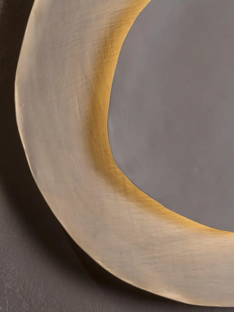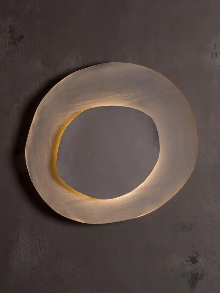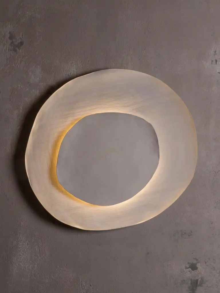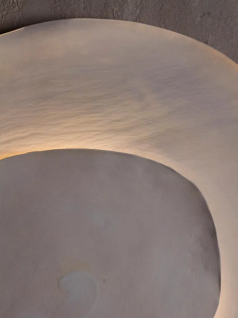 Silk #18 wall light by Margaux LeycurasOne of a Kind. Signed and numbered.Dimensions: Ø 51 x H 56 cm.Material: Ceramic, sandy stoneware platters with a porcelain slip finish.The piece is signed, numbered and delivered with a certificate of authenticity.The collection of unique pieces - illuminated wall sculptures – Eclipse, was born from the combination of an exploration of the ceramic material and its limits, and a desire to create pieces which elevate the space and contribute to create an atmosphere.All our lamps can be wired according to each country. If sold to the USA it will be wired for the USA for instance. Please contact us.Margaux Leycuras"My ceramic workshop is located in Bordeaux, France. It is dedicated to my ceramic practice. To make my line of dinnerware and sculptures, I use various traditional building techniques; such as the potter's wheel, slab and coil building. I only use high-temperature clays such as stoneware and porcelain. These clays are fired between 1230°c and 1300°c to reach their maturity and vitrify. The practice of ceramics requires patience: you have to learn to respect the material and the different stages of making process.".