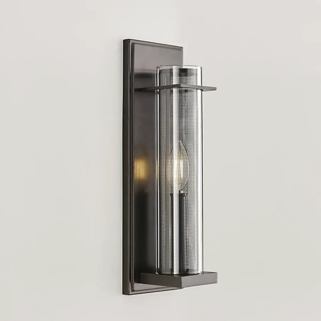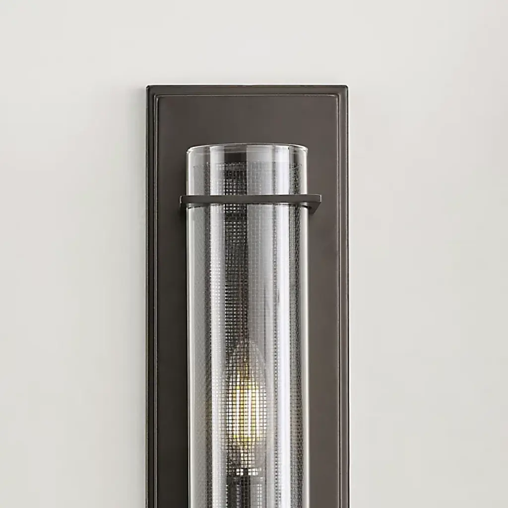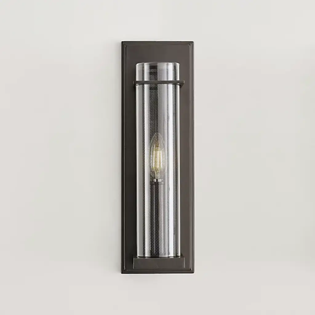 Bold and beautiful. The Silo Wall Sconce by Visual Comfort Studio, formerly known as Sean Lavin, stands up to its name with a tall, cylindrical, double-shade that showcases a metal mesh interior layered with an outer glass shade. Inside this textured composition, a single candelabra illuminates this fixture, lending spaces a welcoming layer of light. Anchored to the wall by a rectangular backplate, a square base supports the shades of this wall sconce as a uniform finish completes the silhouette.