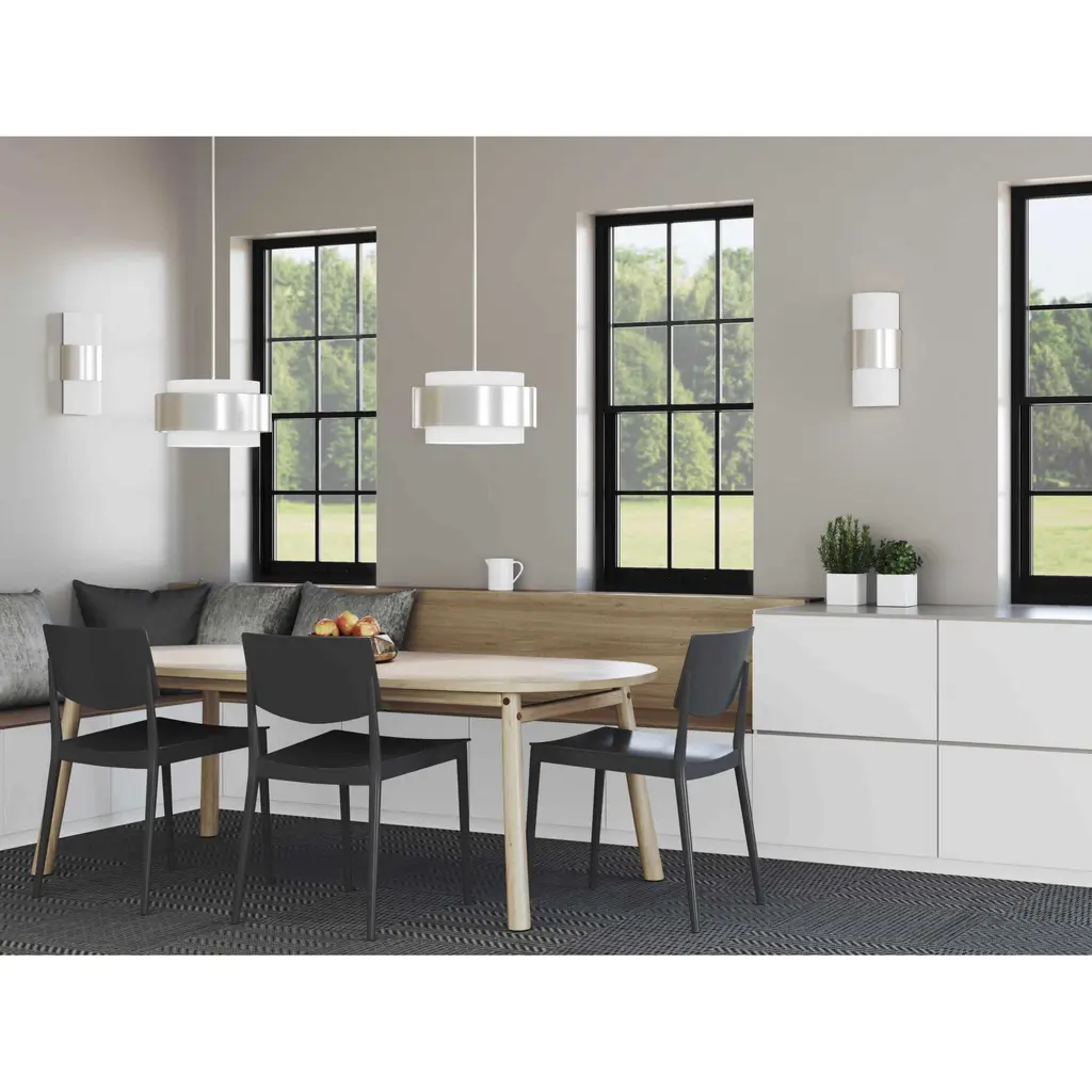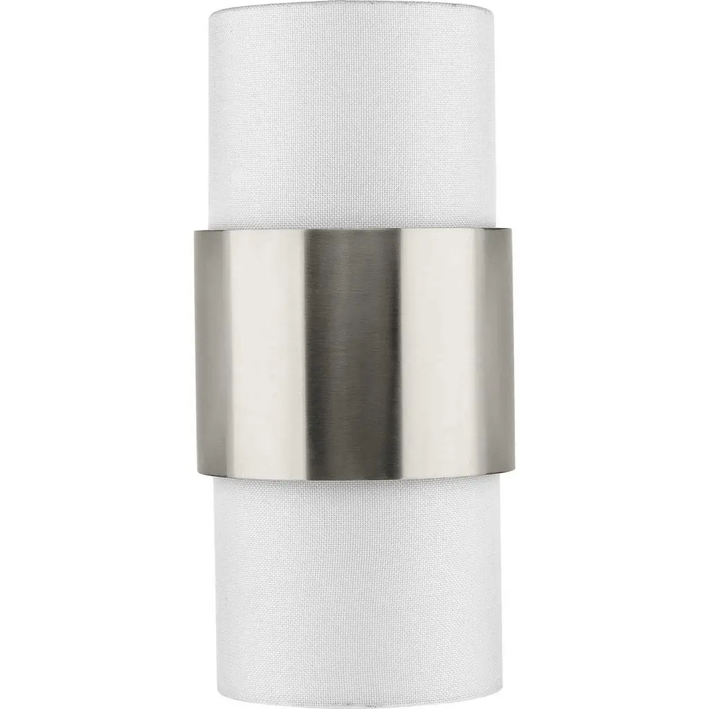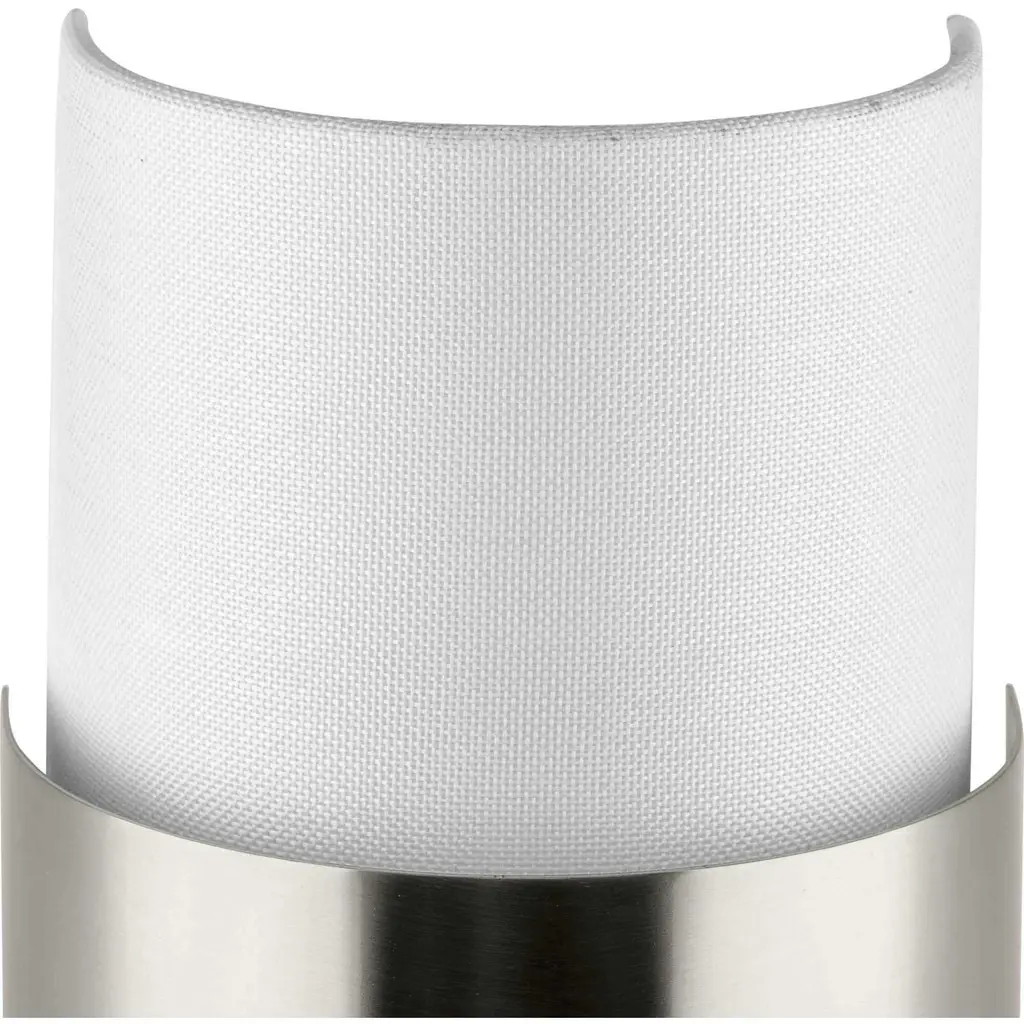 The Silva Collection uses a dramatic contrast of finish and material to present a captivating design. A white linen shade encompassed by a stunning metallic drum coated in a subtle brushed nickel finish establishes a clean, modern, uplifting statement. This fixture is part of the Progress Lighting Design Series, a lighting collection offering fashionable styles and affordable luxury lighting for the home.