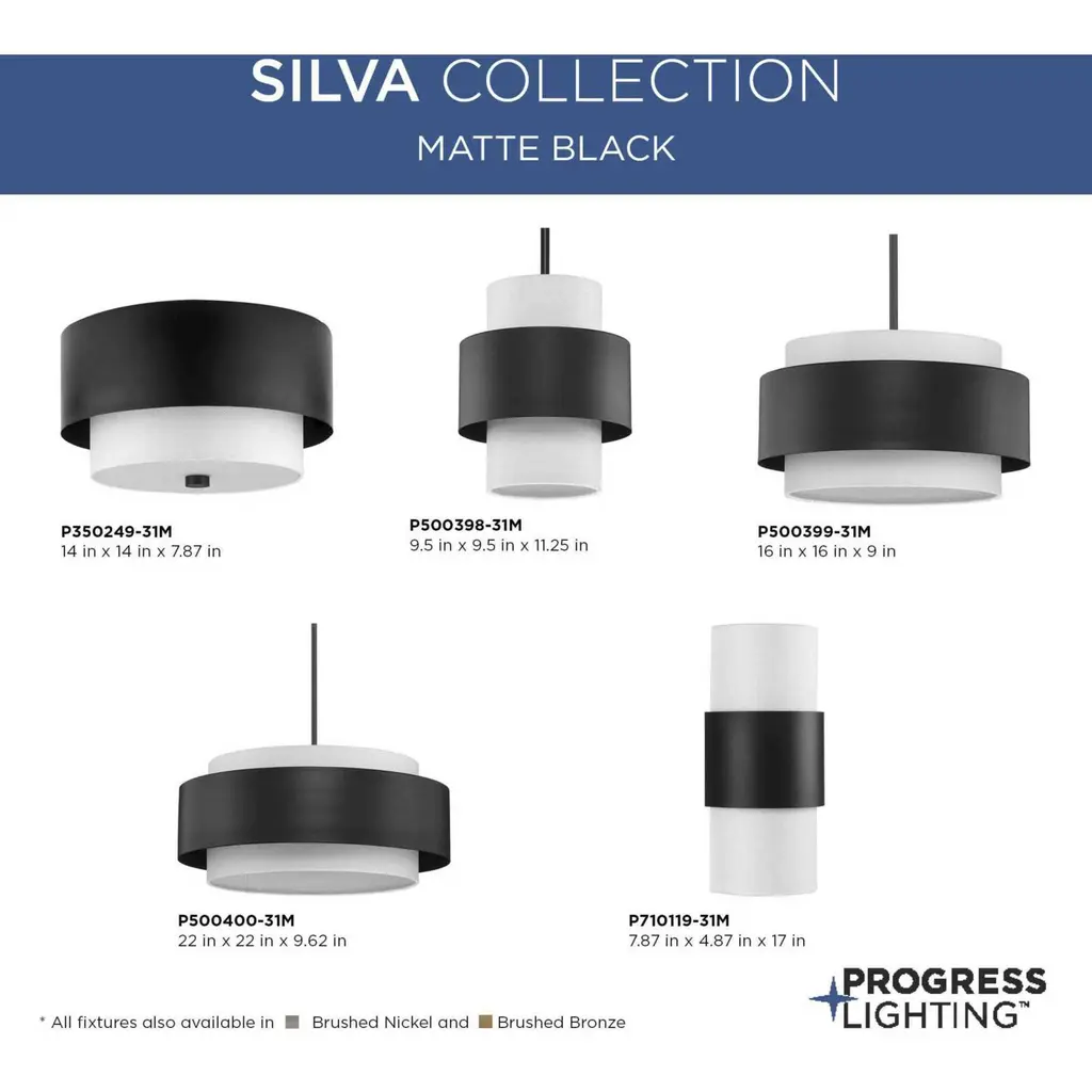 The Silva Collection uses a dramatic contrast of finish and material to present a captivating design. A white linen shade encompassed by a stunning metallic drum coated in asp matte black finish establishes a clean, modern, uplifting statement. This fixture is part of the Progress Lighting Design Series, a lighting collection offering fashionable styles and affordable luxury lighting for the home.