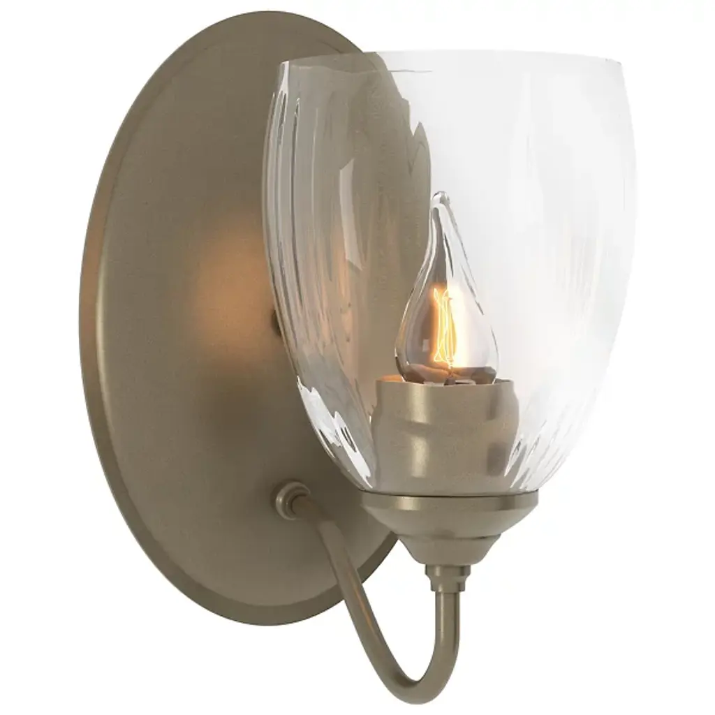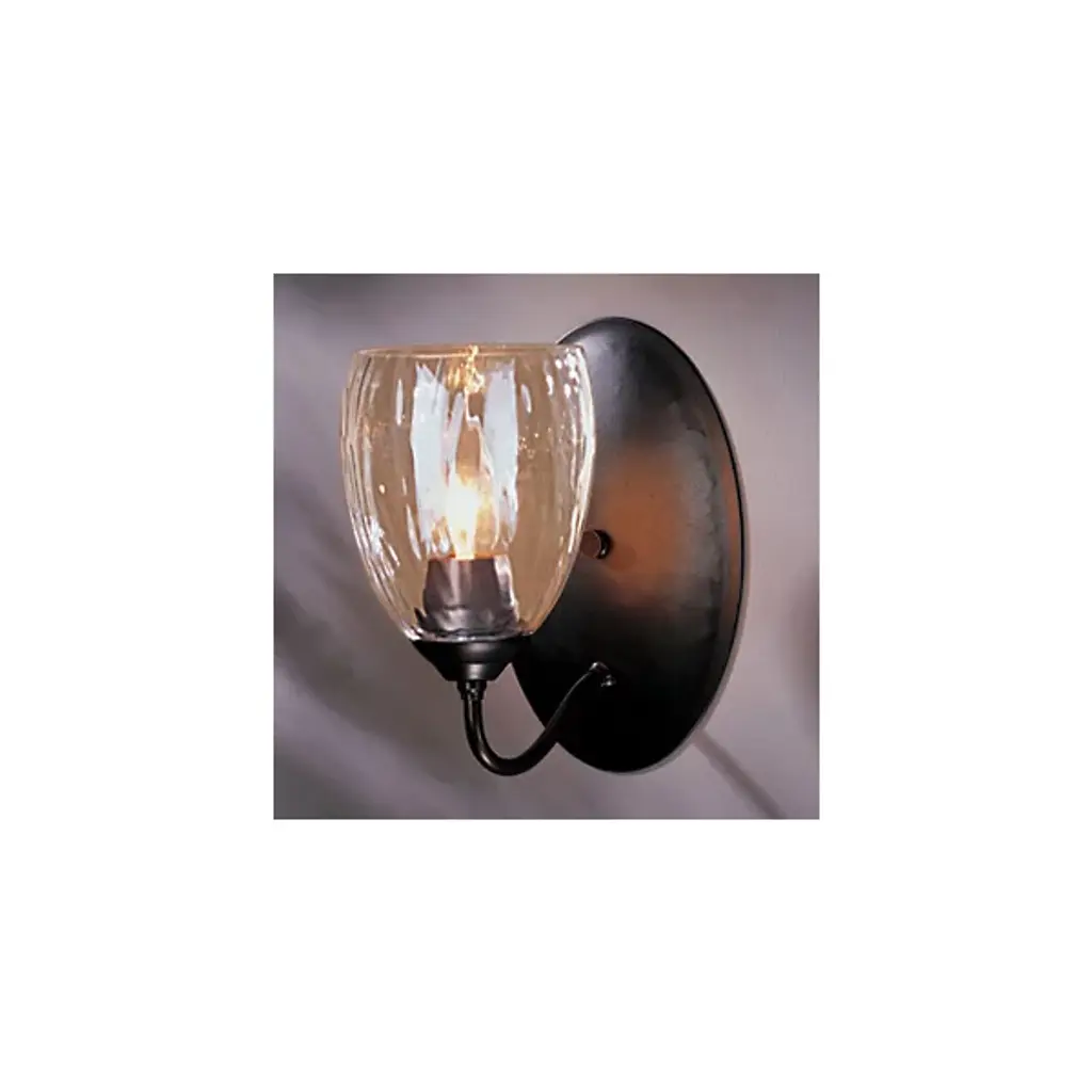 The Hubbardton Forge Simple Lines Single Wall Sconce with Water Glass enhances interior decor with a layer of crisp illumination and an elegant design element rich with handcrafted appeal. The Simple Lines Single Wall Sconce with Water Glass features Water hand-blown glass shade and hand-forged wrought iron body.