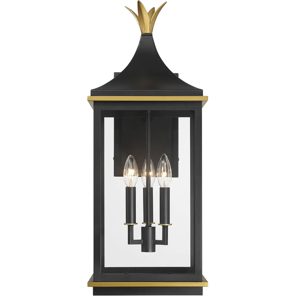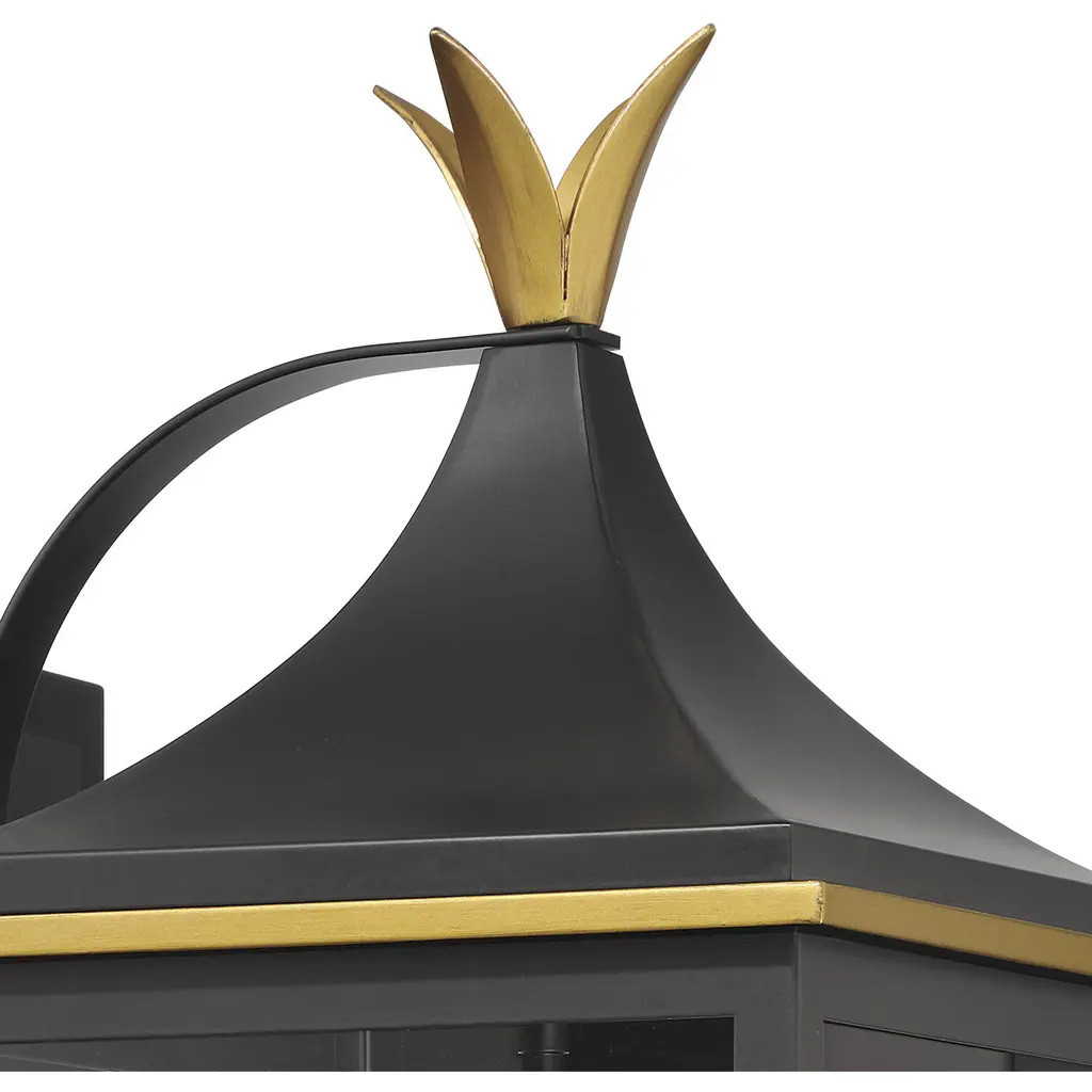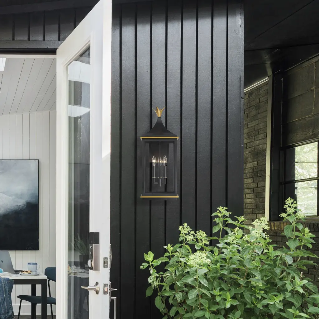 The Simpson Outdoor Collection features a lantern-style design with a two-tone finish. Its elongated rectangular frame, elegant glass panels, and candelabra bulbs create a classic look with a contemporary edge. The collection includes two options for customizing the top: a gold crown cap for a traditional flair or a sleek angled loop for a more contemporary appearance. This versatile design adds a stylish touch to any outdoor setting.