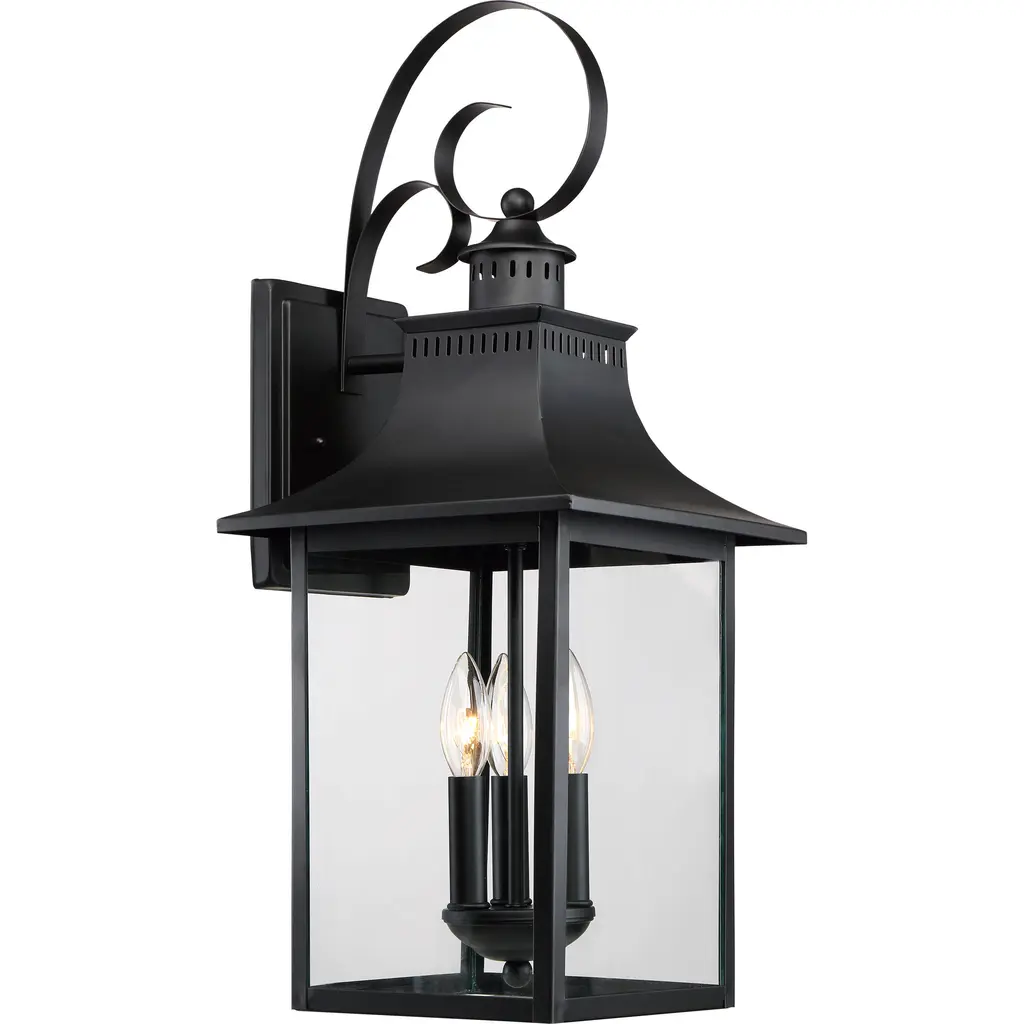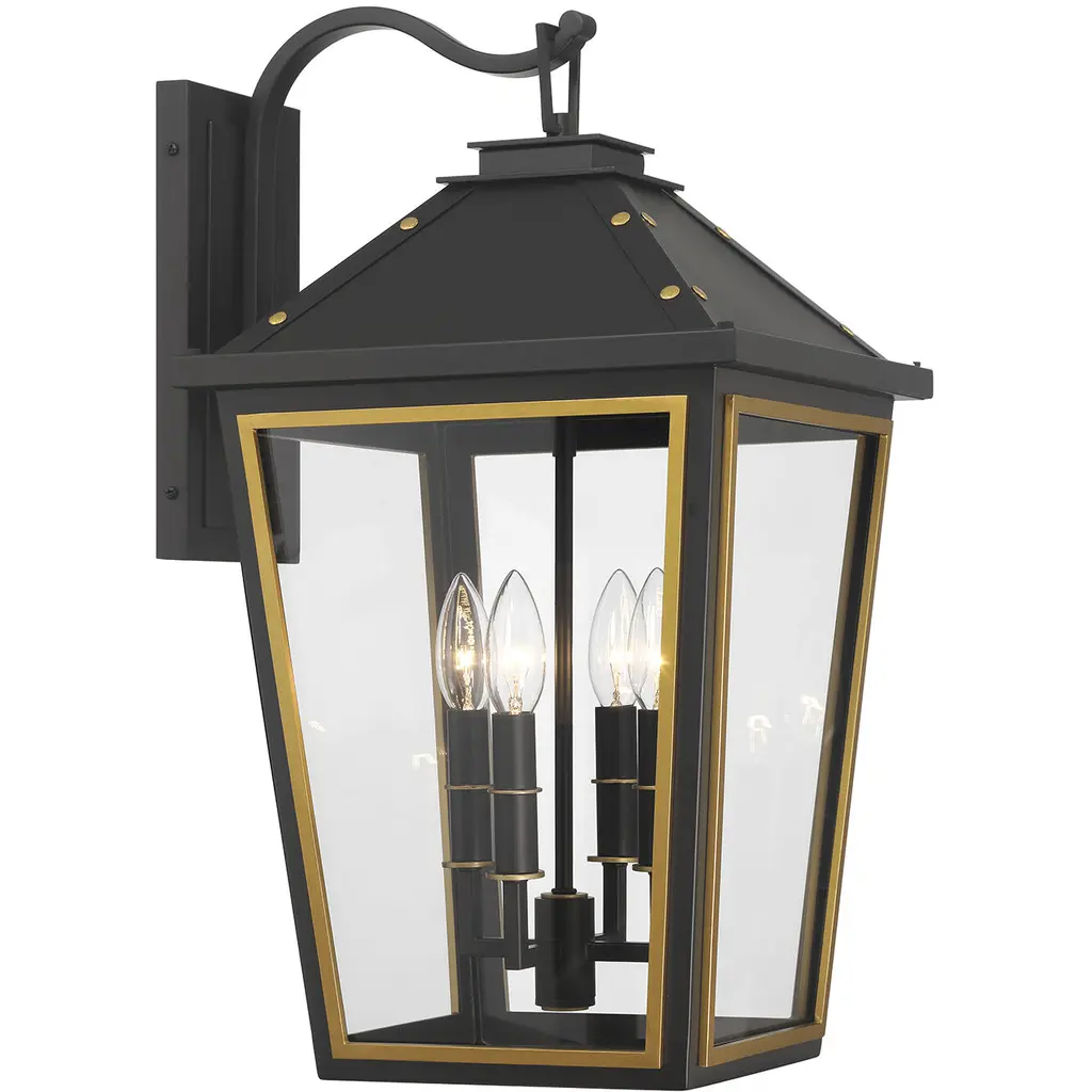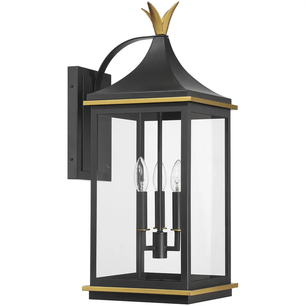 The Simpson Outdoor Collection features a lantern-style design with a two-tone finish. Its elongated rectangular frame, elegant glass panels, and candelabra bulbs create a classic look with a contemporary edge. The collection includes two options for customizing the top: a gold crown cap for a traditional flair or a sleek angled loop for a more contemporary appearance. This versatile design adds a stylish touch to any outdoor setting.