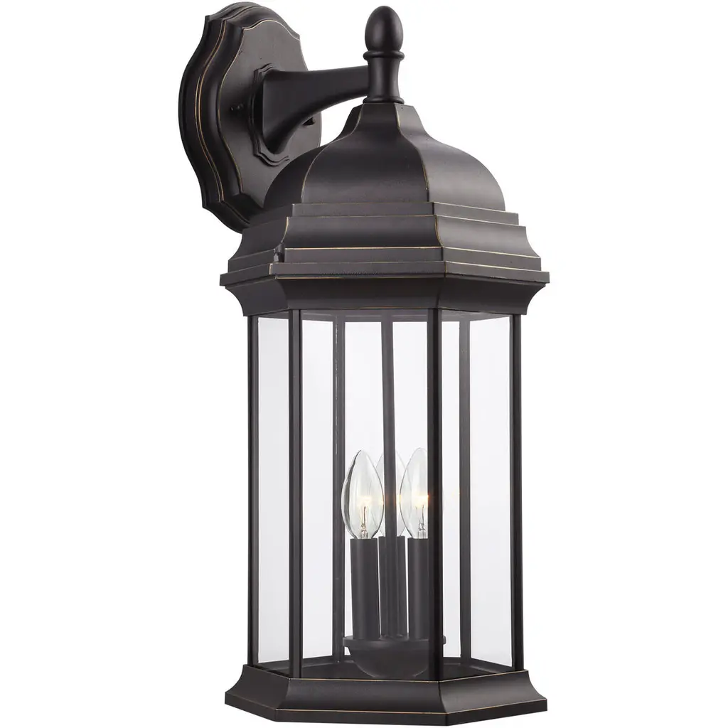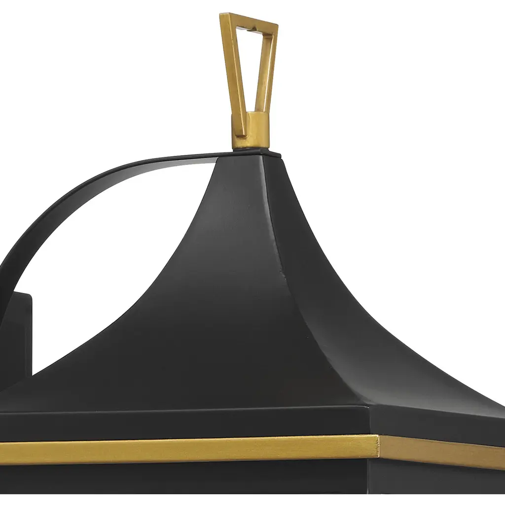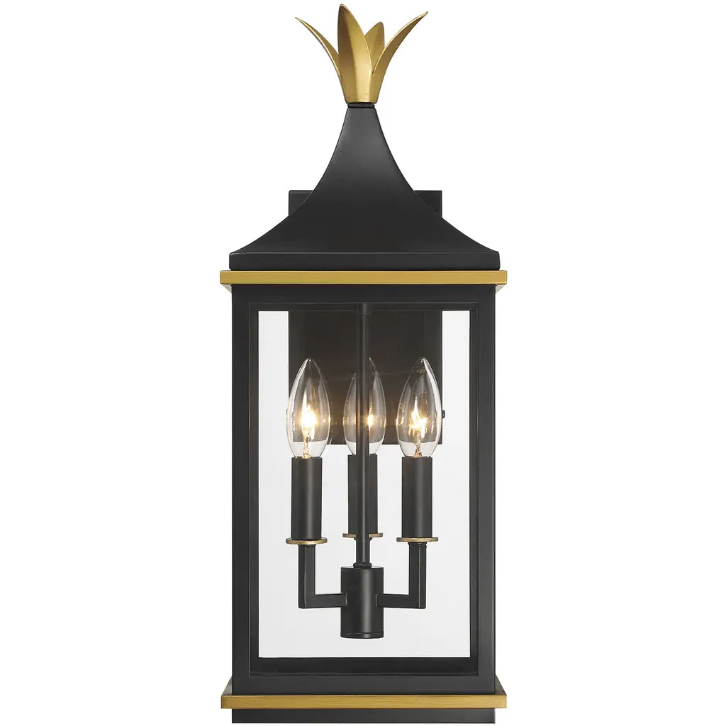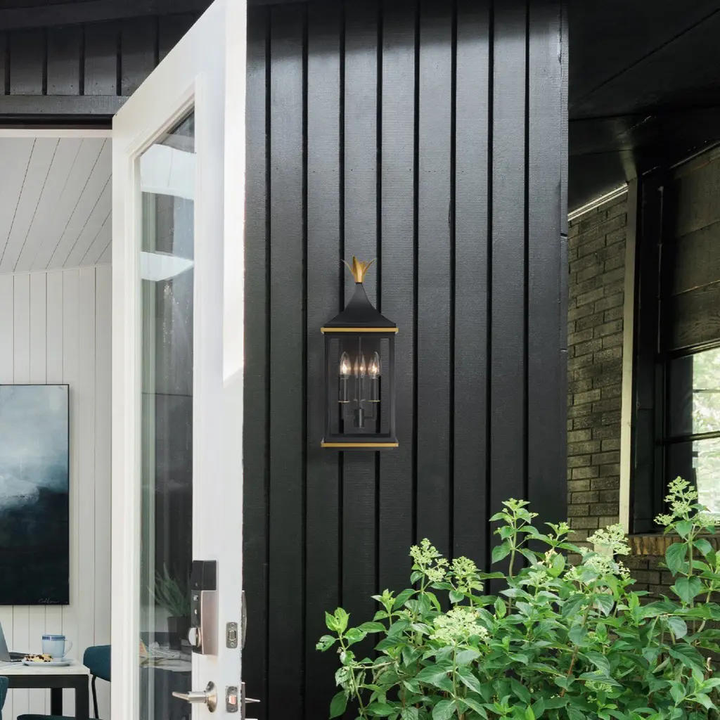 The Simpson Outdoor Collection features a lantern-style design with a two-tone finish. Its elongated rectangular frame, elegant glass panels, and candelabra bulbs create a classic look with a contemporary edge. The collection includes two options for customizing the top: a gold crown cap for a traditional flair or a sleek angled loop for a more contemporary appearance. This versatile design adds a stylish touch to any outdoor setting.
